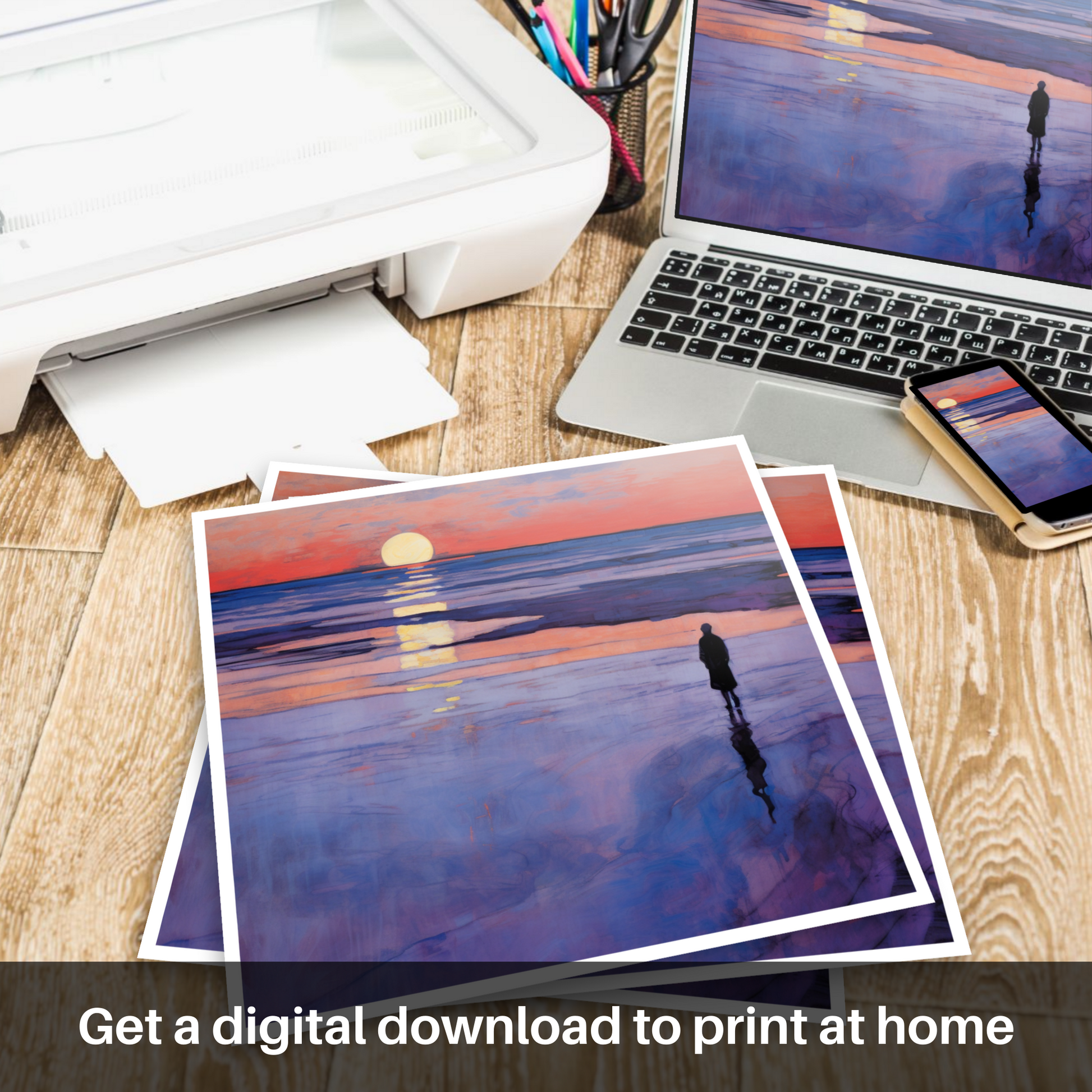 As the sun dips below the horizon, a symphony of colours cascades across the sky and reflects upon the tranquil waters of Nairn Beach. This alluring print captures the serene beauty of the Scottish shoreline at dusk, its palette boasting of warm oranges, rich purples, and cool blues that mingle seamlessly with the descending darkness.