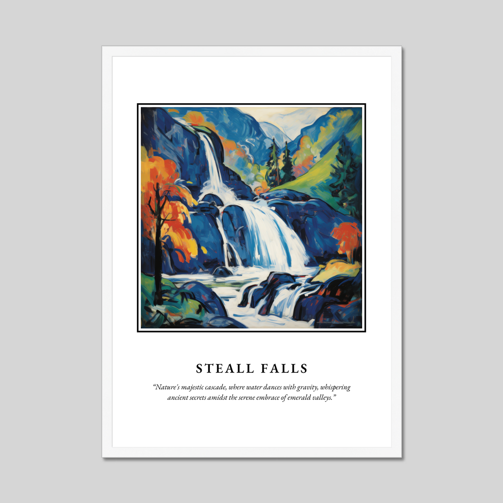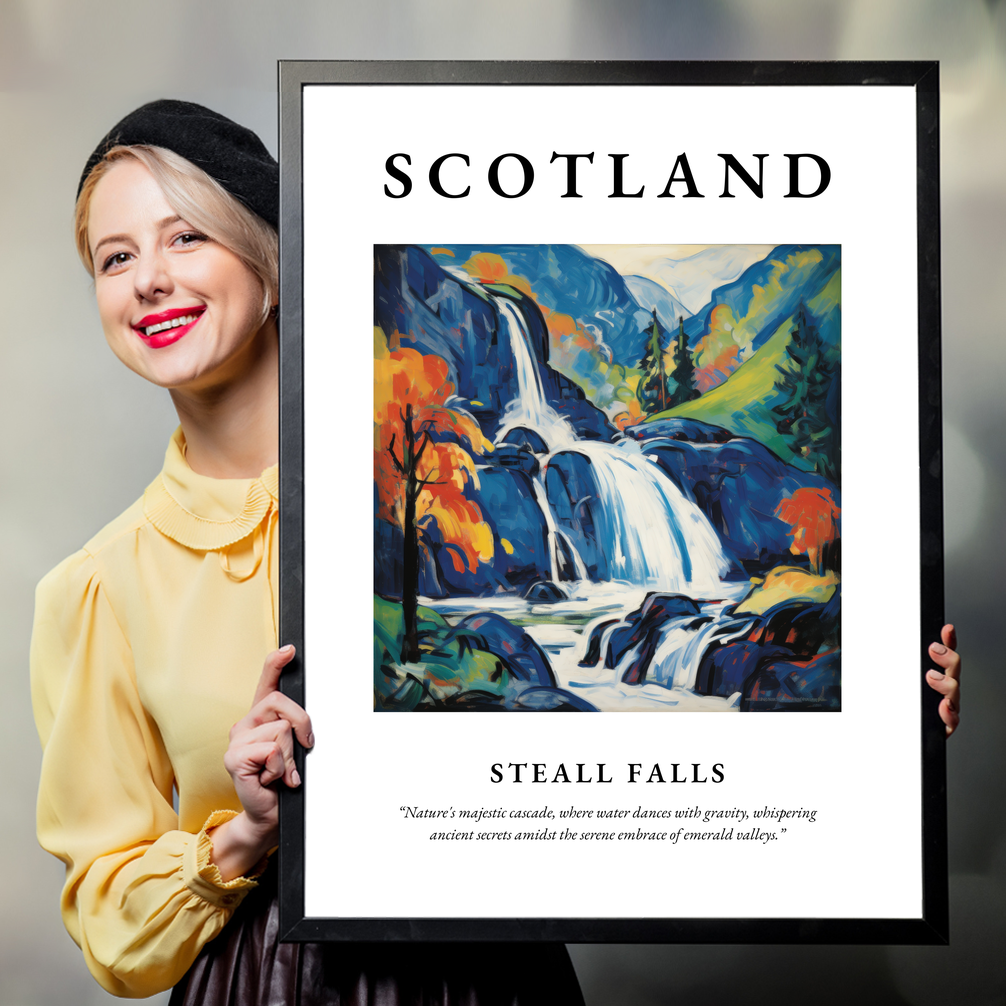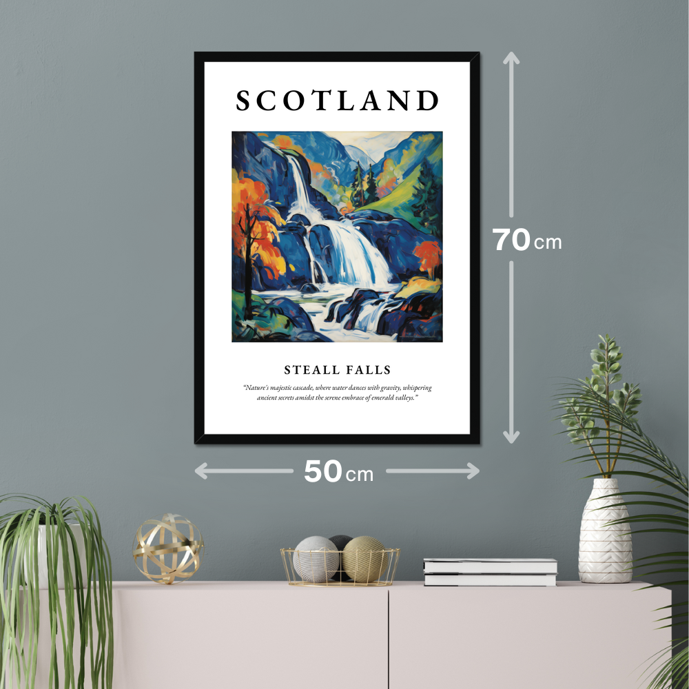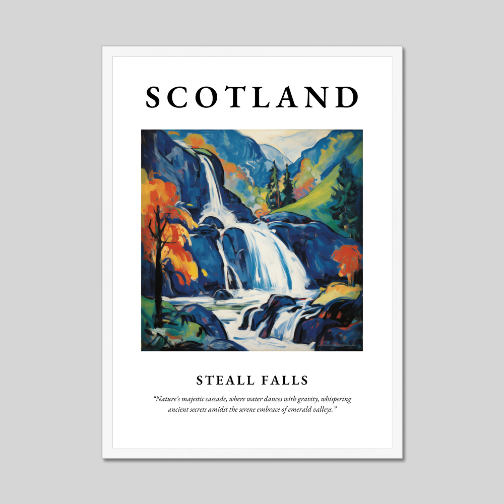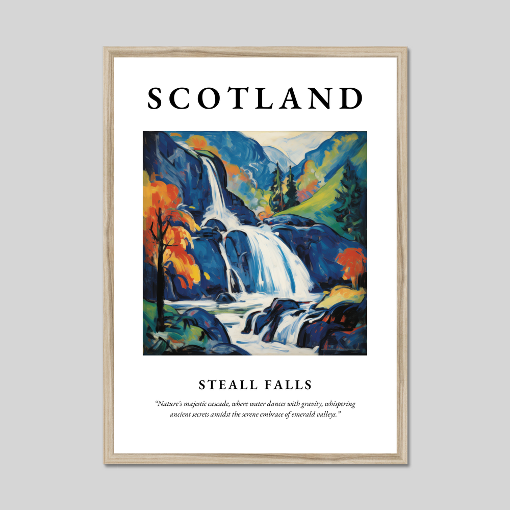 Immerse yourself in the captivating allure of Scotland with our exquisite framed poster print, measuring an impressive 50cm x 70cm. Featuring the iconic word “SCOTLAND” in bold lettering at the top, this art piece is not only a celebration of Scotland's natural beauty but also a striking addition to your living space. Below, a stunning painting of Steall Falls unfolds, capturing the essence of the Highlands in vivid Fauvist style. Beneath the painting, let the poetry of the quote, “Nature's majestic cascade, where water dances with gravity, whispering ancient secrets amidst the serene embrace of emerald valleys,” transport you to a world where nature's wonders are cherished.
