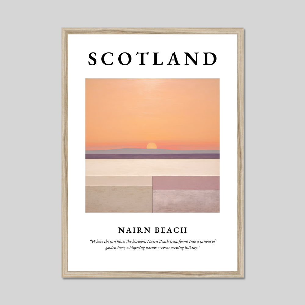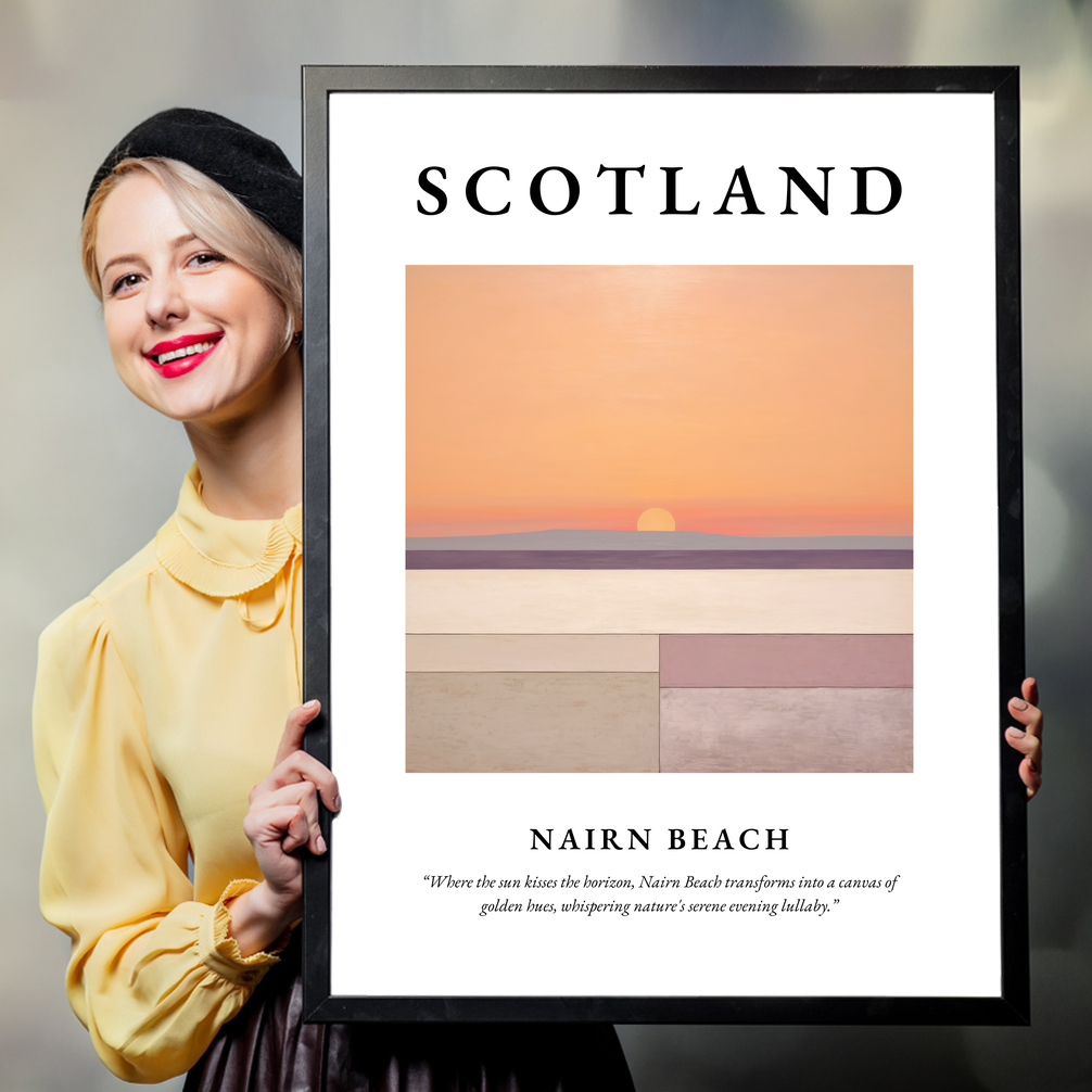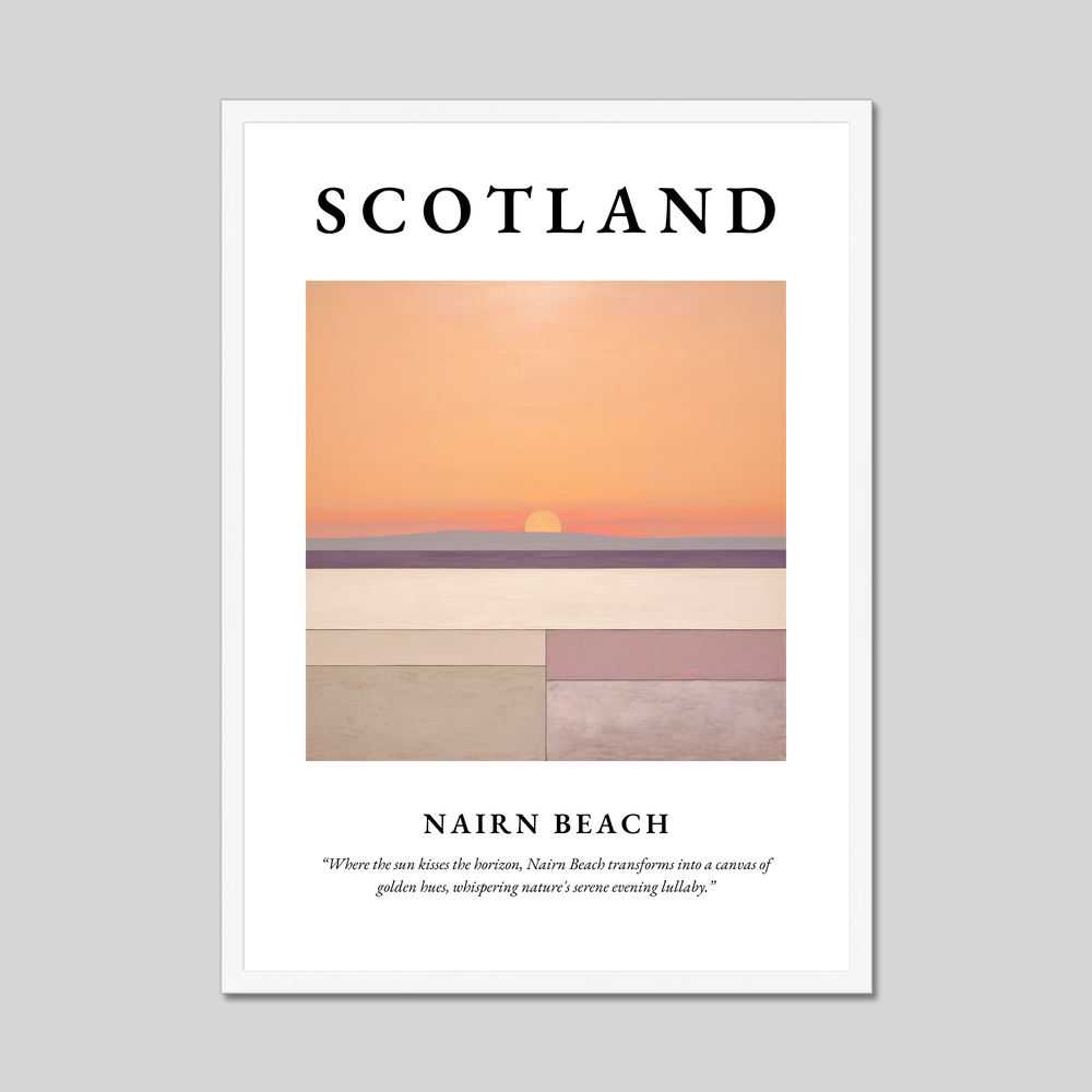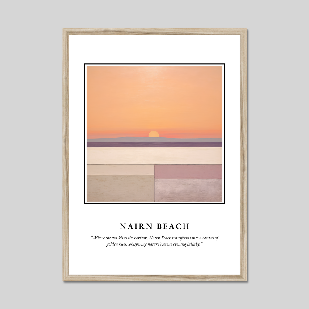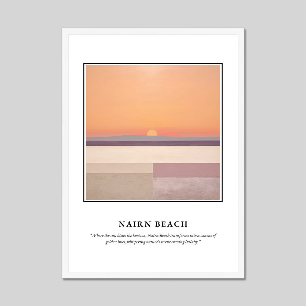 Complementing the artwork is the evocative quote: “Where the sun kisses the horizon, Nairn Beach transforms into a canvas of golden hues, whispering nature's serene evening lullaby.” This sentiment captures the magical transformation that occurs at twilight, making it an outstanding piece for those who cherish the beauty of Nairn Beach or have nostalgic ties to this charming location.