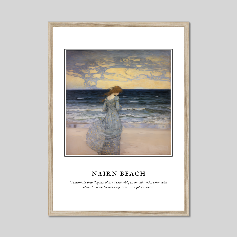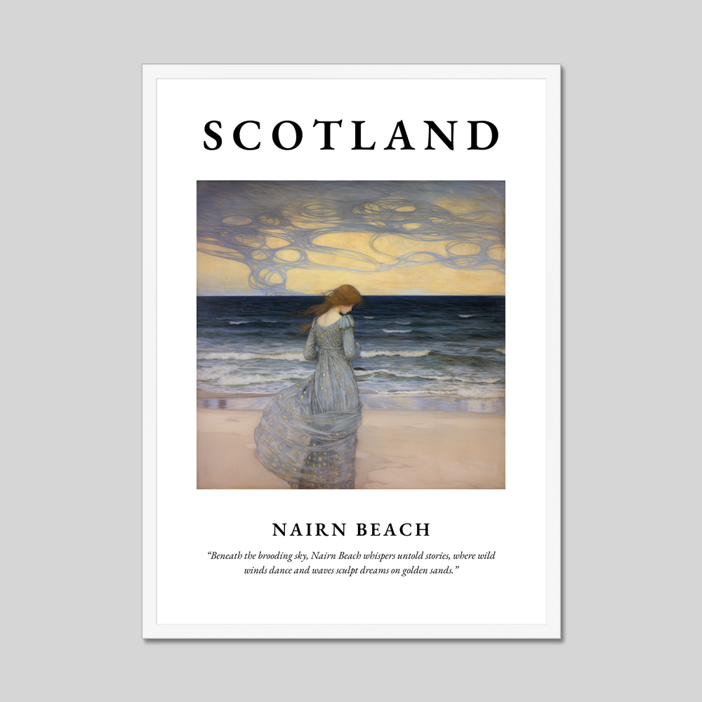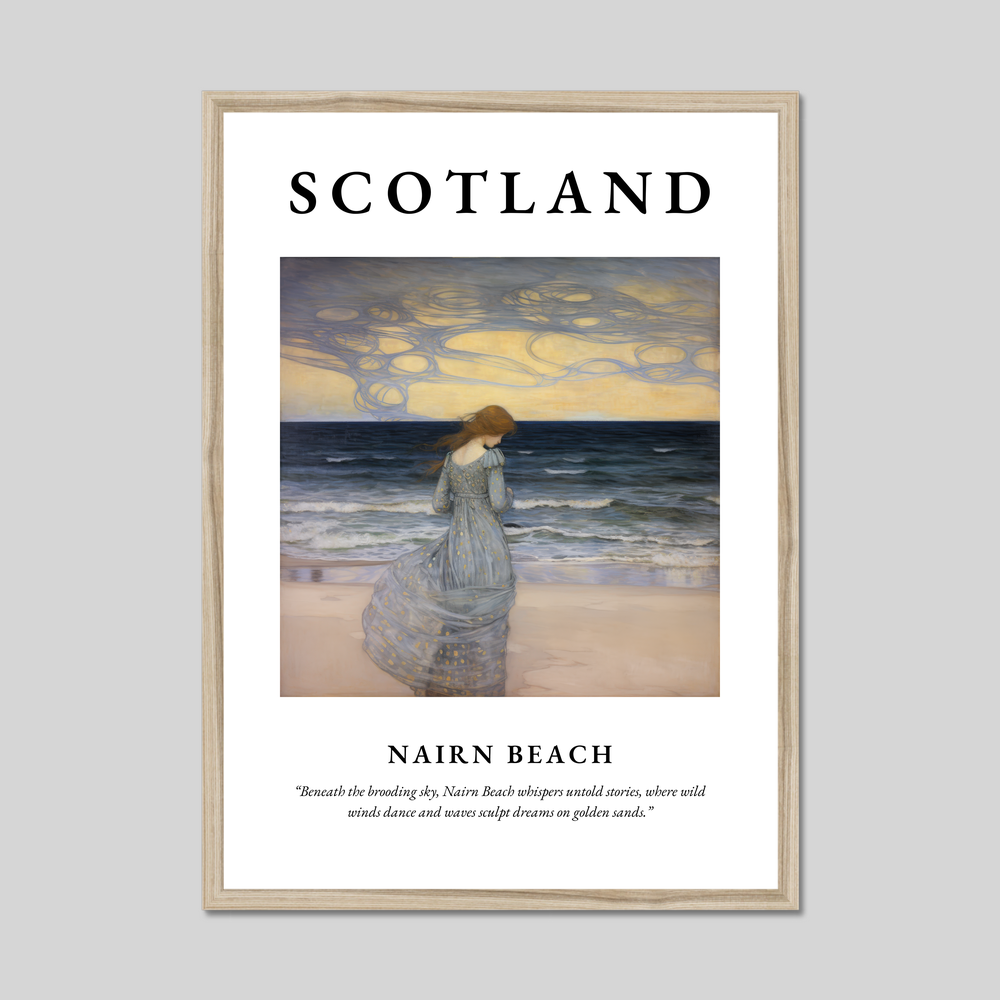 Immerse yourself in the ethereal beauty of Scotland with our large Art Nouveau-style framed poster featuring a captivating vision of Nairn Beach. Measuring an impressive 50cm x 70cm, this art piece is designed to be a stunning centrepiece on your wall, enveloping your space with the timeless allure of Scottish coasts without stretching your budget. Choose from a sophisticated black, elegant white, or rustic natural wood-effect frame to best complement your décor.