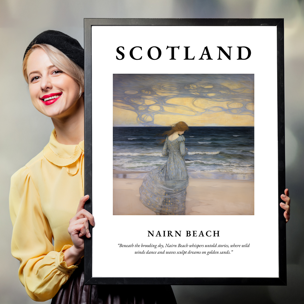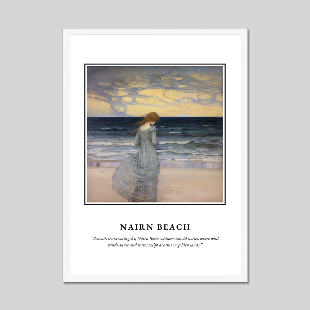 Below the image, the evocative quote, “Beneath the brooding sky, Nairn Beach whispers untold stories, where wild winds dance and waves sculpt dreams on golden sands,” invites you to explore the hidden tales of this enchanting locale. This piece is not only perfect for those who have an affinity with Nairn, but also for any art lover who appreciates the dreamy intricacies of the Art Nouveau style.