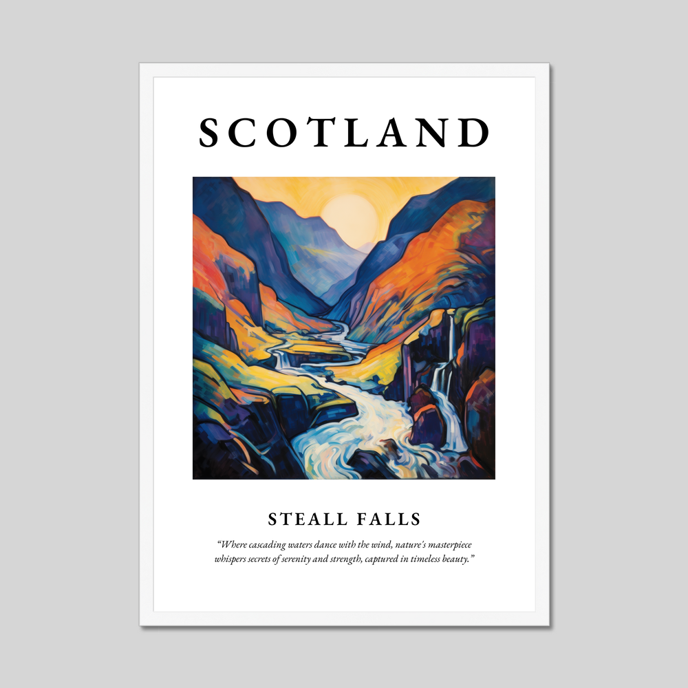 The poster features “SCOTLAND” boldly emblazoned across the top, leading the eye to a mesmerising Fauvism painting of Steall Falls. Known for its vibrant colours and expressive brushwork, Fauvism breaths life into the scene, with vivid hues that portray the powerful contrast of cascading waters against the dramatic Scottish terrain. Below the painting, the inscription reads, “Where cascading waters dance with the wind, nature's masterpiece whispers secrets of serenity and strength, captured in timeless beauty,” evoking a sense of tranquillity and awe.