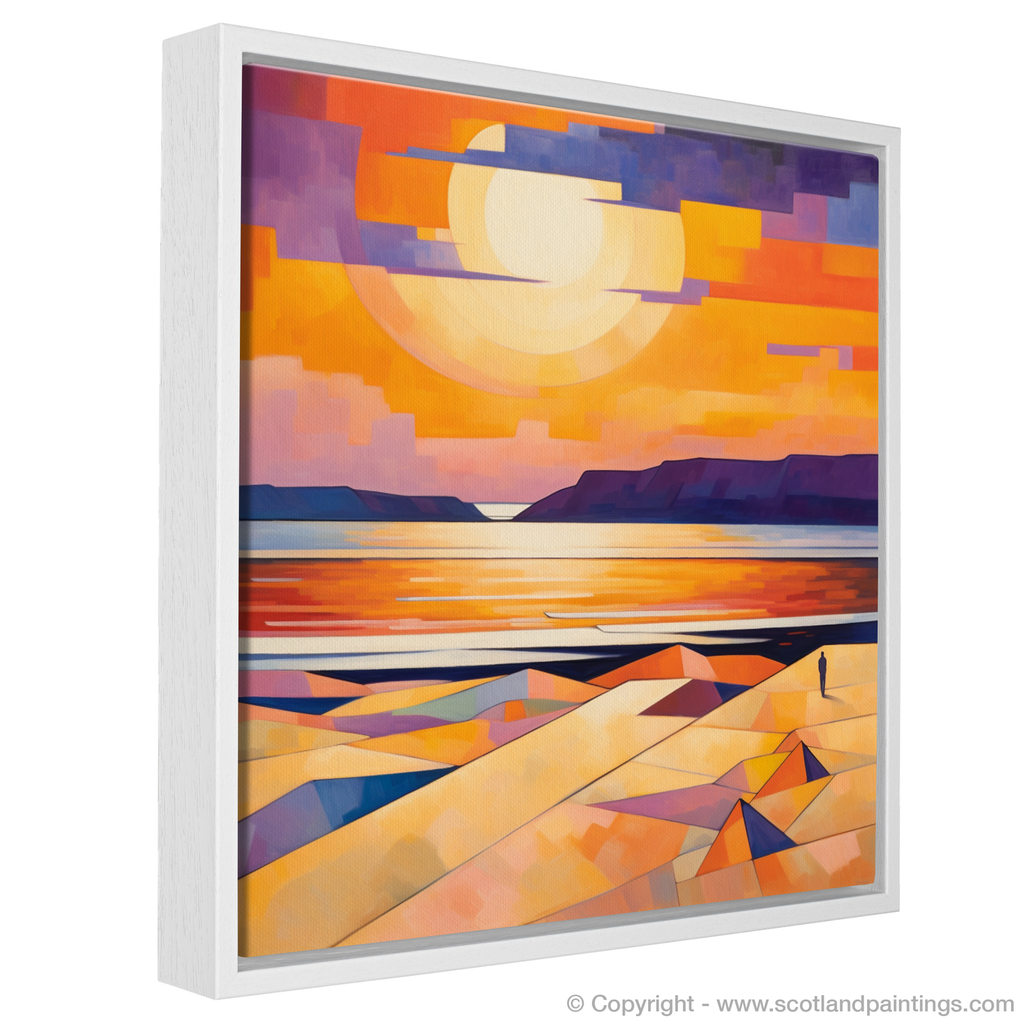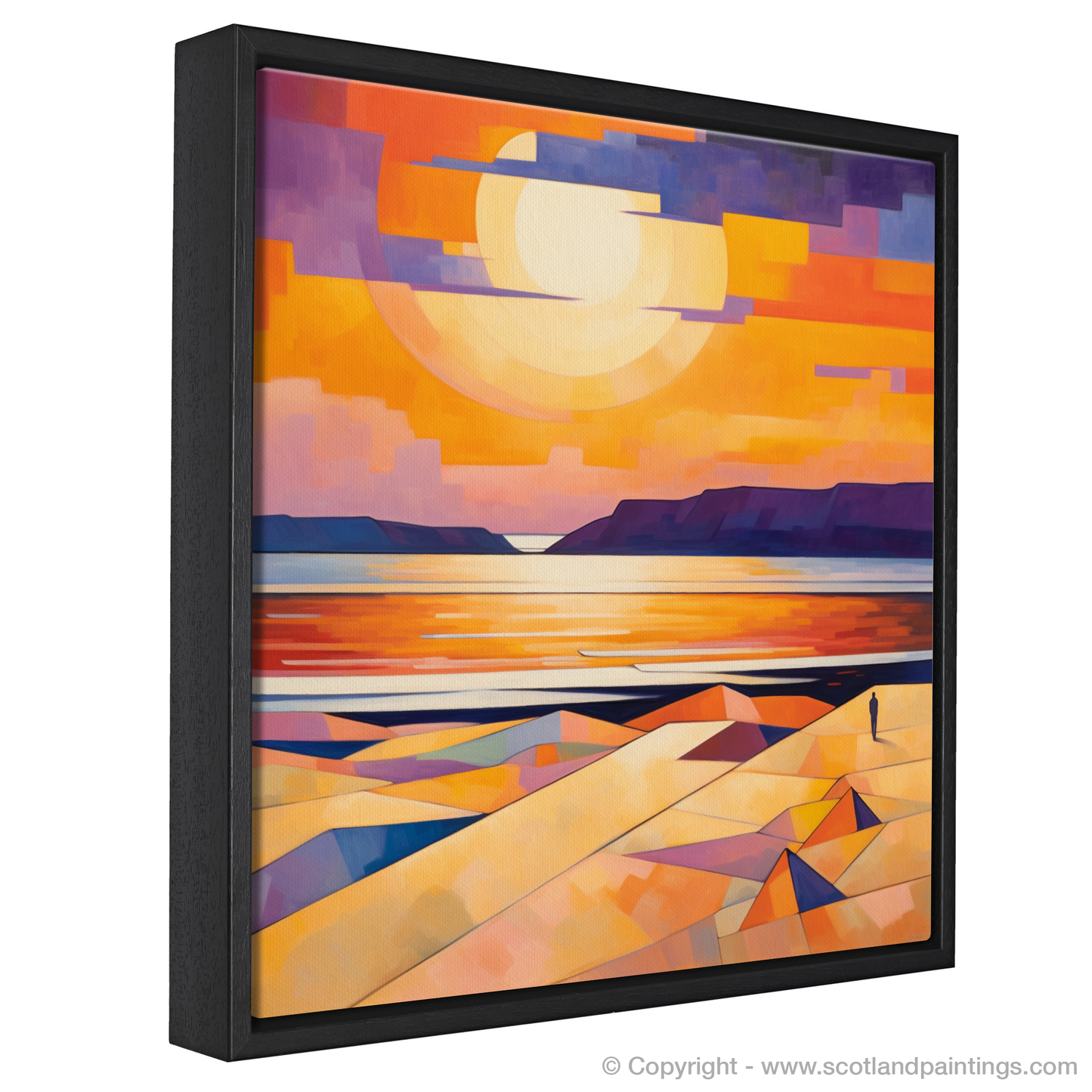 Captivating in composition and vibrant in colour, this resplendent abstract piece captures the essence of Nairn Beach bathed in the warm glow of golden hour. With swathes of rich oranges, purples, and yellows, the print reflects the dynamic skies of a sunset, whilst the cool blues and purples hint at the encroaching dusk.