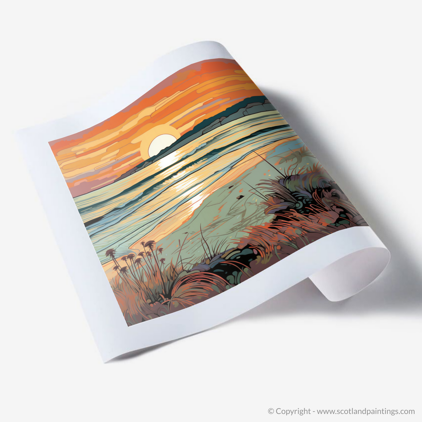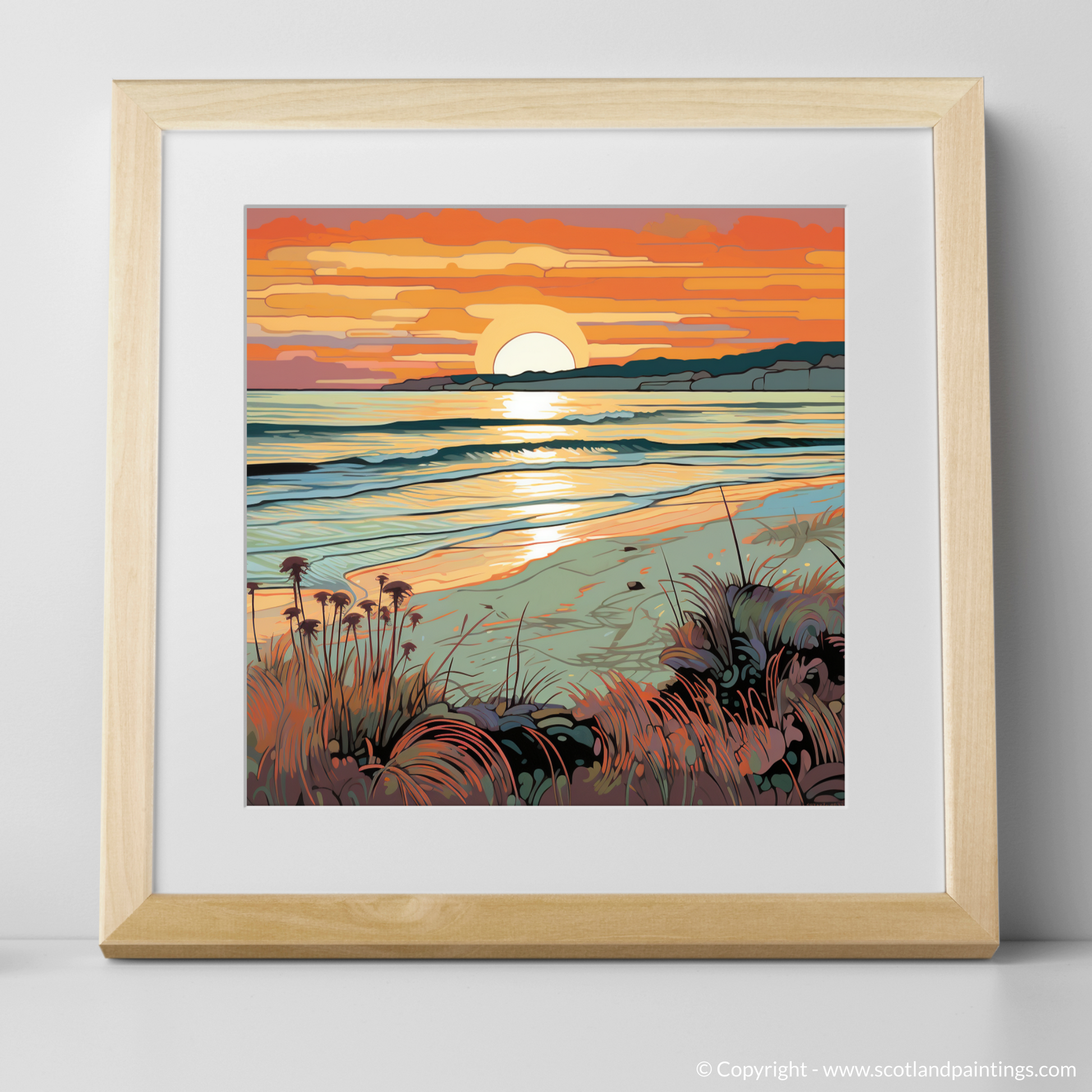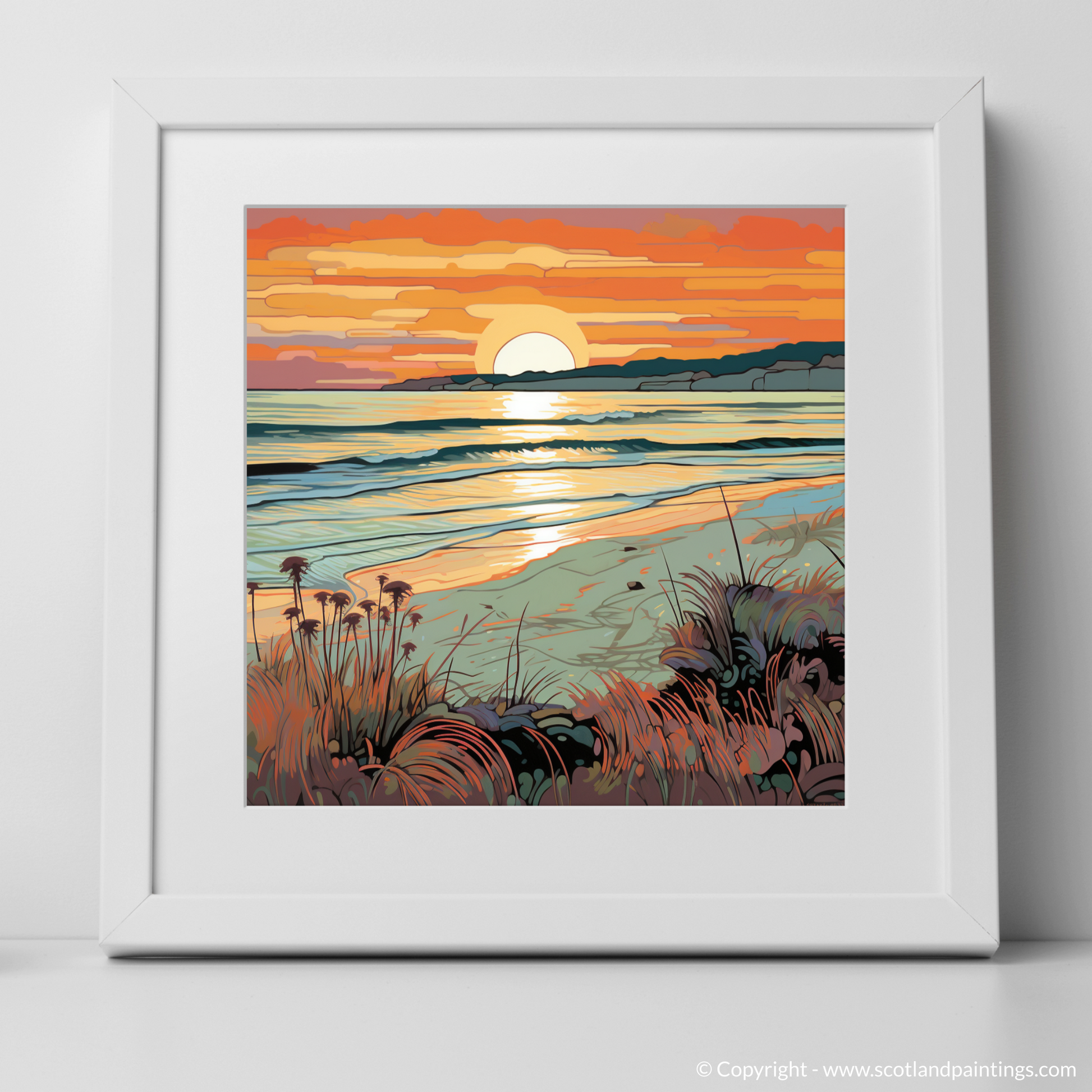 As the daylight fades and the Scottish sky takes on a tapestry of warmth, this enchanting print captures the serene beauty of Nairn Beach at the waning of the day. Fluid lines flow throughout the scene with a nod to the Art Nouveau movement, their elegant curves mirroring the undulating waves and gentle mounds of sand. The sun dips towards the horizon in a spectacle of honeyed amber and coral hues, casting a shimmering path of light across the rippling sea.