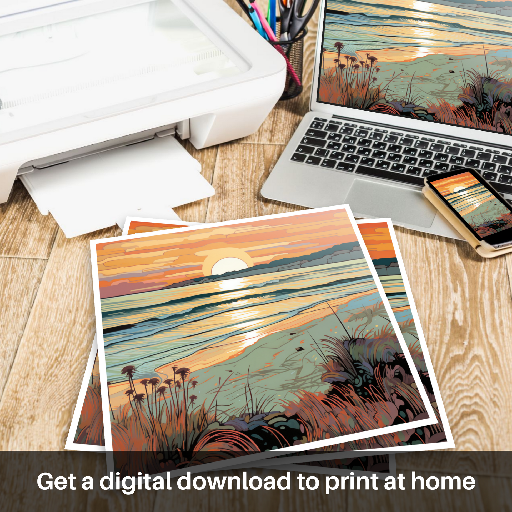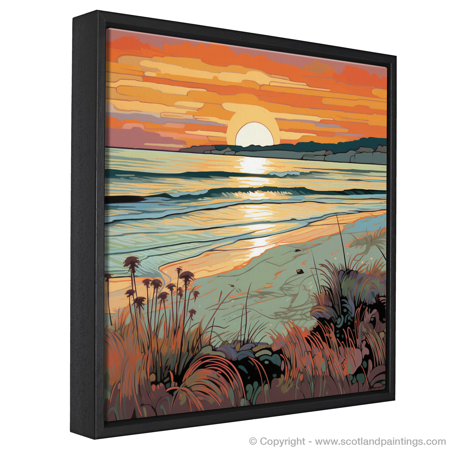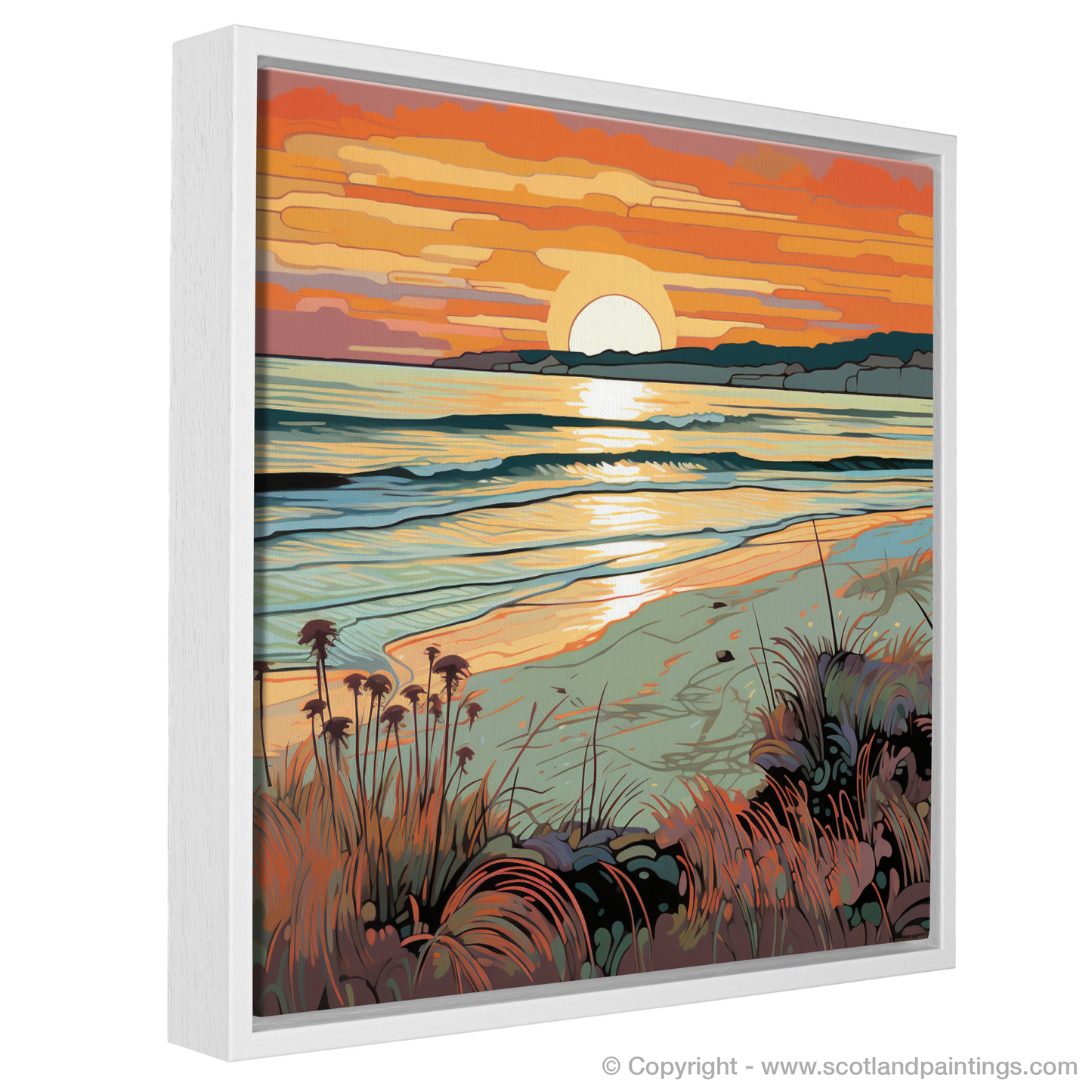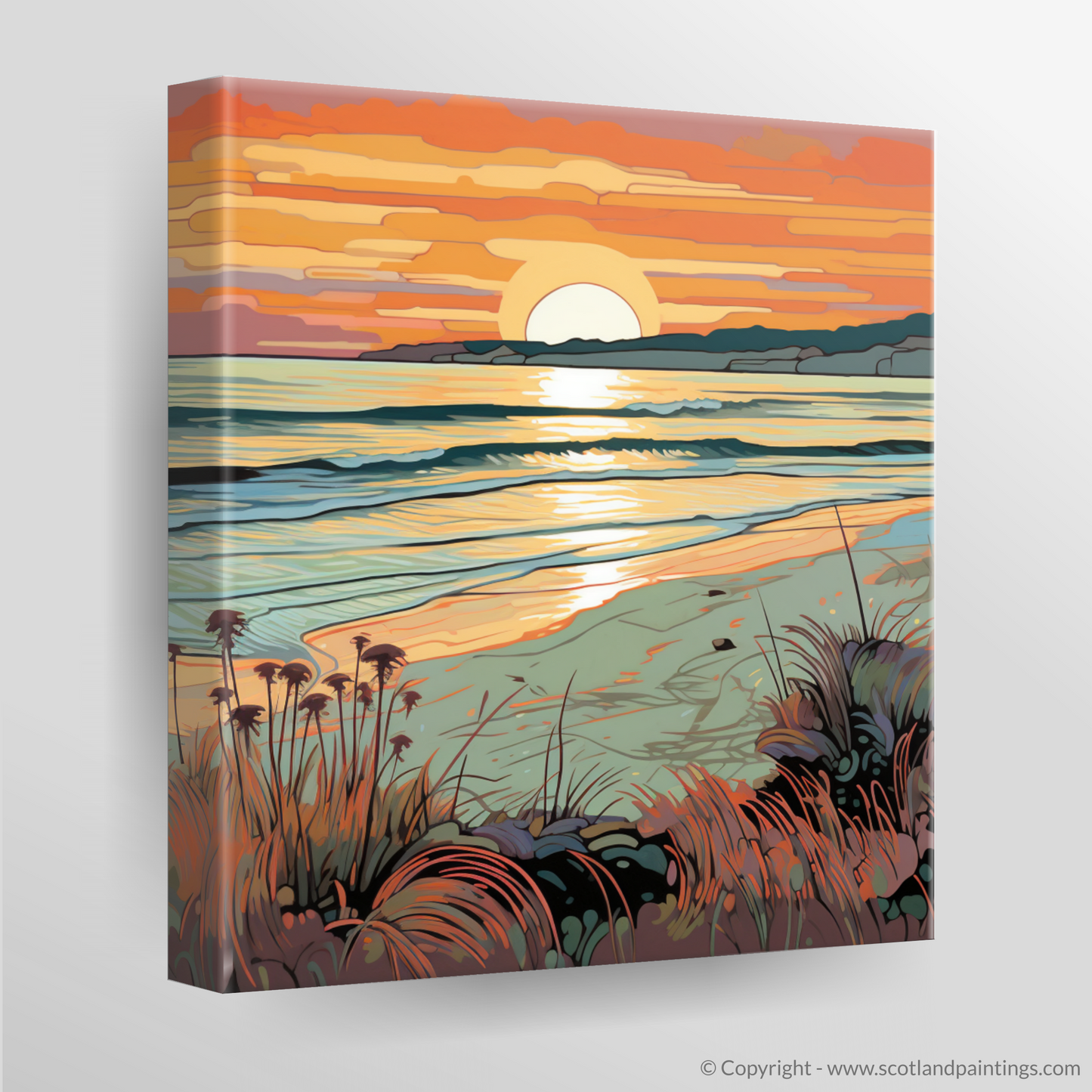 As the daylight fades and the Scottish sky takes on a tapestry of warmth, this enchanting print captures the serene beauty of Nairn Beach at the waning of the day. Fluid lines flow throughout the scene with a nod to the Art Nouveau movement, their elegant curves mirroring the undulating waves and gentle mounds of sand. The sun dips towards the horizon in a spectacle of honeyed amber and coral hues, casting a shimmering path of light across the rippling sea.