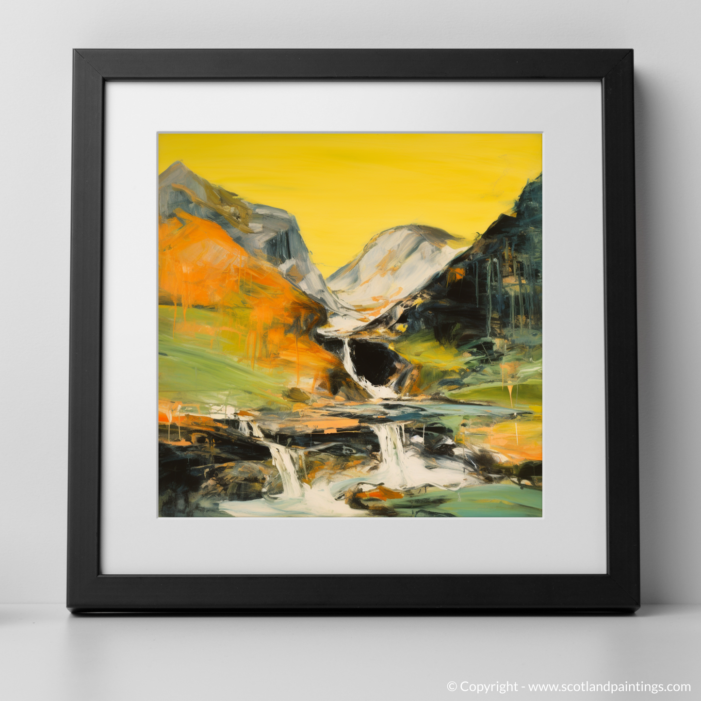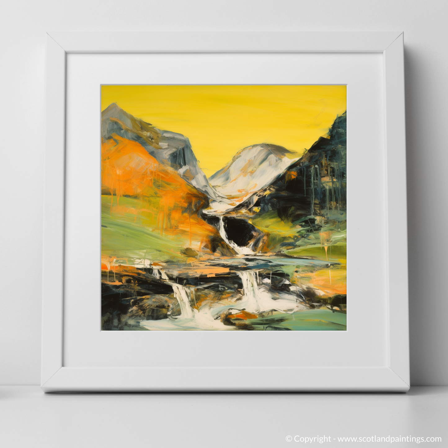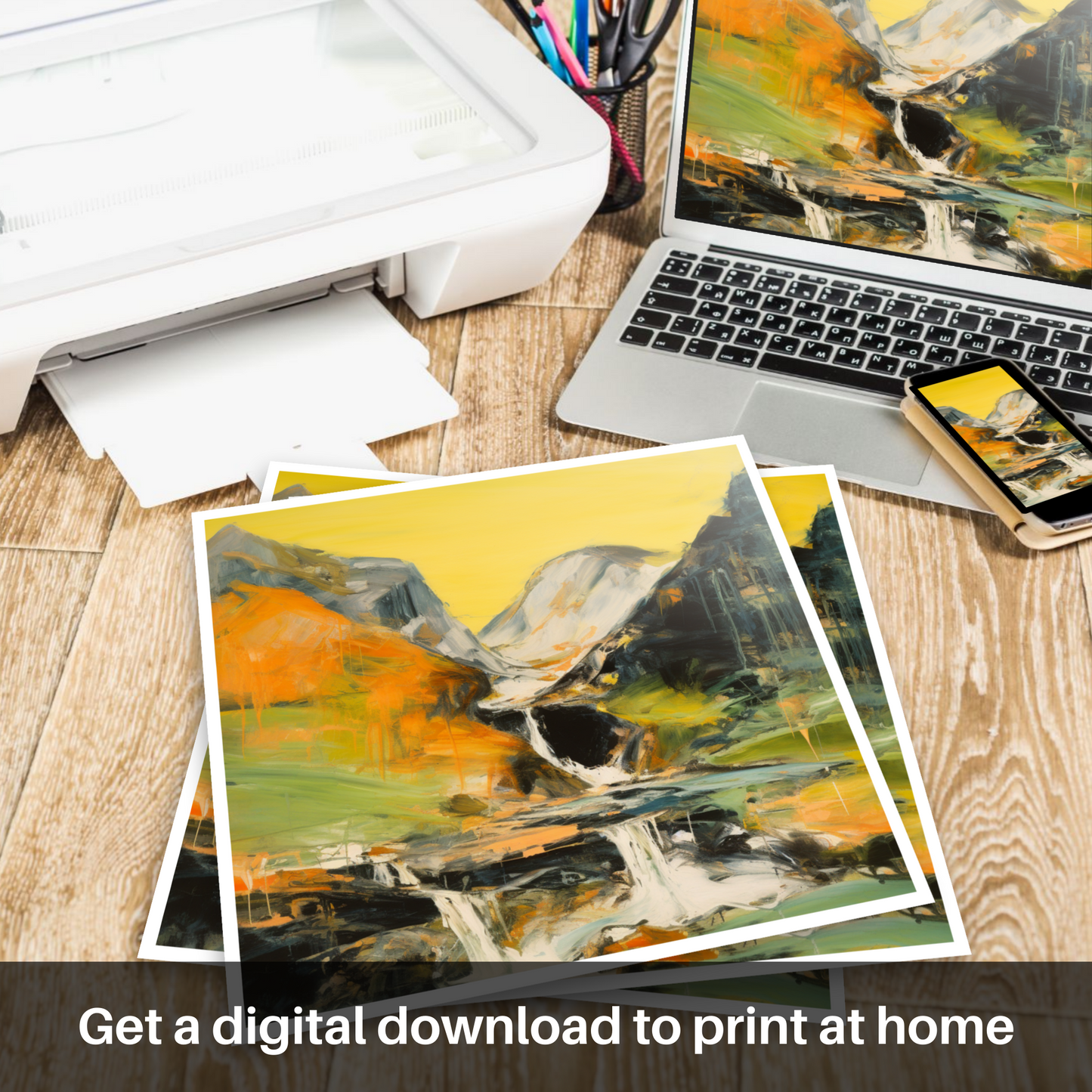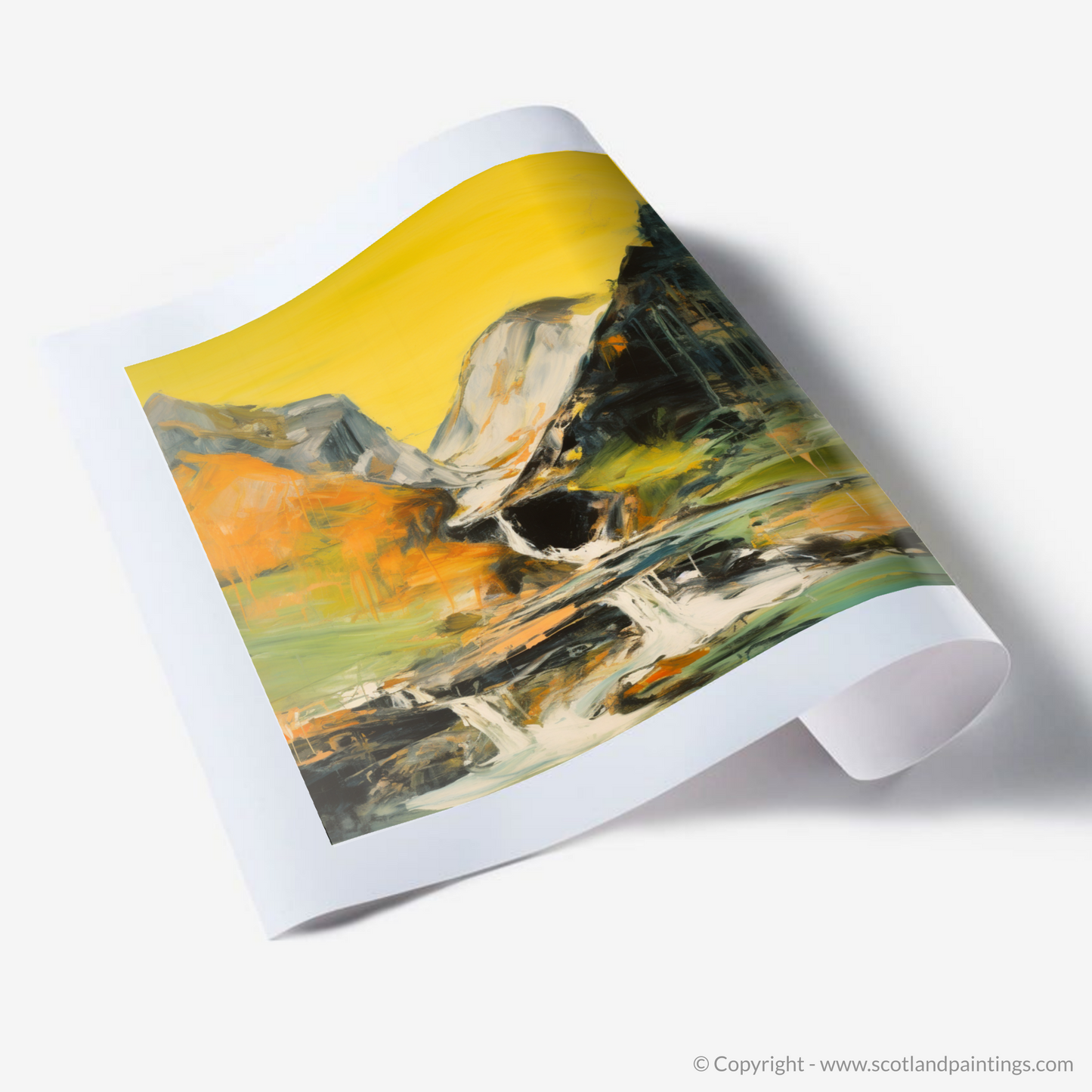Evoke the raw emotion of nature with this captivating abstract expressionist interpretation of the majestic Steall Falls in Glen Nevis. The print captures the essence of the Scottish wilderness through its vibrant palette and dynamic brushwork. A lush marriage of ochre, orange, and verdant tones merges with stark white cascades, creating an image that is as turbulent and spirited as the falls themselves.