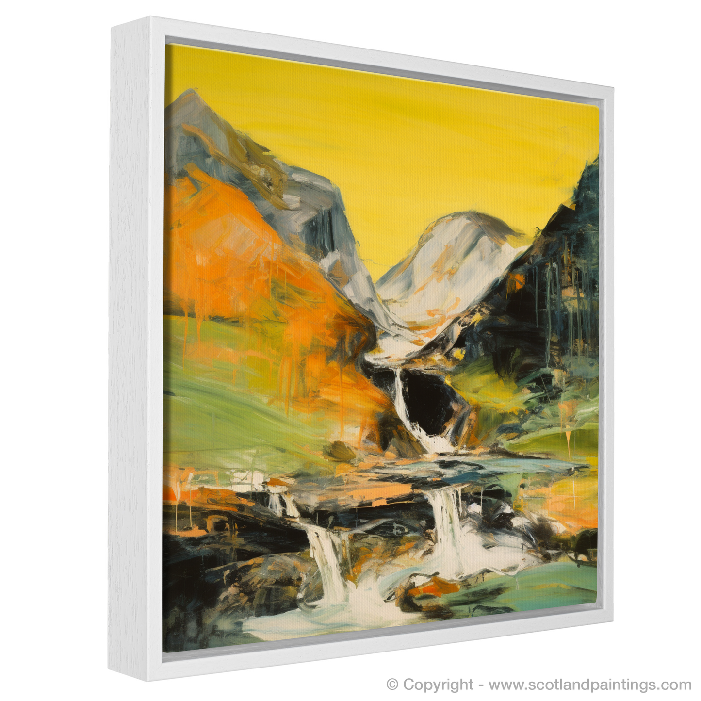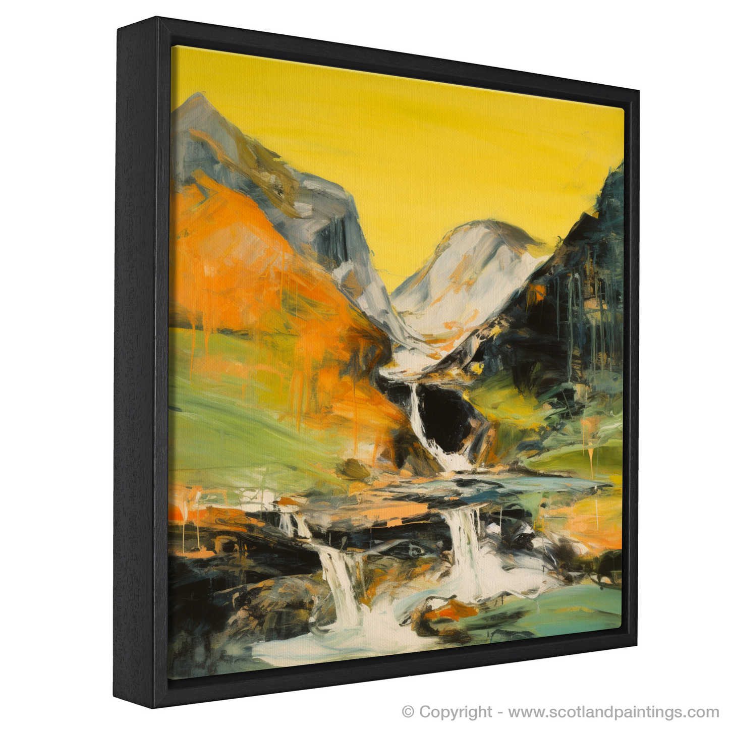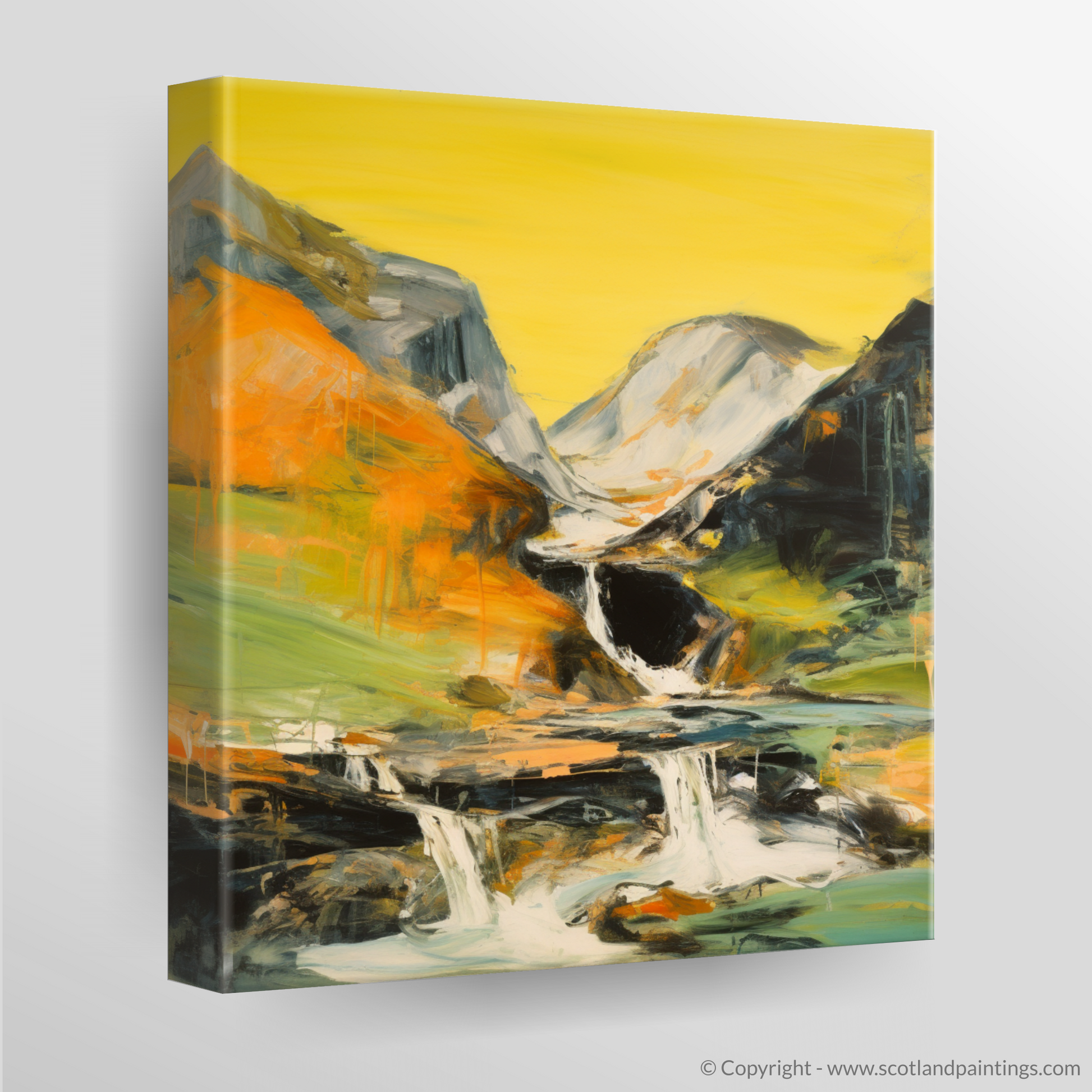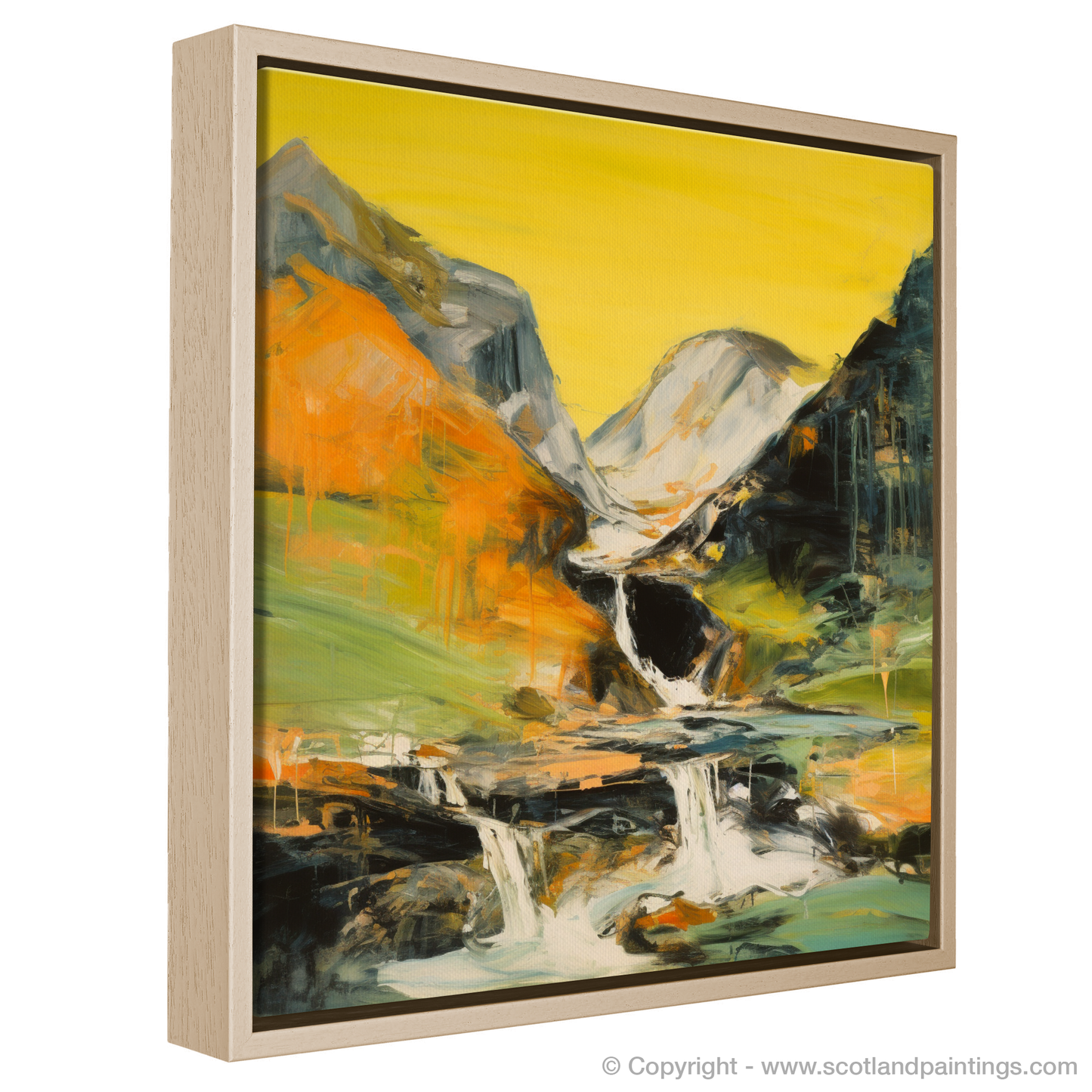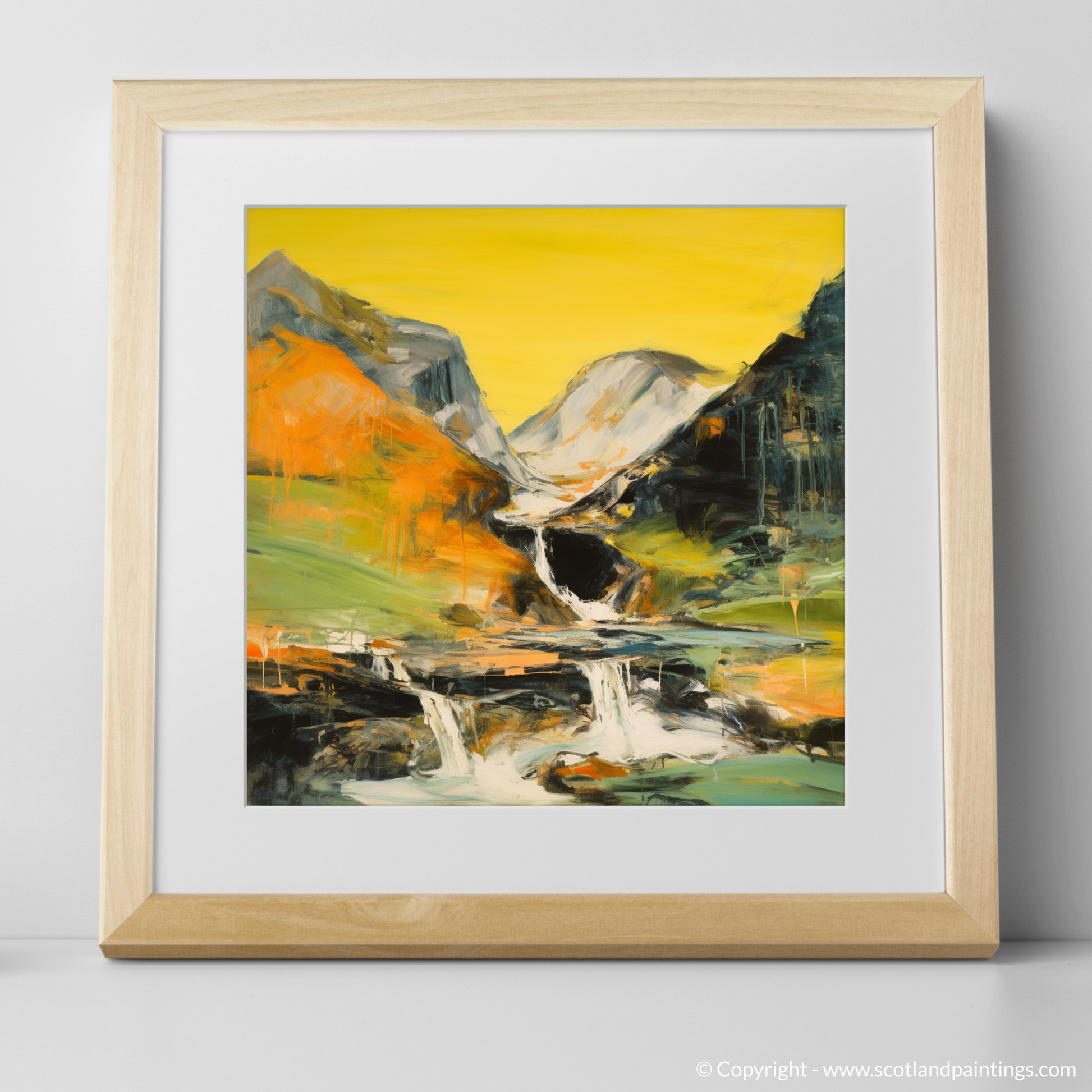 Evoke the raw emotion of nature with this captivating abstract expressionist interpretation of the majestic Steall Falls in Glen Nevis. The print captures the essence of the Scottish wilderness through its vibrant palette and dynamic brushwork. A lush marriage of ochre, orange, and verdant tones merges with stark white cascades, creating an image that is as turbulent and spirited as the falls themselves.