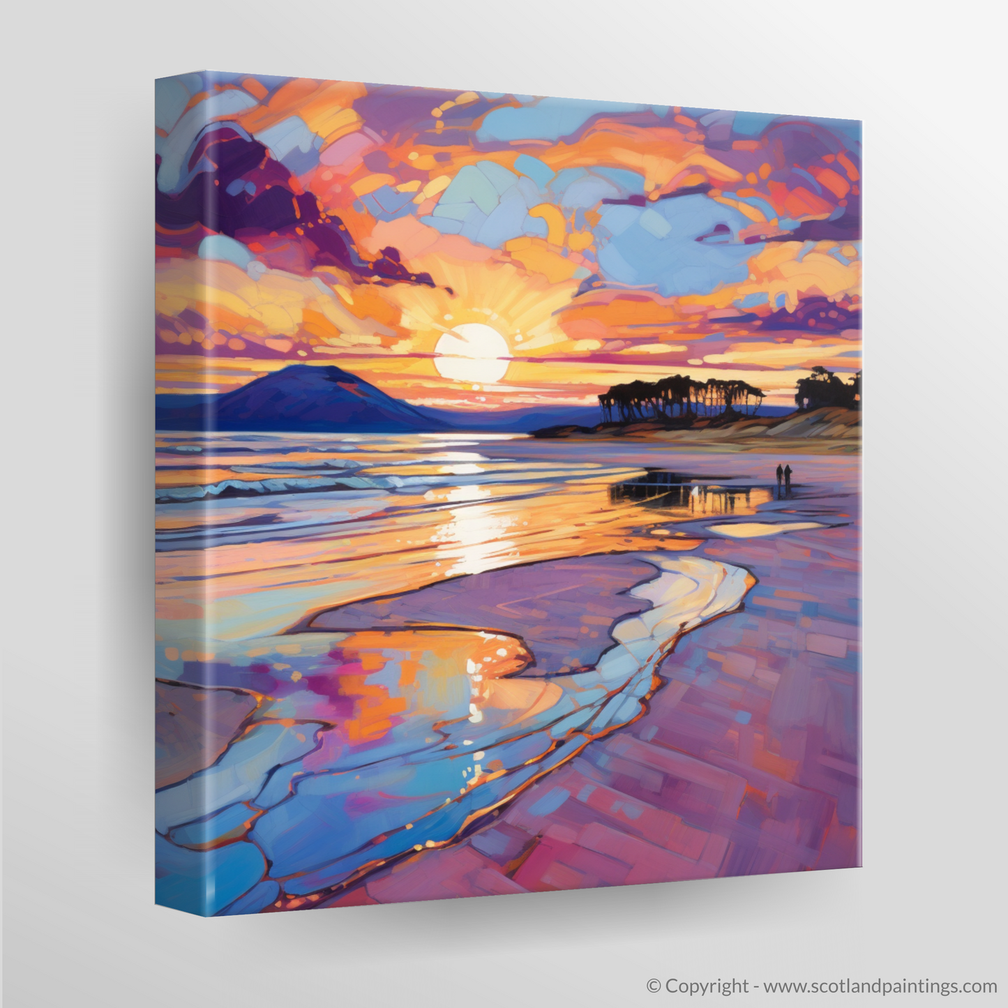 The enchanting canvas is awash with a kaleidoscope of warm oranges, deep purples, and soothing blues that blend together in a bold, modern impressionist style, echoing the dramatic yet peaceful end to a day. The setting sun dips low on the horizon, its fiery orb casting a path of golden light across the rippling tide, creating a natural guide for the eye to follow the breathtaking landscapes.