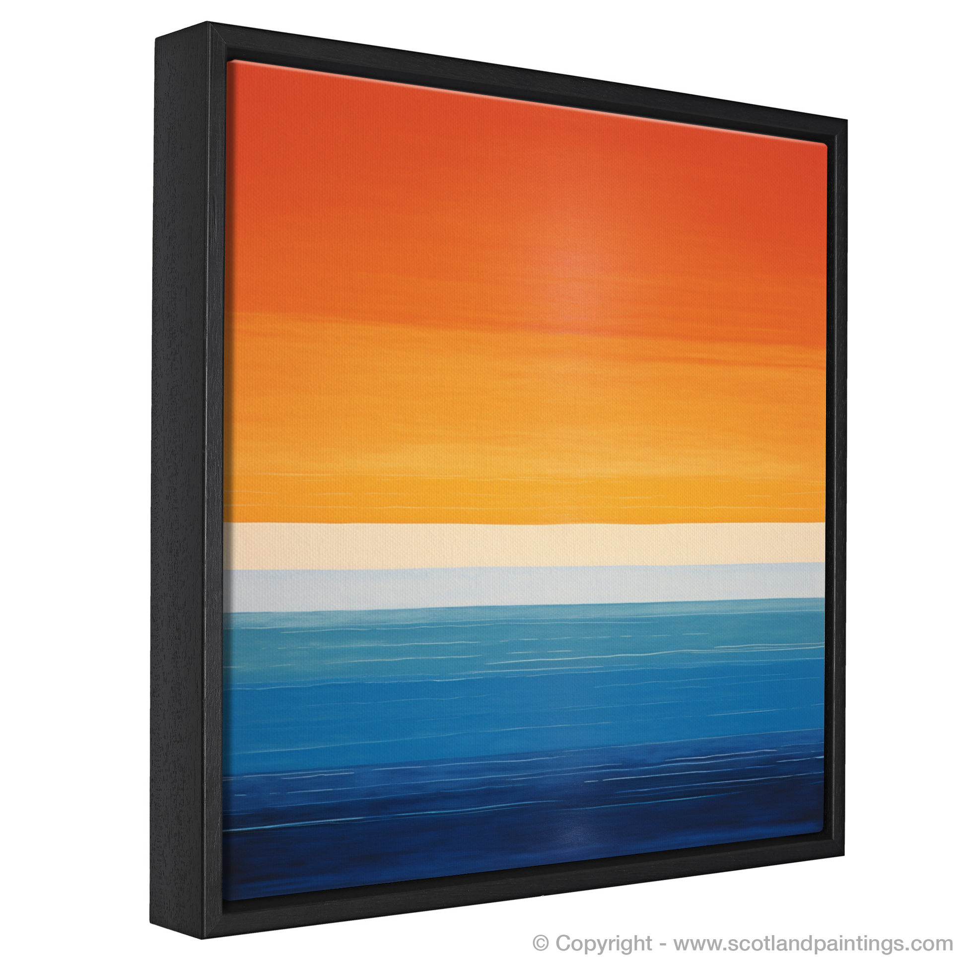 A vivid, fiery palette dominates the upper section of the artwork, invoking the intense radiance of the setting sun as it dips below the horizon. The interplay of oranges and reds transitions smoothly, mimicking the sky's natural gradient during the magical twilight hour. This warm chromatic spectacle represents the sky's transformative journey at day's end, speaking to the viewer's sense of contemplation and calm.
