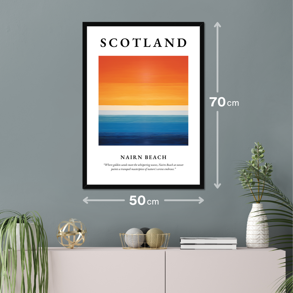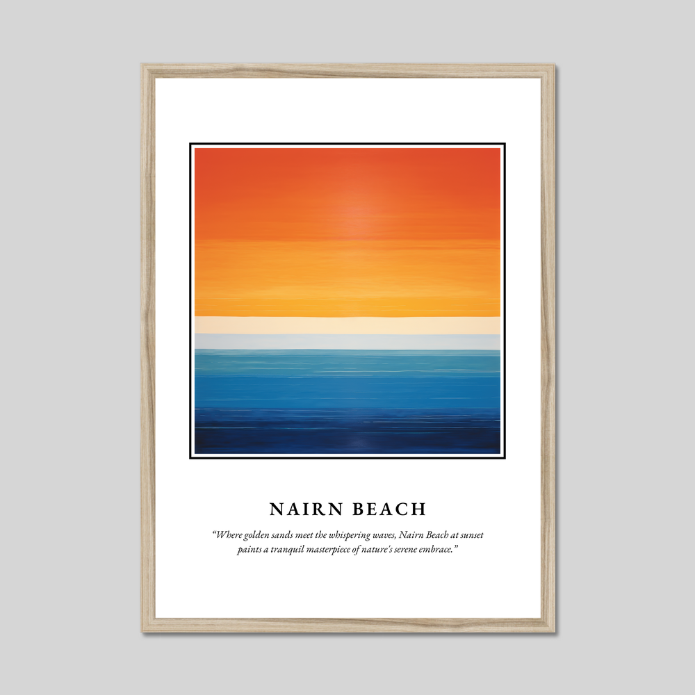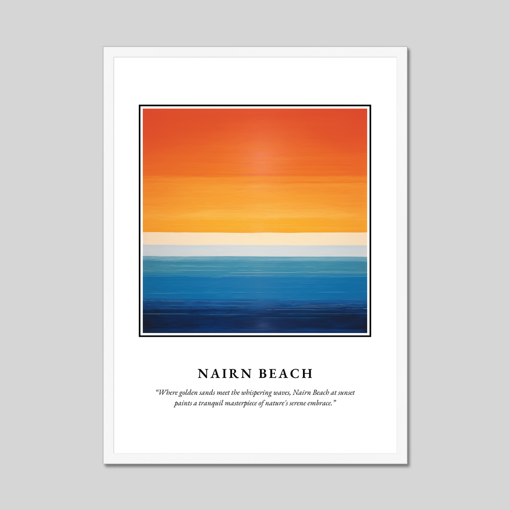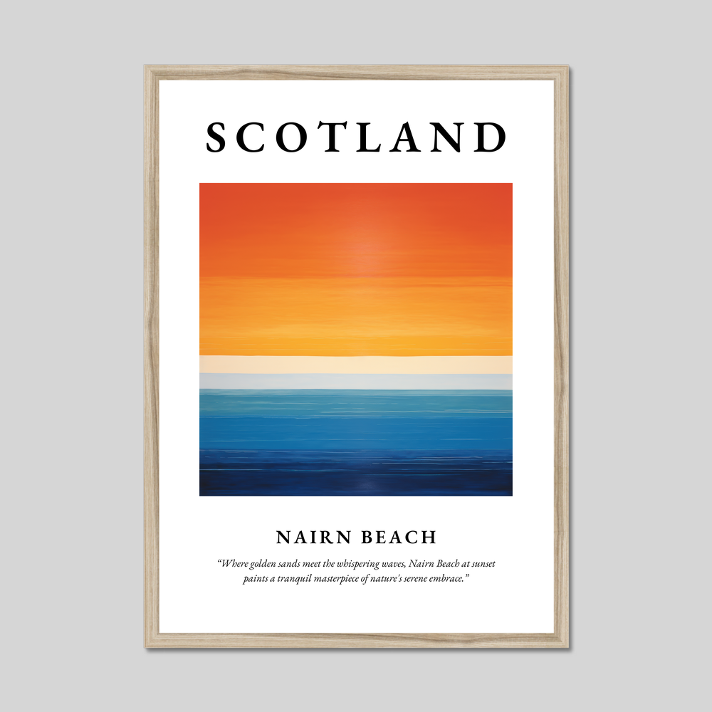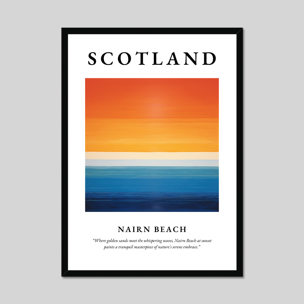 Positioned above the artwork in bold lettering is "SCOTLAND," a nod to the majesty of this remarkable country. Below, the evocative quote, "Where golden sands meet the whispering waves, Nairn Beach at sunset paints a tranquil masterpiece of nature's serene embrace," encapsulates the serene allure and poetic beauty of this landscape.