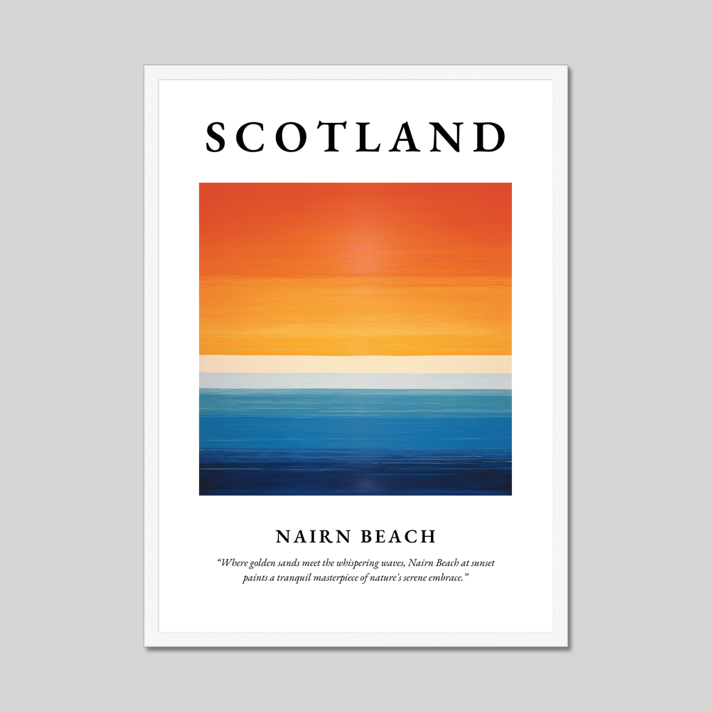 Nairn Beach, located on Scotland's idyllic northeast coast, is renowned for its sweeping vistas and radiant sunsets. This tranquil haven is more than just a beach; it's a place where nature's palette comes alive, reflected vividly in our poster’s depiction. As you gaze upon this art piece, you’re reminded of lazy afternoons spent exploring its shores, the salty sea breeze in your hair, and the gentle lull of the ocean lapping against the sands.