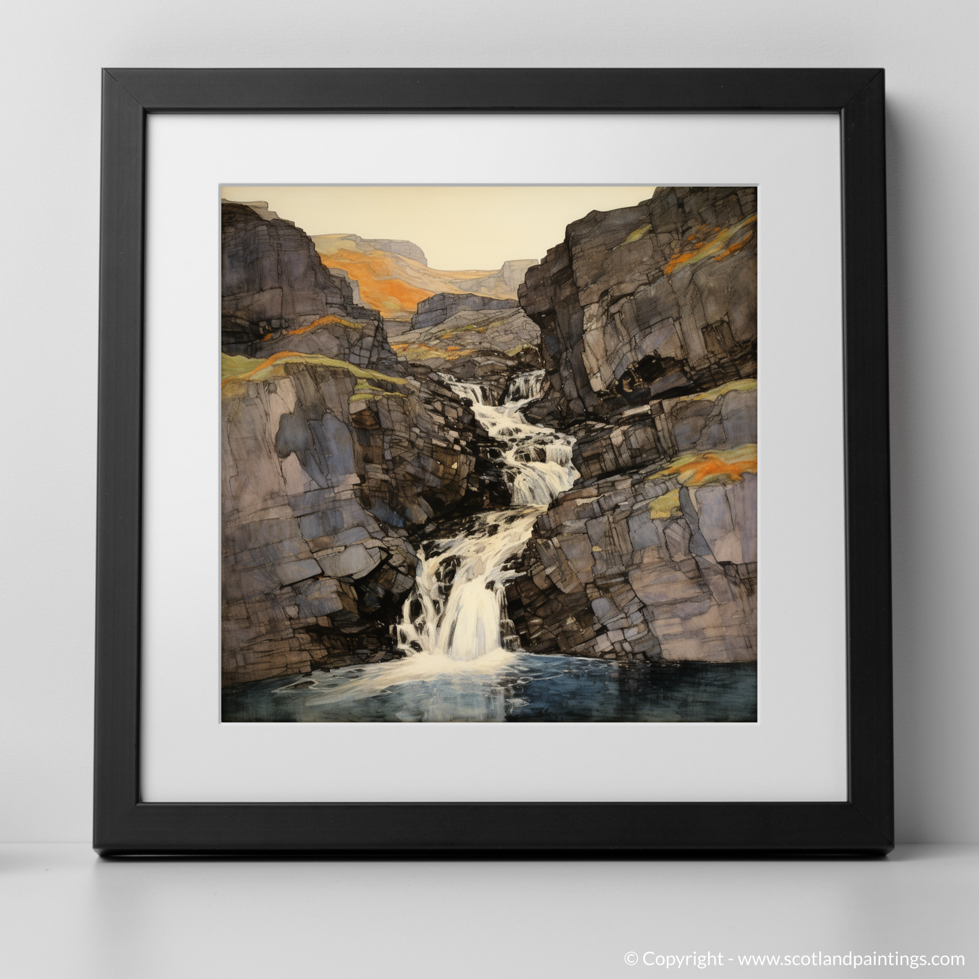 Capturing the raw beauty and dramatic atmosphere of the Isle of Skye, this exquisite print brings to life the enchanting Mealt Falls, known for its rugged charm and tranquil power. Rendered in a style reminiscent of Art Nouveau, the graceful curves and flowing lines harmonise with natural forms, creating an alluring synergy between subject and style.