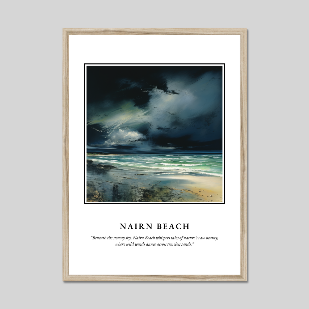 Underneath the painting, the evocative quote, “Beneath the stormy sky, Nairn Beach whispers tales of nature's raw beauty, where wild winds dance across timeless sands,” encapsulates the spirit of the artwork and the natural wonder it represents. Ideal for those who have visited Nairn or hold a personal connection with the Scottish landscape, this poster also appeals to art lovers and admirers of surrealism.