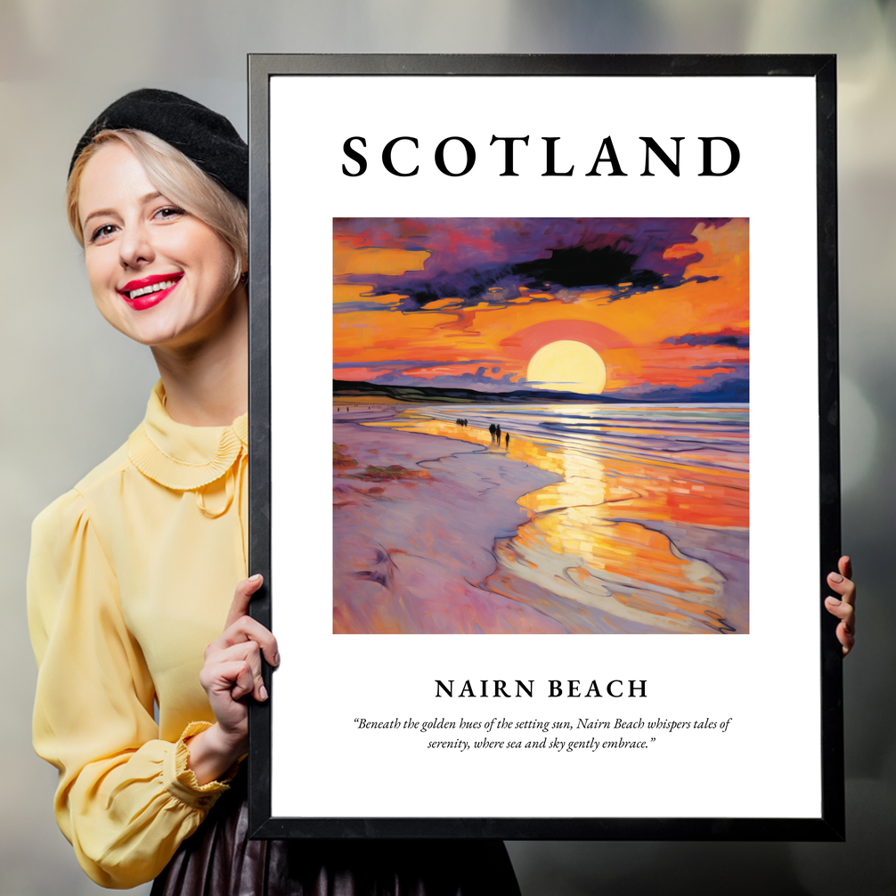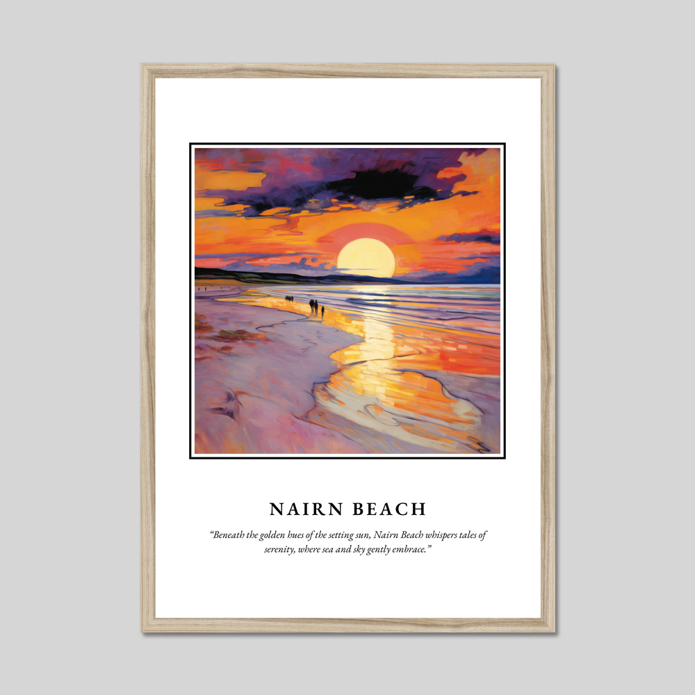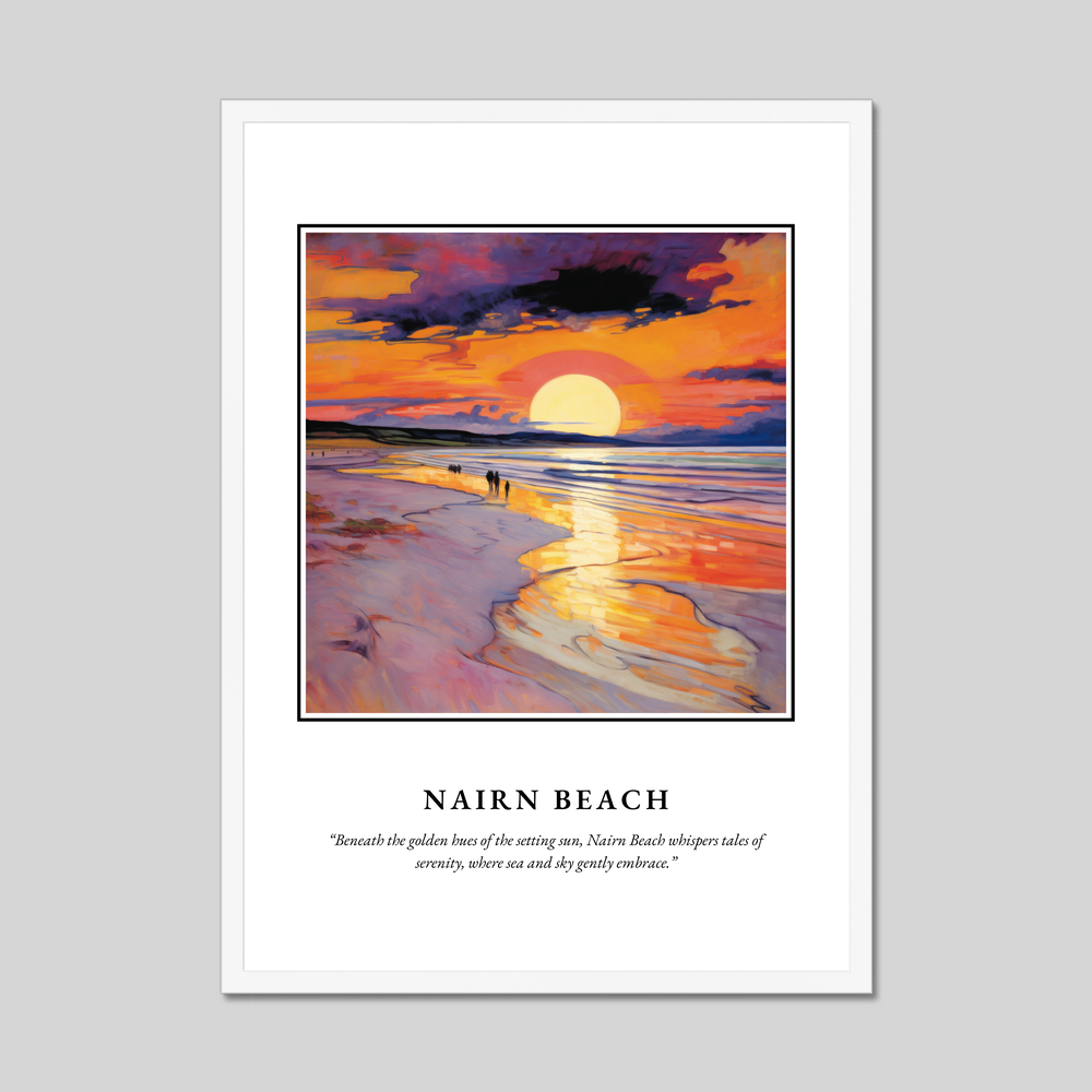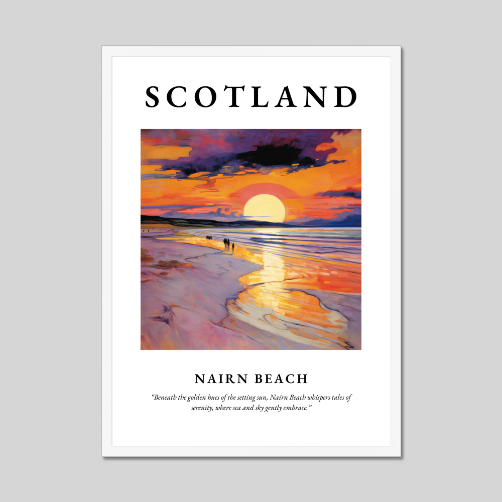 Available in your choice of a sleek black, chic white, or warm natural wood-effect frame, this poster is as versatile as it is enchanting. The layout commands attention with "SCOTLAND" in bold lettering overhead, drawing the eye to the heart of the piece: an abstract portrayal of Nairn Beach. Below, the evocative quote, “Beneath the golden hues of the setting sun, Nairn Beach whispers tales of serenity, where sea and sky gently embrace,” perfectly encapsulates the dreamy essence of this serene location.