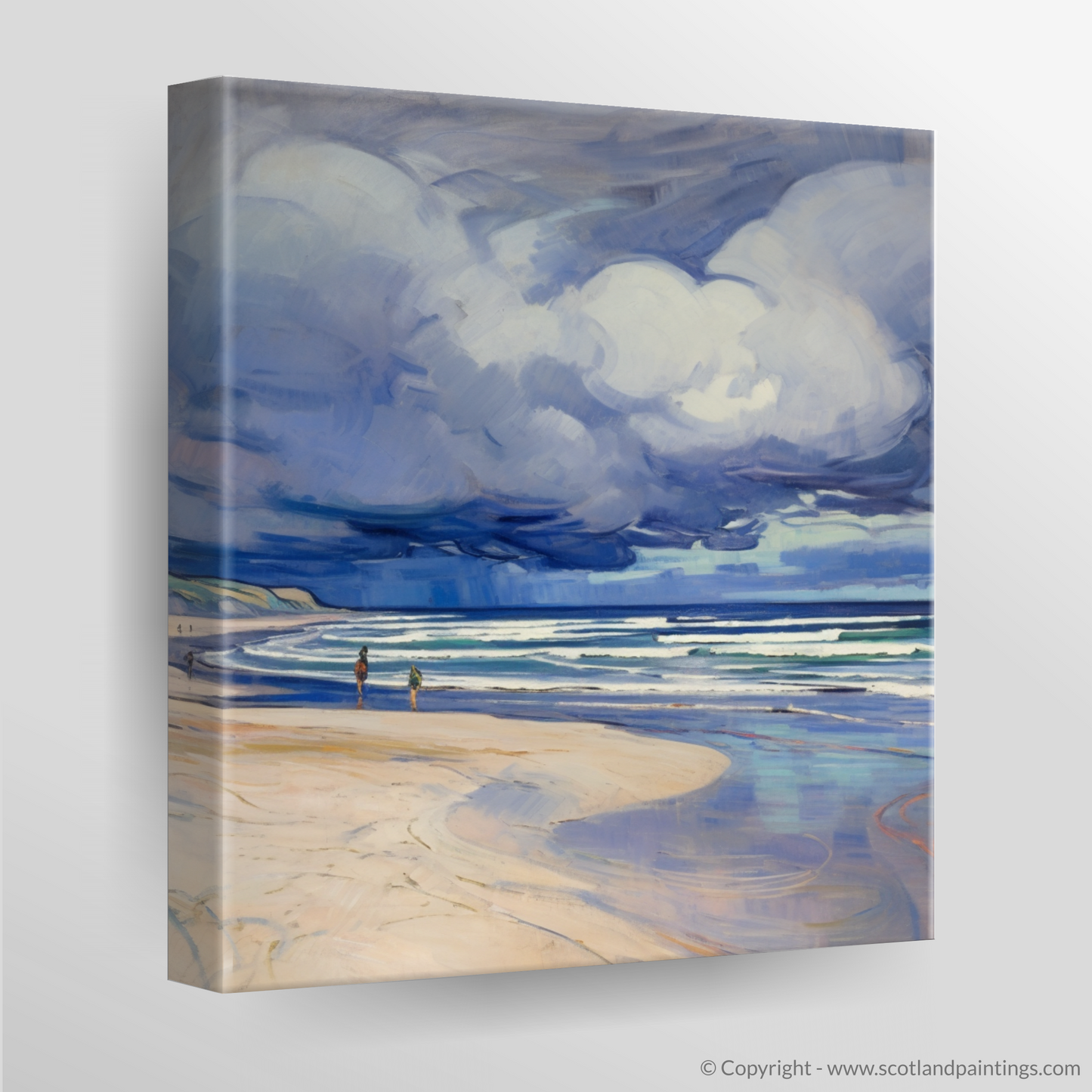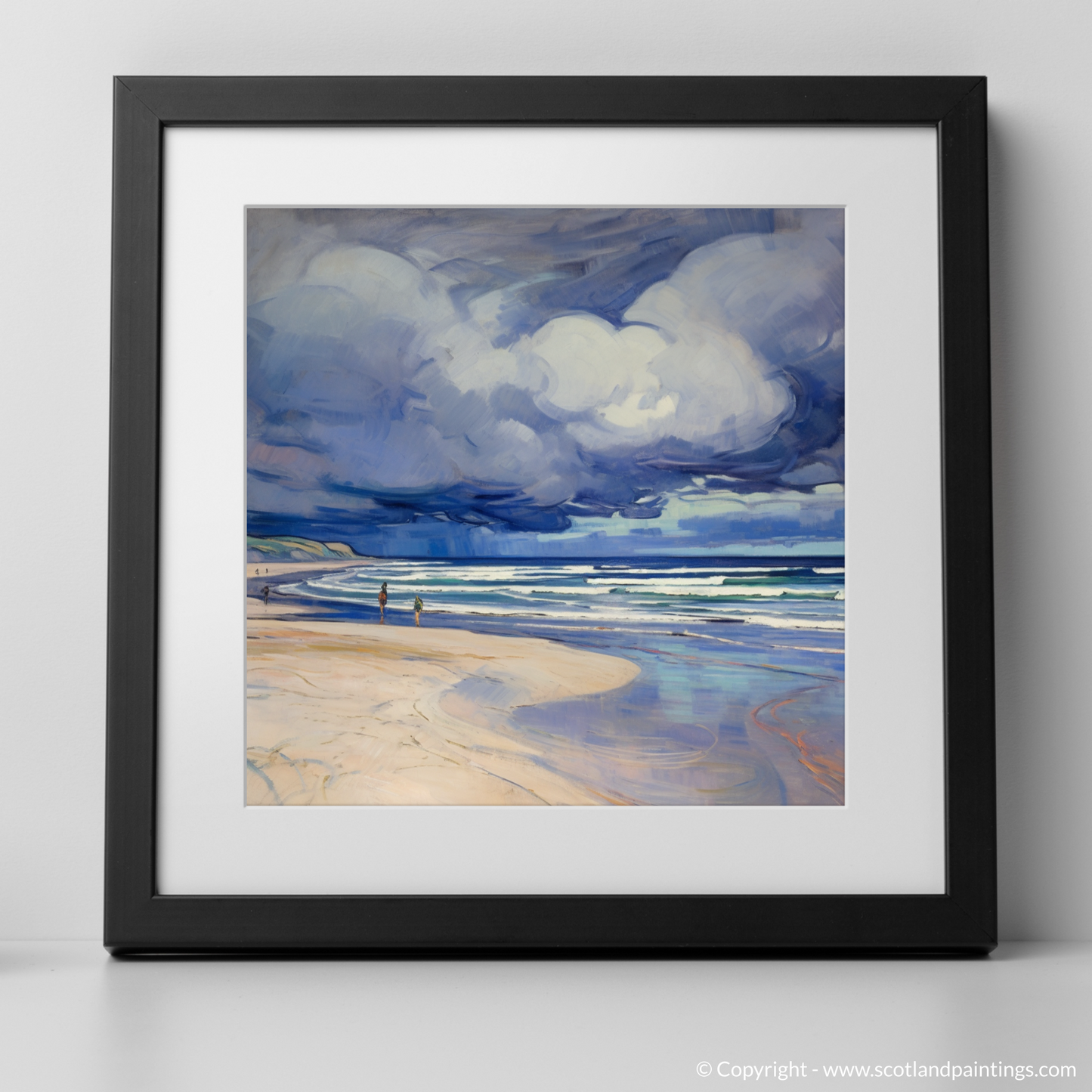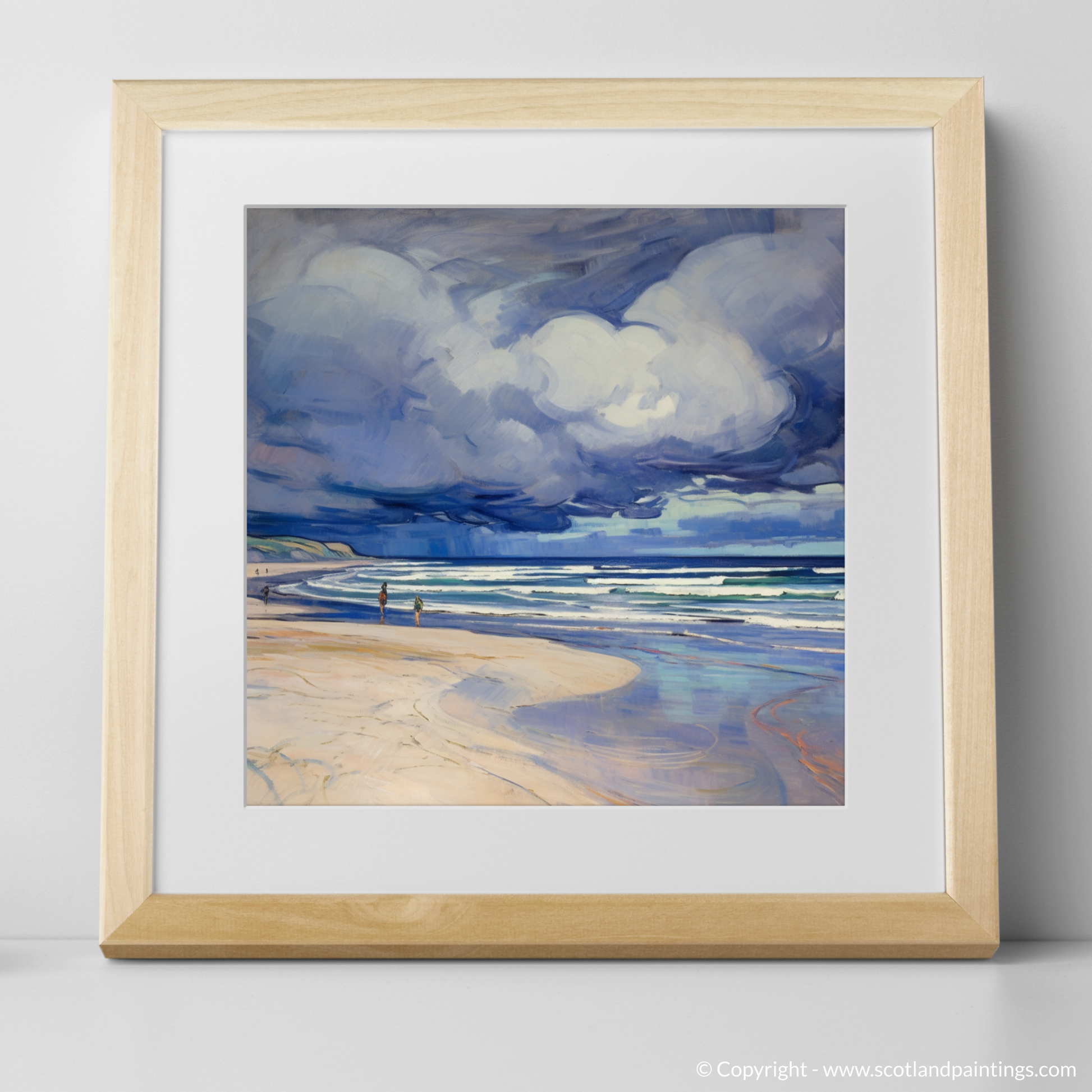 Captivating the intrepid spirit of Scotland's natural wonders, this evocative piece whisks the viewer away to the restless shores of Nairn Beach. The scene unfolds beneath an expansive and brooding sky, rendered with a dramatic flourish that typifies the Art Nouveau style's elegance and flowing lines. Billowing storm clouds, imbued with shades of moody blues, purples, and soft whites, appear to dance with the wind, magnifying the raw energy of the impending tempest.