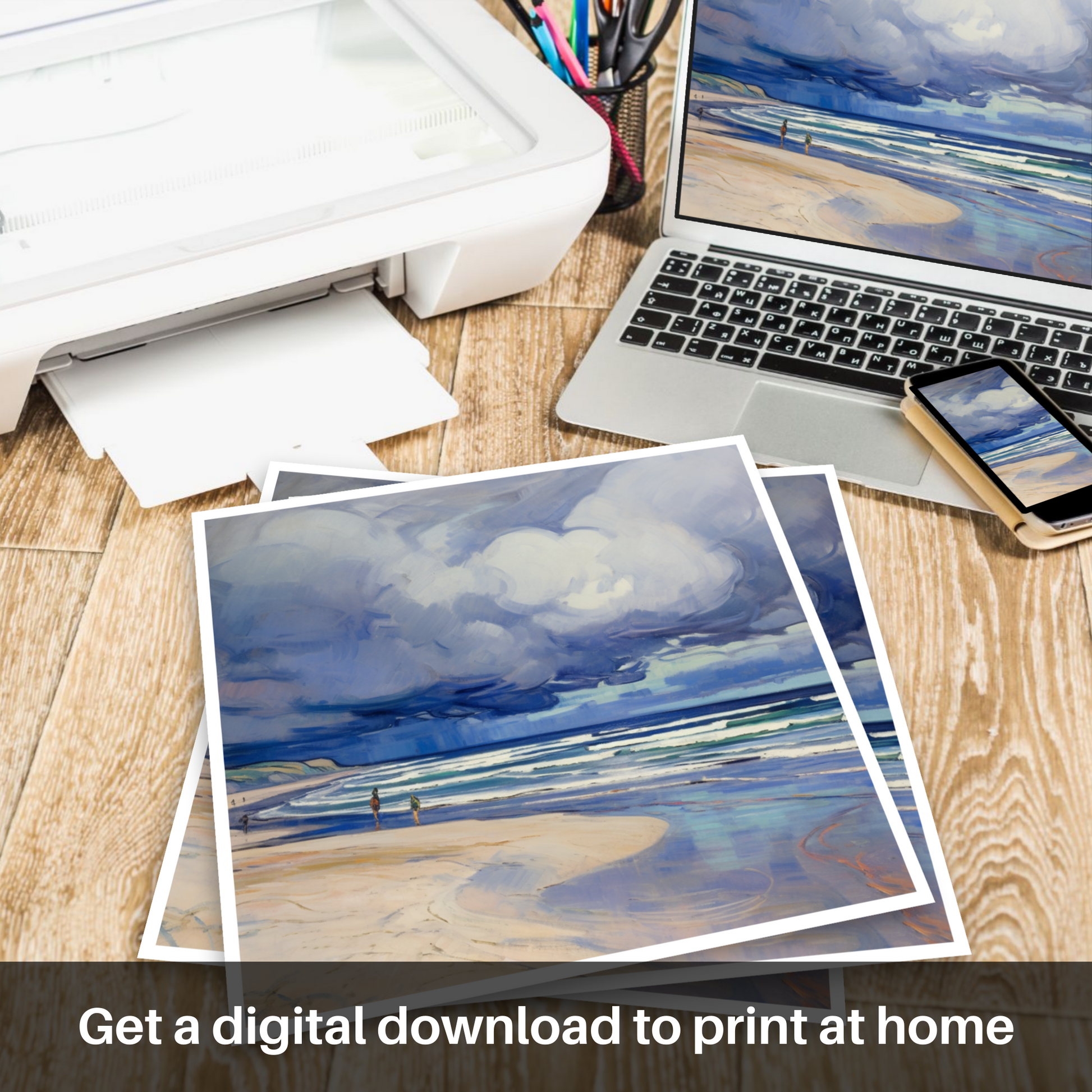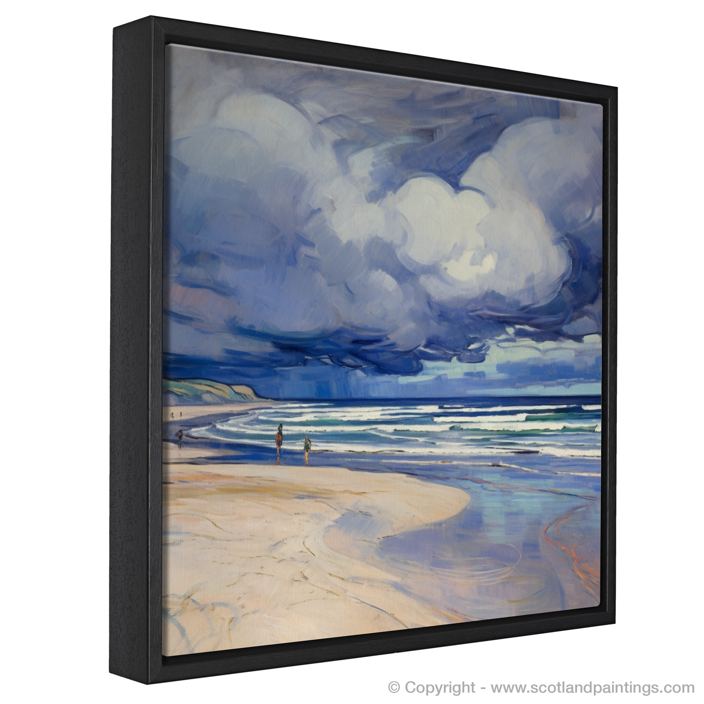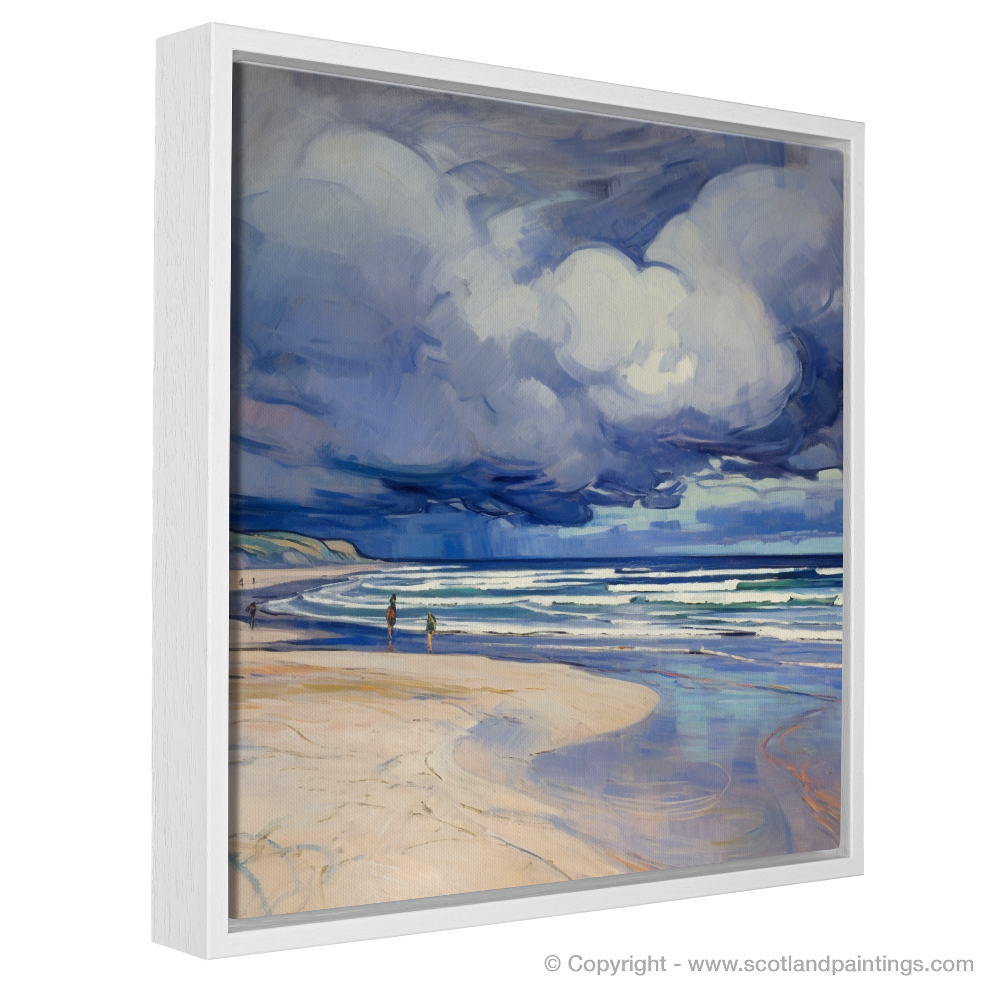 Captivating the intrepid spirit of Scotland's natural wonders, this evocative piece whisks the viewer away to the restless shores of Nairn Beach. The scene unfolds beneath an expansive and brooding sky, rendered with a dramatic flourish that typifies the Art Nouveau style's elegance and flowing lines. Billowing storm clouds, imbued with shades of moody blues, purples, and soft whites, appear to dance with the wind, magnifying the raw energy of the impending tempest.