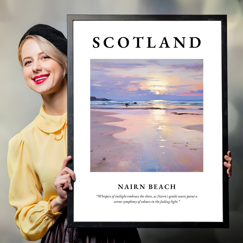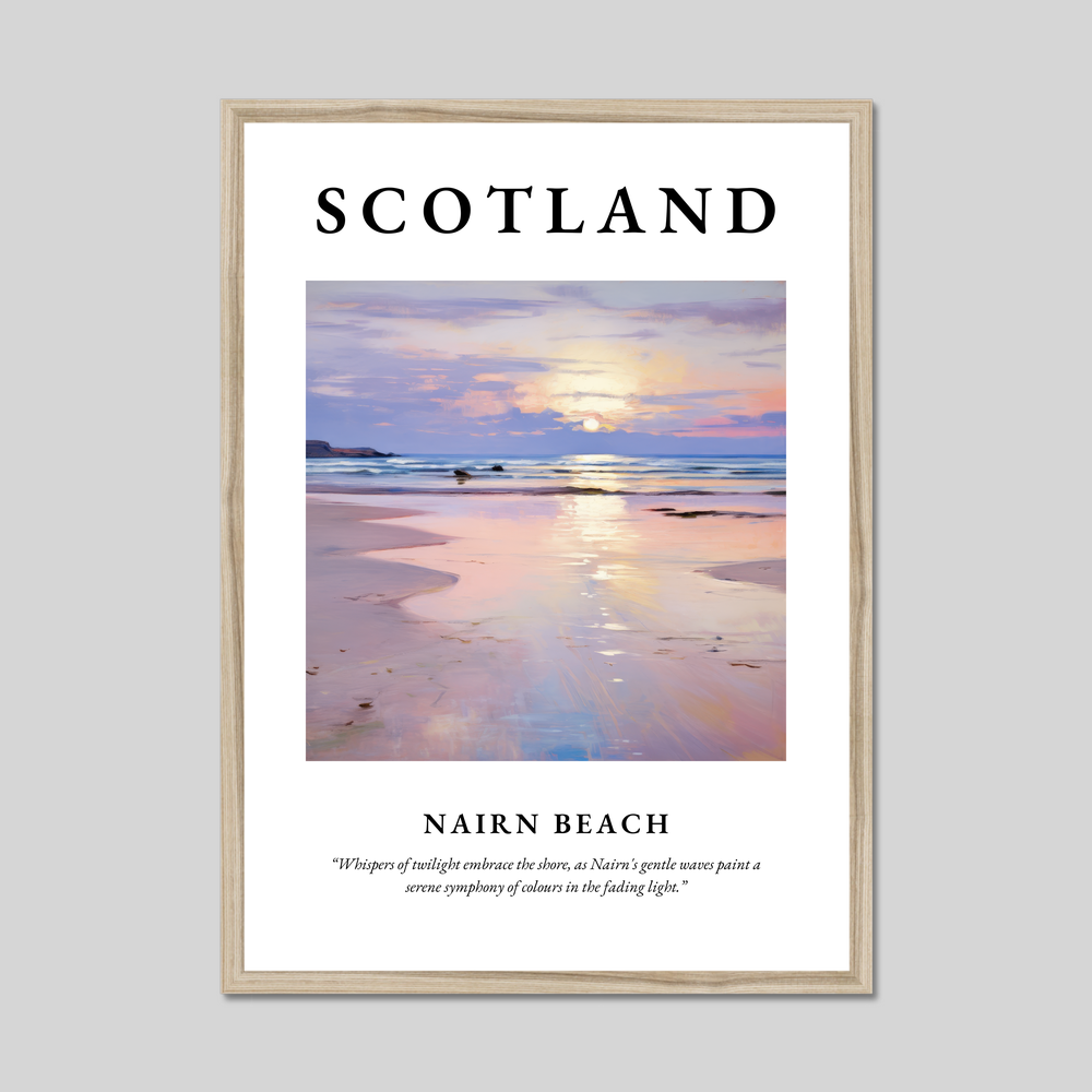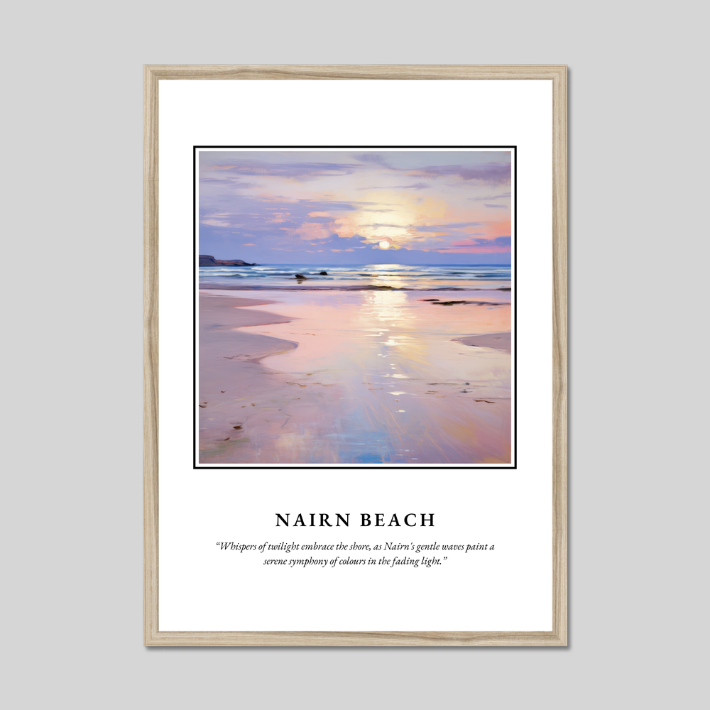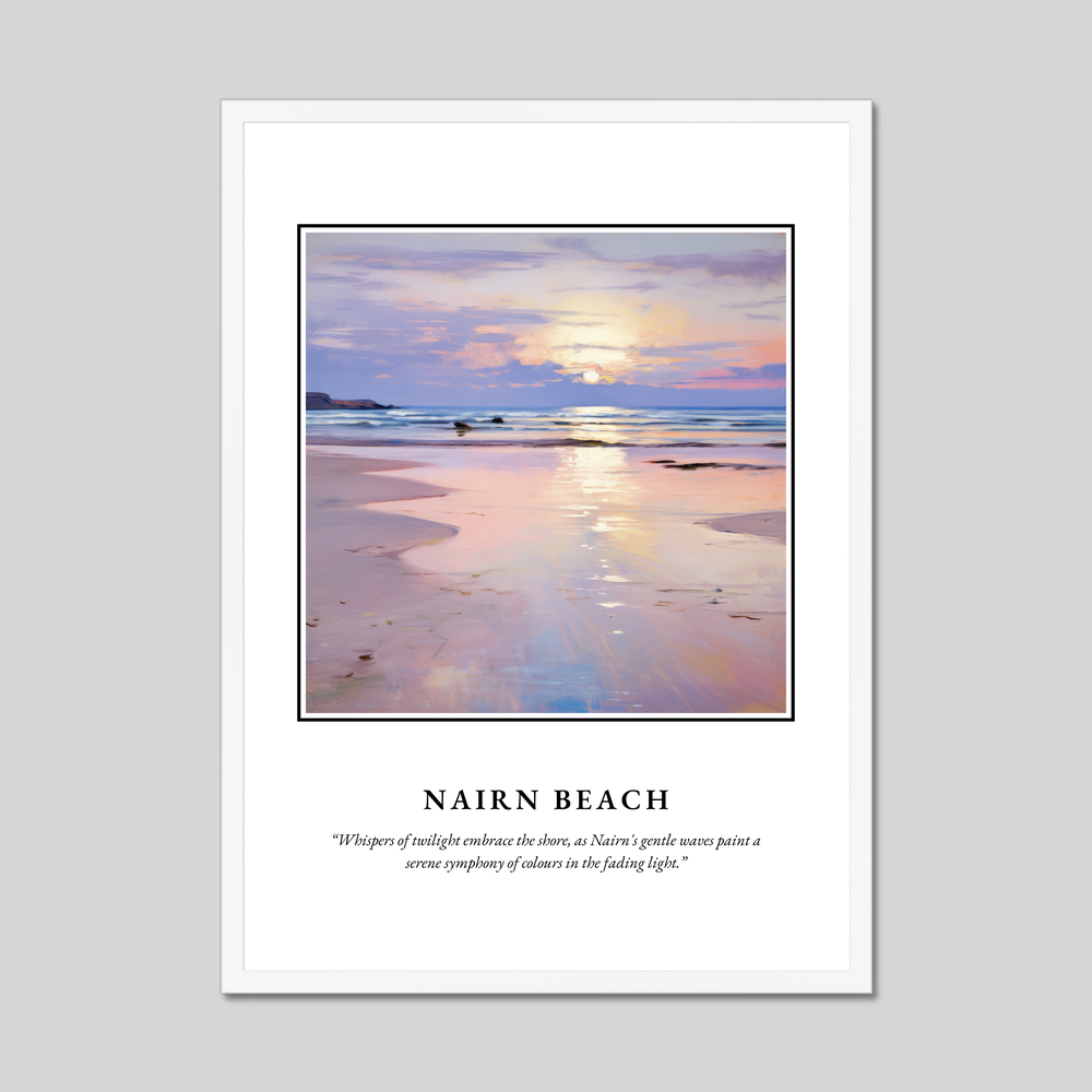 Available in a choice of black, white, or natural wood-effect framing, this versatile piece is perfect for anyone with an affinity for Scotland, Impressionism, or the tranquil shores of Nairn. The painting itself offers a breathtaking view of the beach at twilight, where the soft hues of the sunset melt into the gentle waves, creating a symphony of colours that dance across the sand and water. Beneath this evocative scene, the quote, “Whispers of twilight embrace the shore, as Nairn's gentle waves paint a serene symphony of colours in the fading light,” perfectly encapsulates the essence of the artwork.