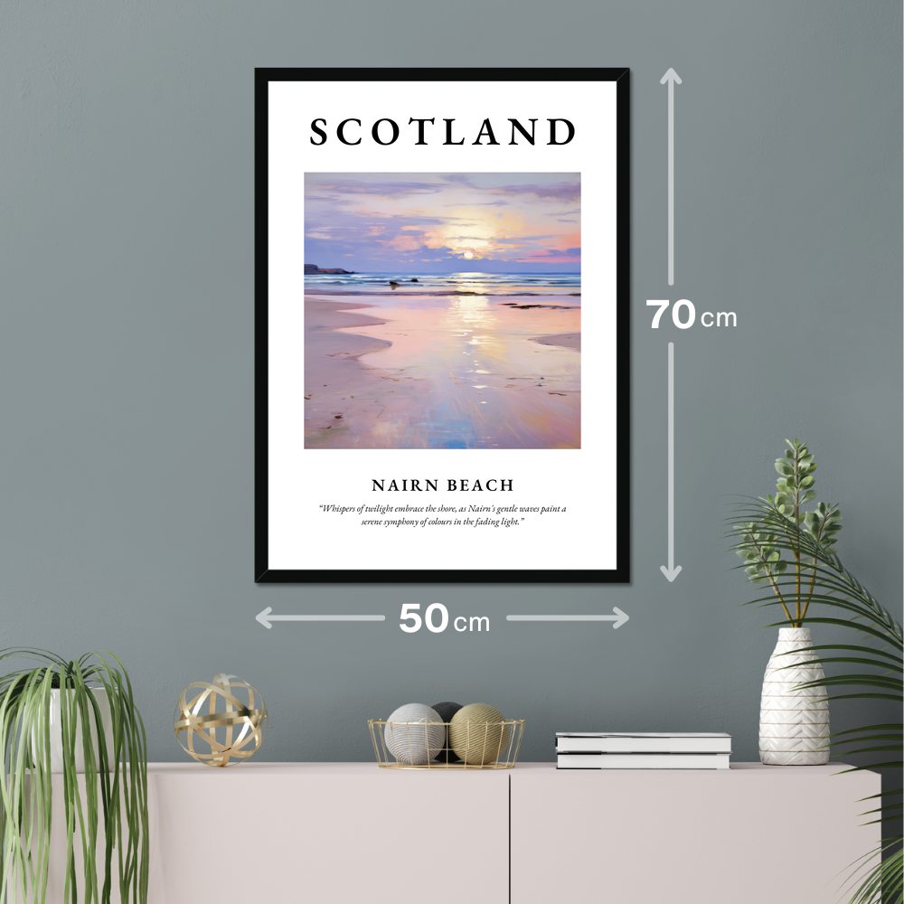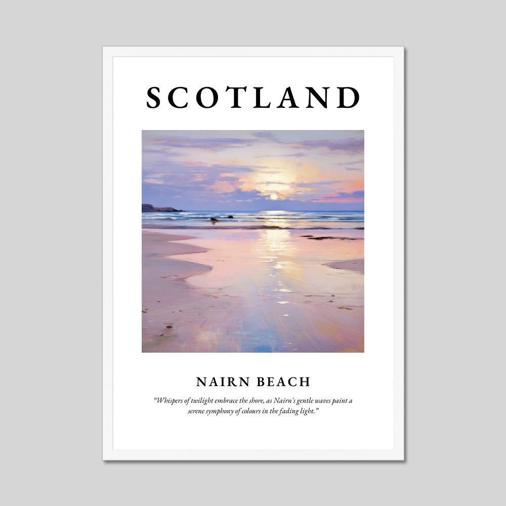 Nairn Beach in Scotland is a haven of tranquillity and natural beauty. Known for its expansive stretches of golden sands and calm, clear waters, it's a destination that captures the hearts of many. As depicted in the poster, the beach comes alive at dusk when the sun dips below the horizon, and the skies are painted in a palette of soft pinks and gentle blues. This beautiful interpretation in the artwork brings to life the magic and serene allure that Nairn Beach is celebrated for, providing an everlasting glimpse into its enchanting landscape.