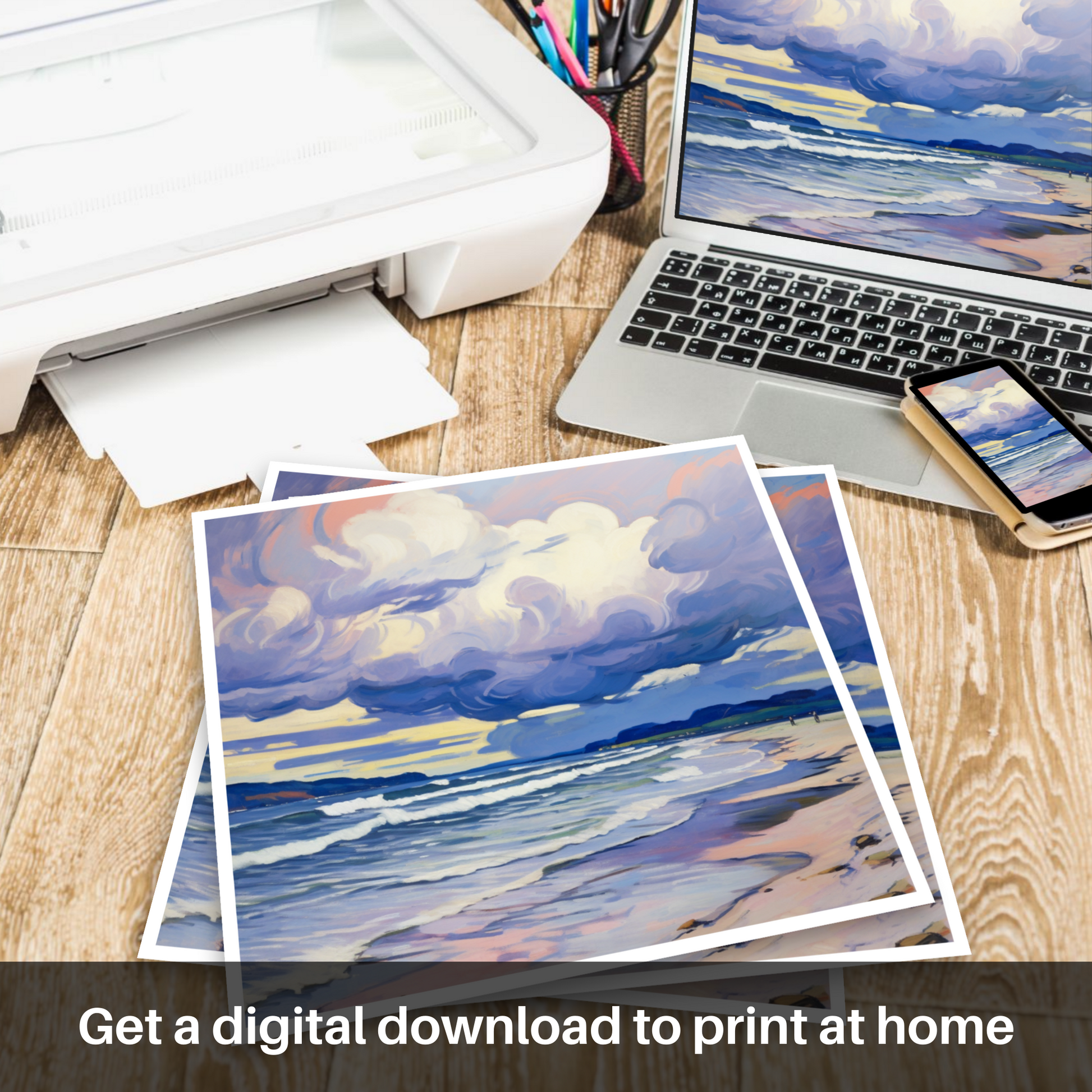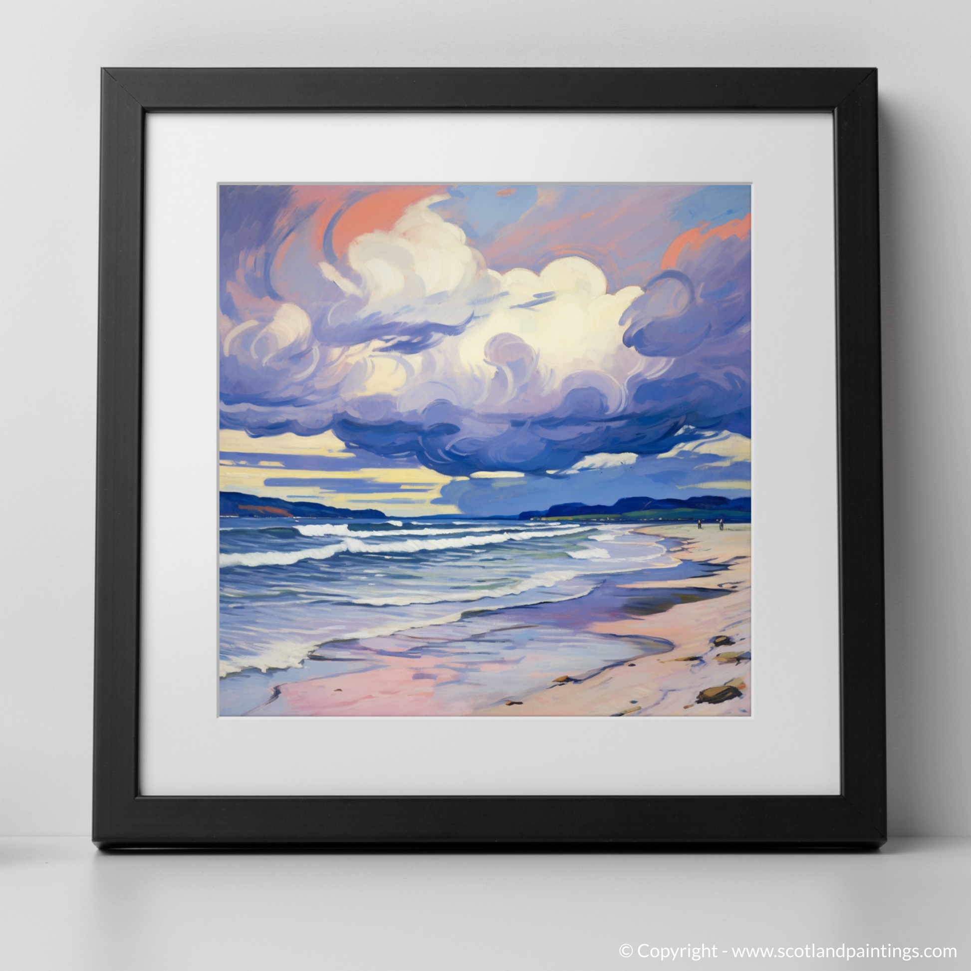 Embrace the wild beauty of Scotland's shores with our vibrant print, capturing the untamed essence of Nairn Beach under a tumultuous sky. The piece vividly depicts the drama of nature where land and sea clash, immortalised through the passionate strokes and vivid tones characteristic of Fauvism. The sky, a masterpiece of emotion, swirls with majestic purples and blues, infused with hints of warm coral, mirroring the intensity of a storm gathering its breath.