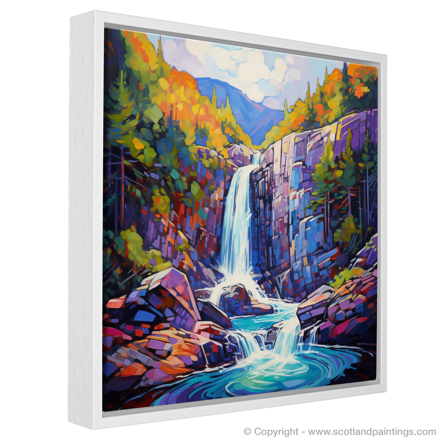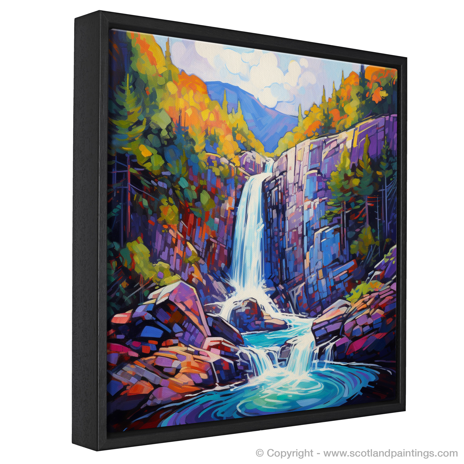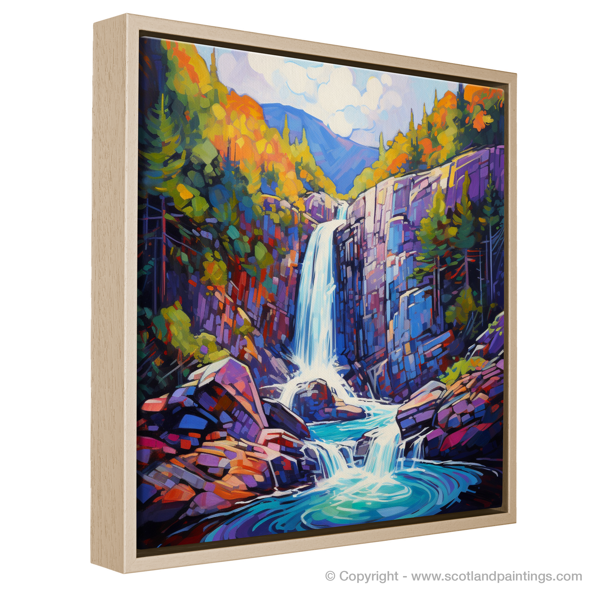 Animating the rugged beauty of Plodda Falls with a vibrant palette and exuberant brushstrokes, this exquisite print invites the viewer into a Modern Impressionist vision of one of Scotland's natural wonders. The artwork captures the dynamic flow of water as it cascades from the precipice into a serene pool below, framed by precipitous cliffs. Strokes of cobalt and turquoise suggest the lively dance of light on the water's surface, contrasted against the deep purples and burgundies of the craggy rocks that line the fall’s descent.