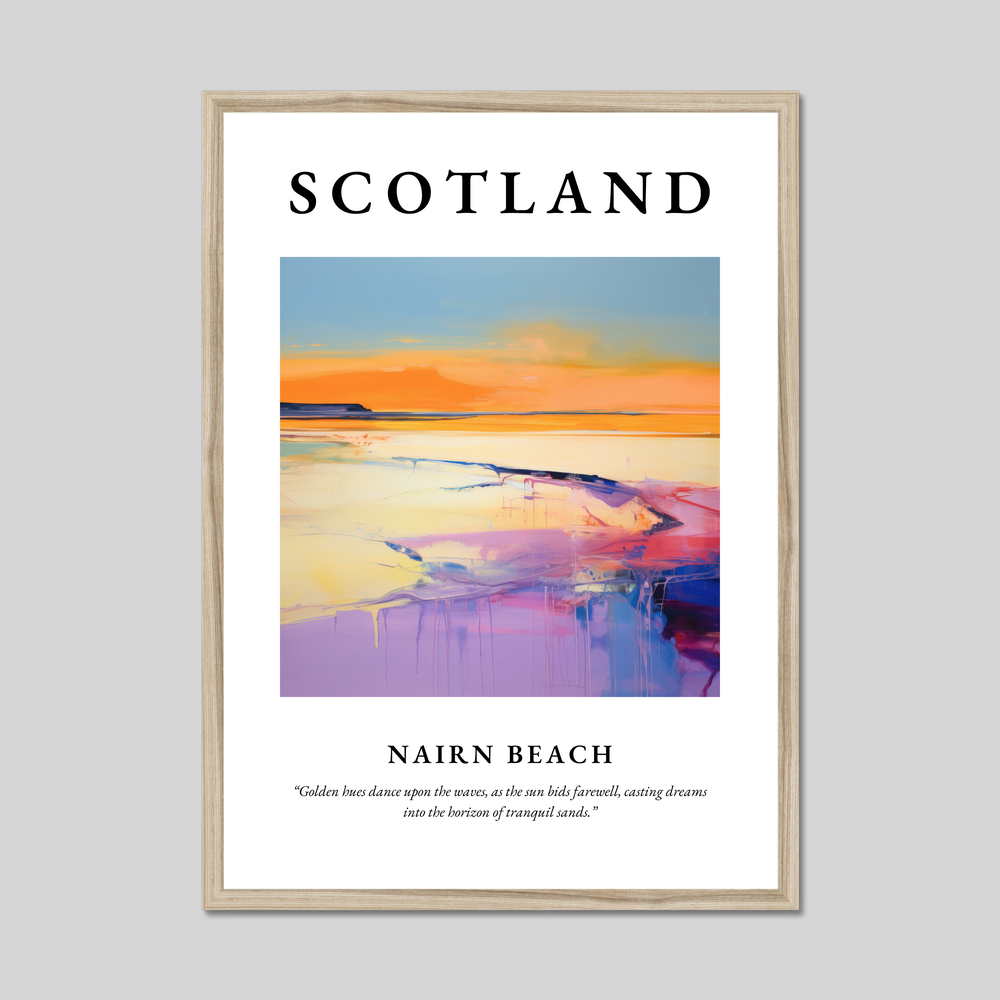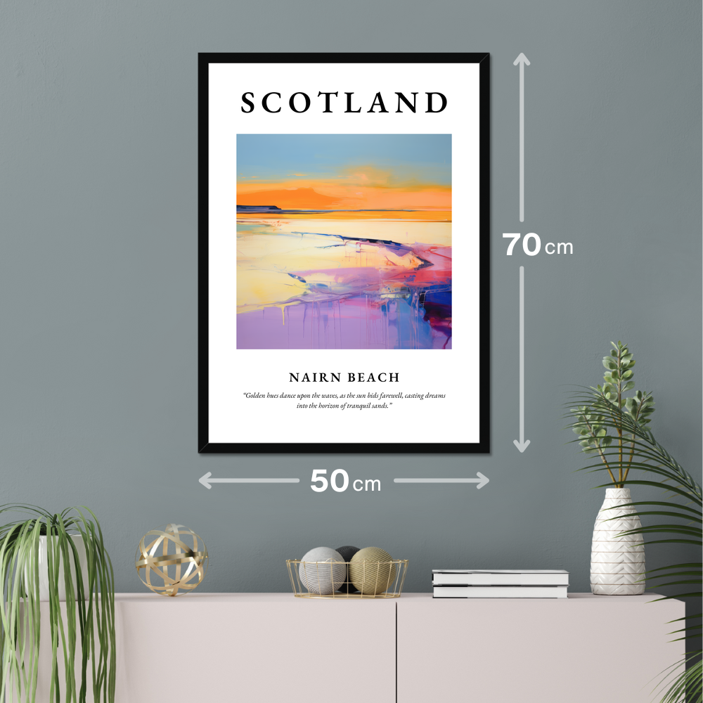 Experience the serene beauty of Scotland's coastline with our captivating framed poster print, featuring an abstract representation of Nairn Beach. Measuring an impressive 50cm x 70cm, this artwork commands attention and transforms any space with its vivid portrayal of Scotland's natural splendour. The bold "SCOTLAND" emblazoned at the top is a proud declaration, inviting viewers to step into a world where artistic expression meets natural wonder.
