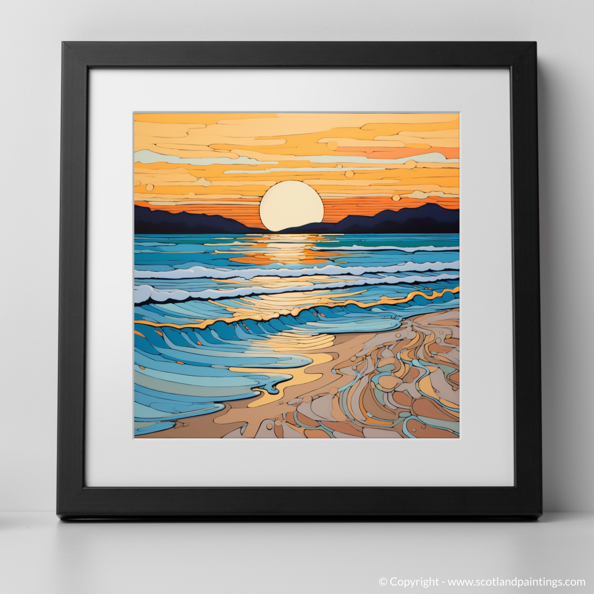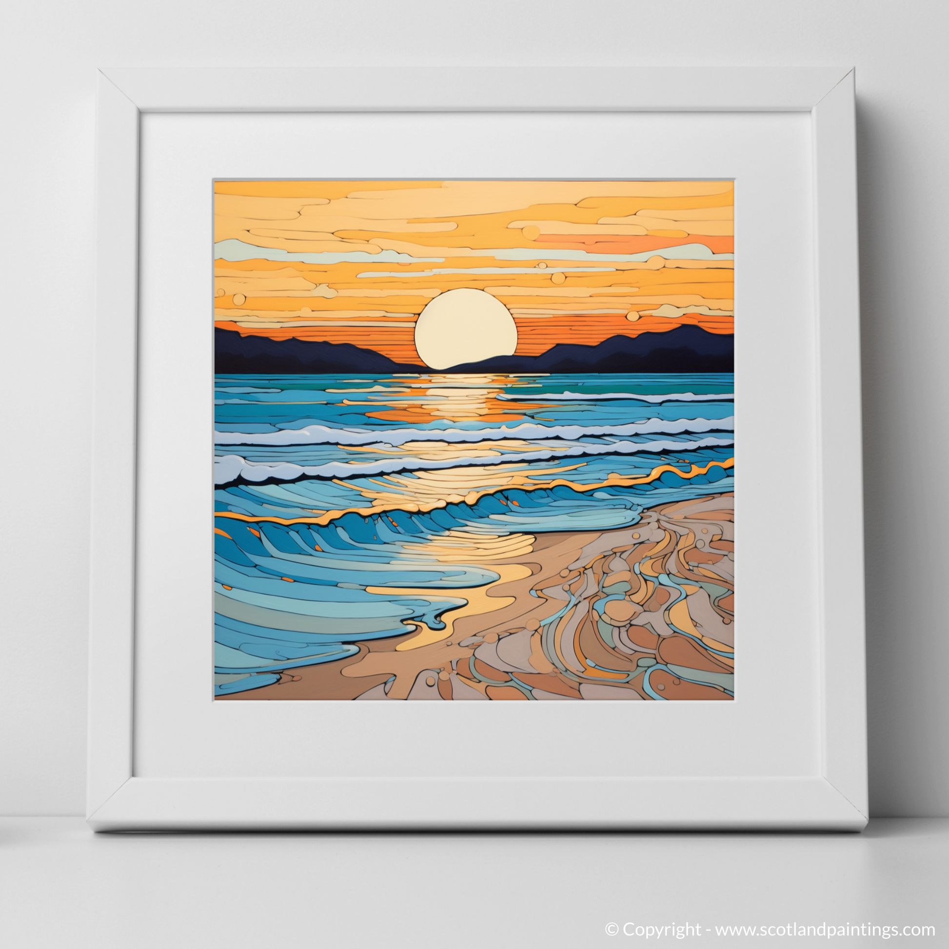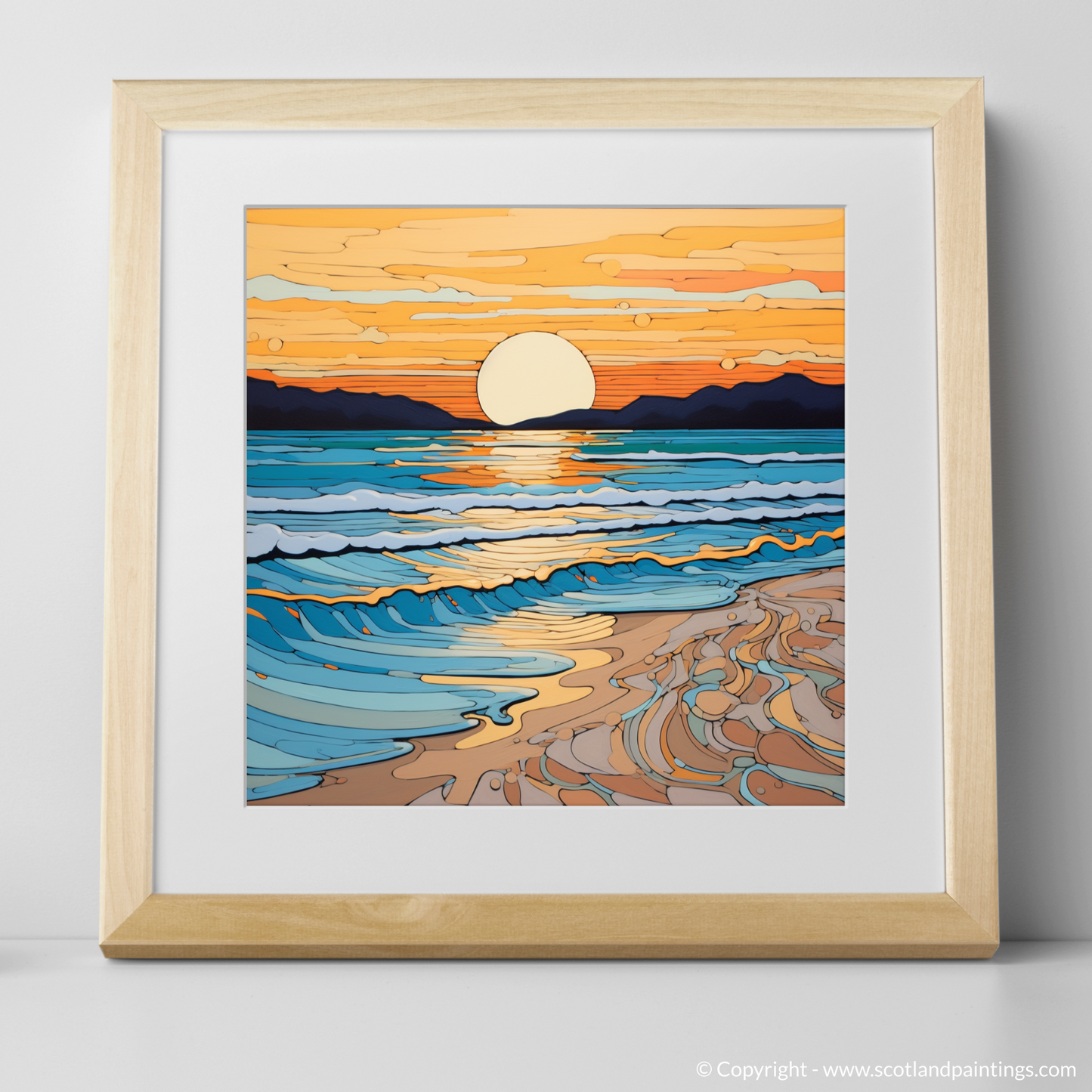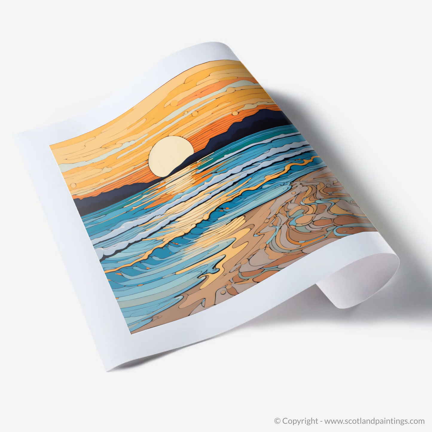 Capturing the serene essence of Nairn Beach at the enchanting hour of dusk, this charming print invites the warmth of the Scottish coast into your space with its vivid colours and whimsical interpretation. As you gaze upon the artwork, you are immediately transported to the shoreline where the remnants of the day's warmth kiss the cool, rolling waves.