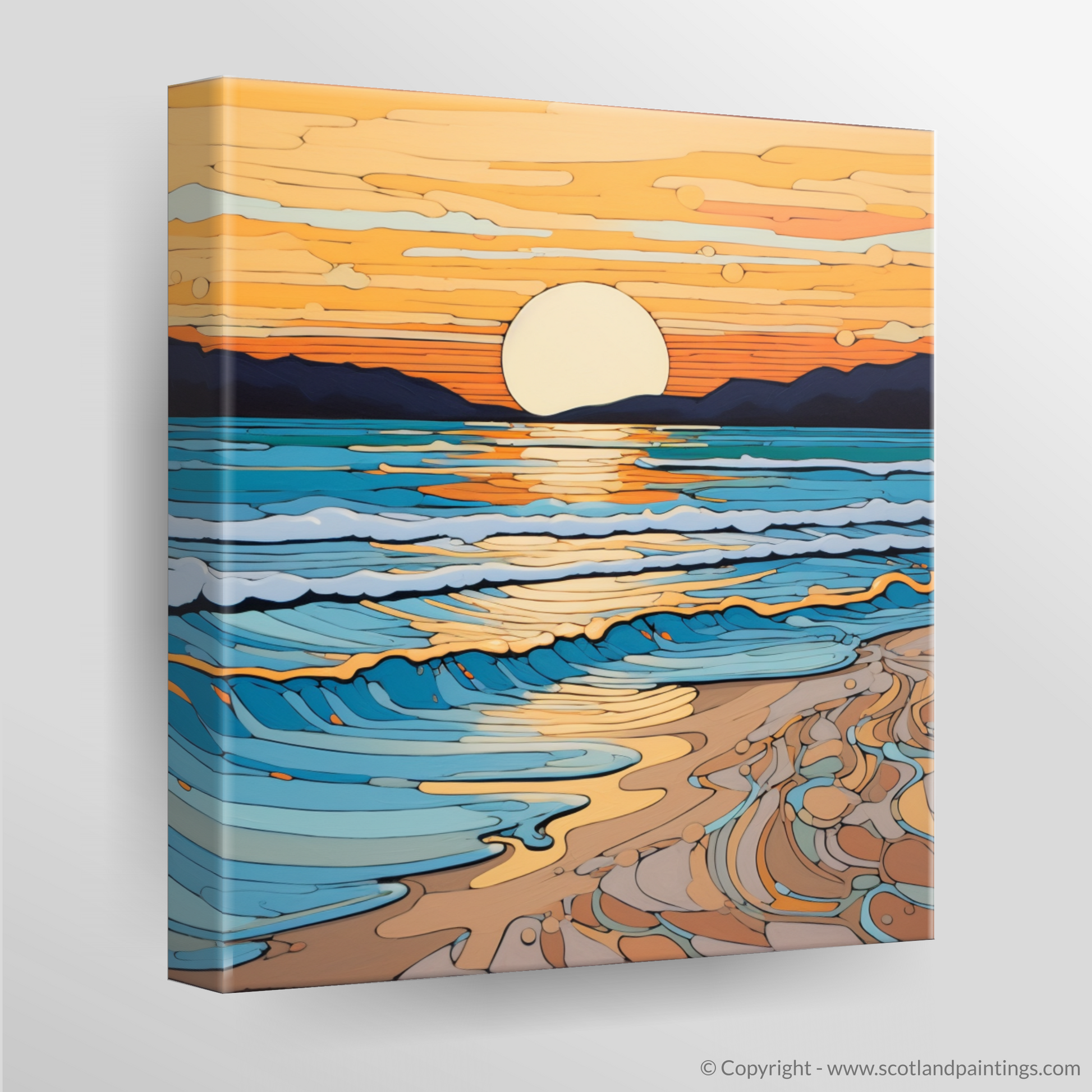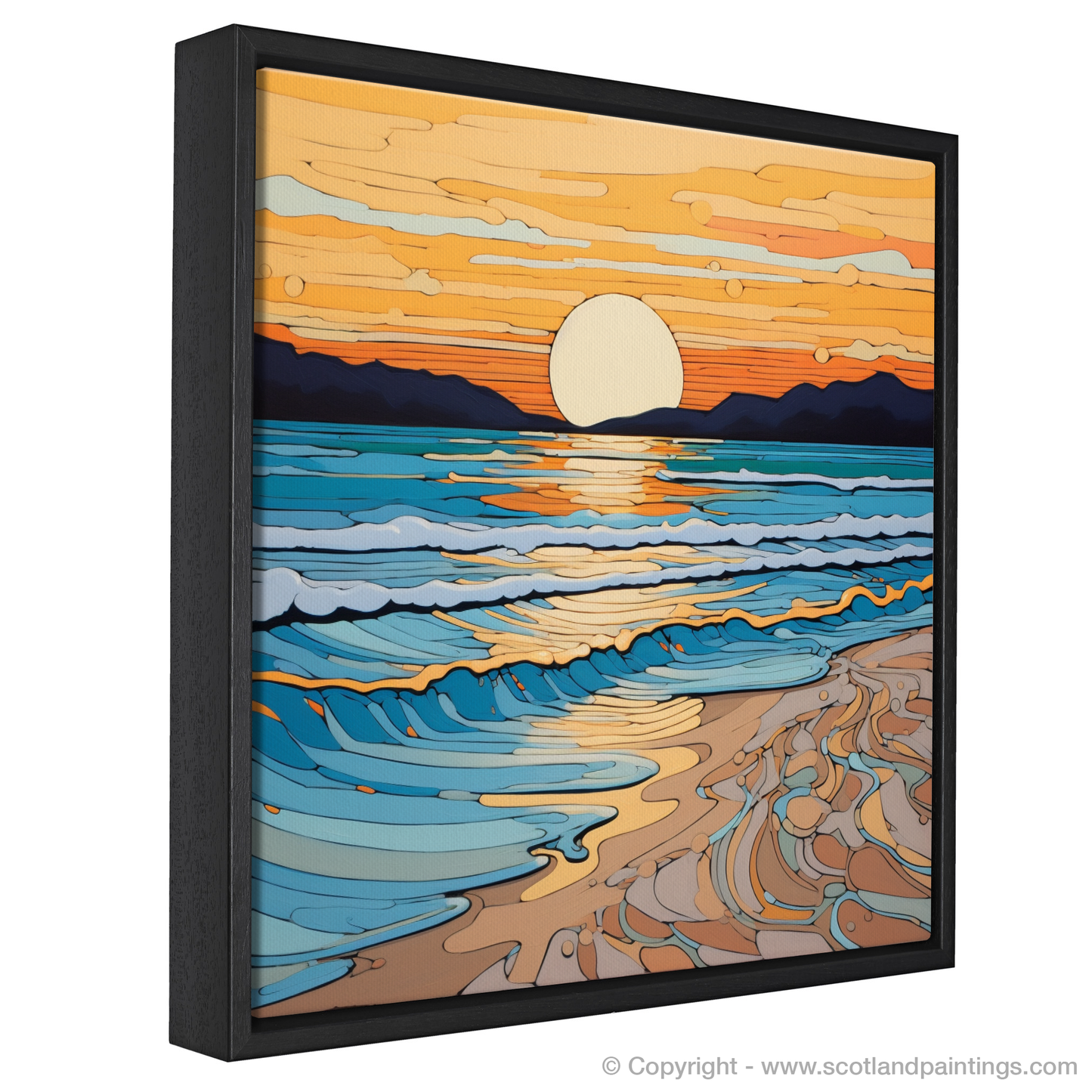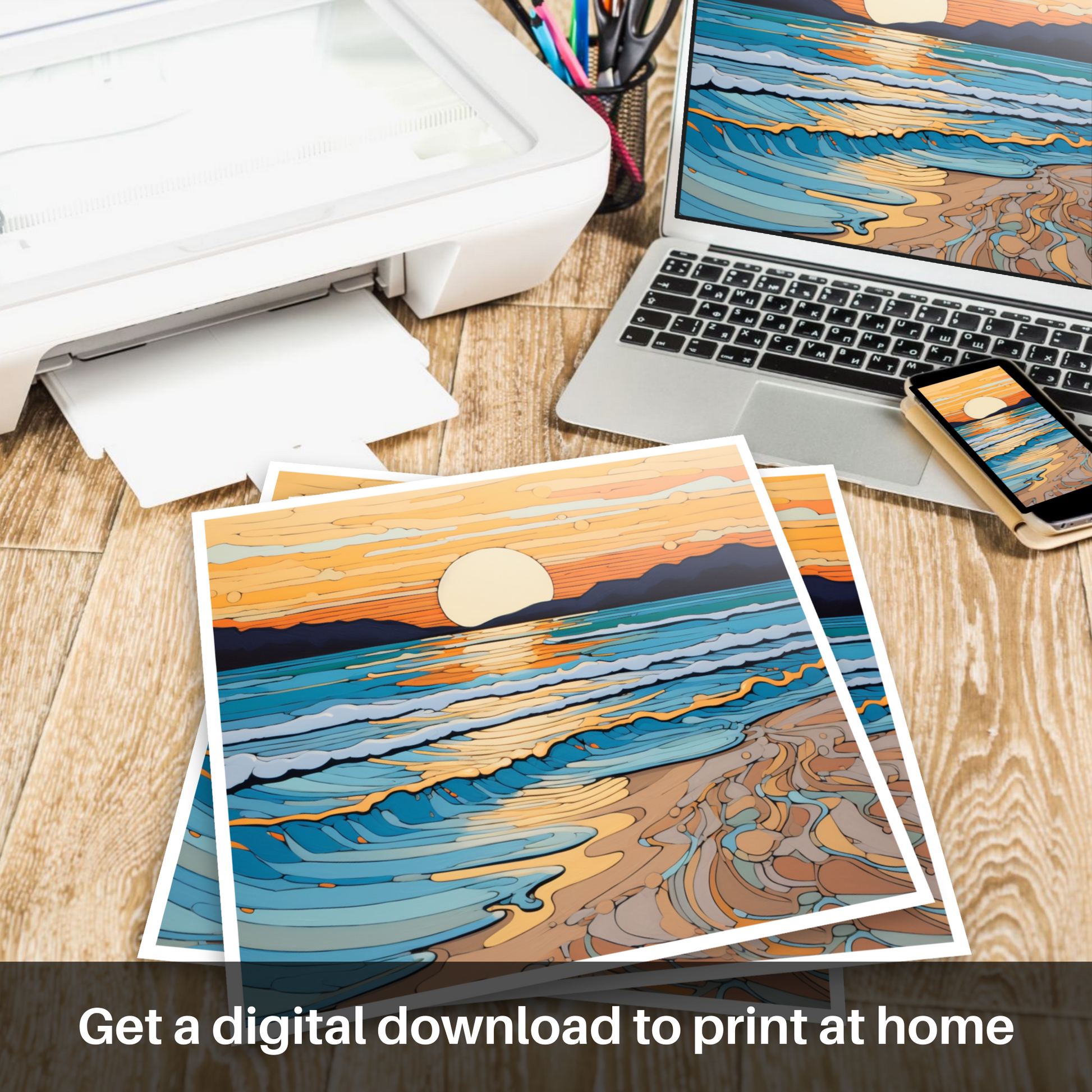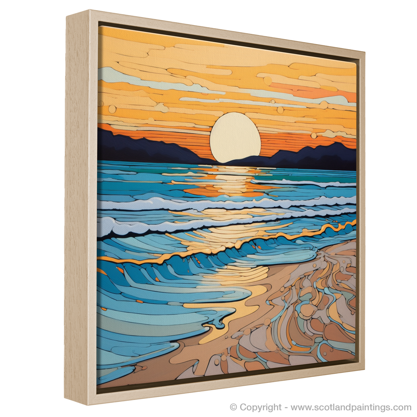Capturing the serene essence of Nairn Beach at the enchanting hour of dusk, this charming print invites the warmth of the Scottish coast into your space with its vivid colours and whimsical interpretation. As you gaze upon the artwork, you are immediately transported to the shoreline where the remnants of the day's warmth kiss the cool, rolling waves.