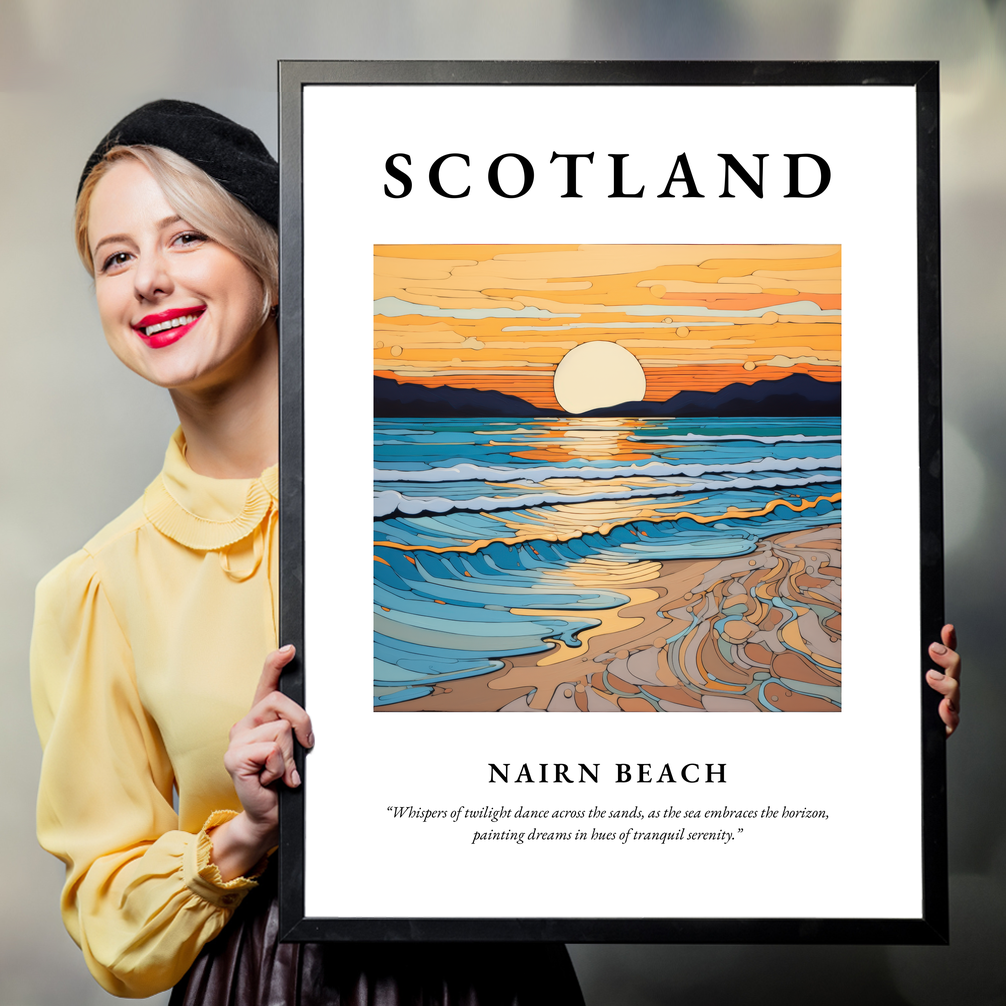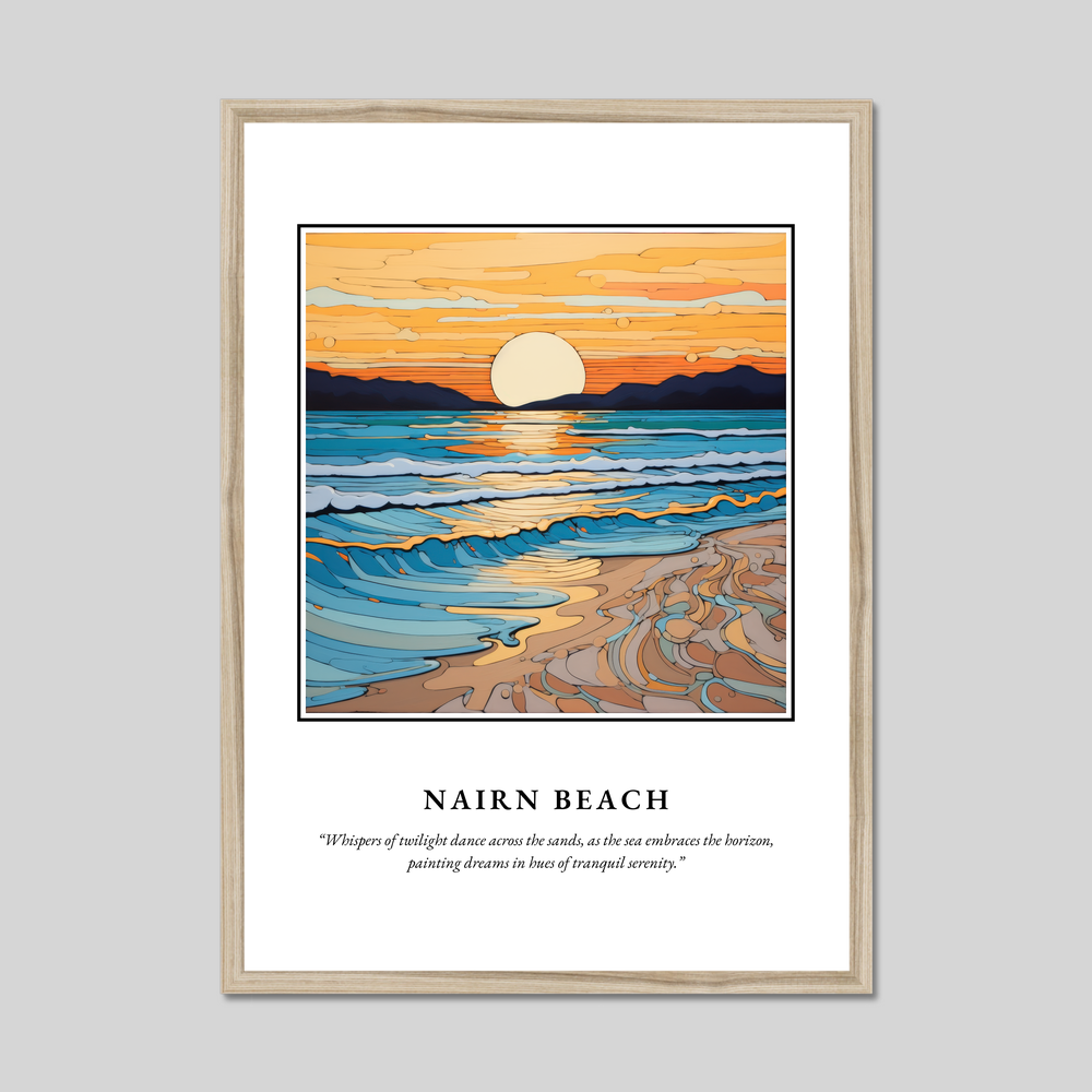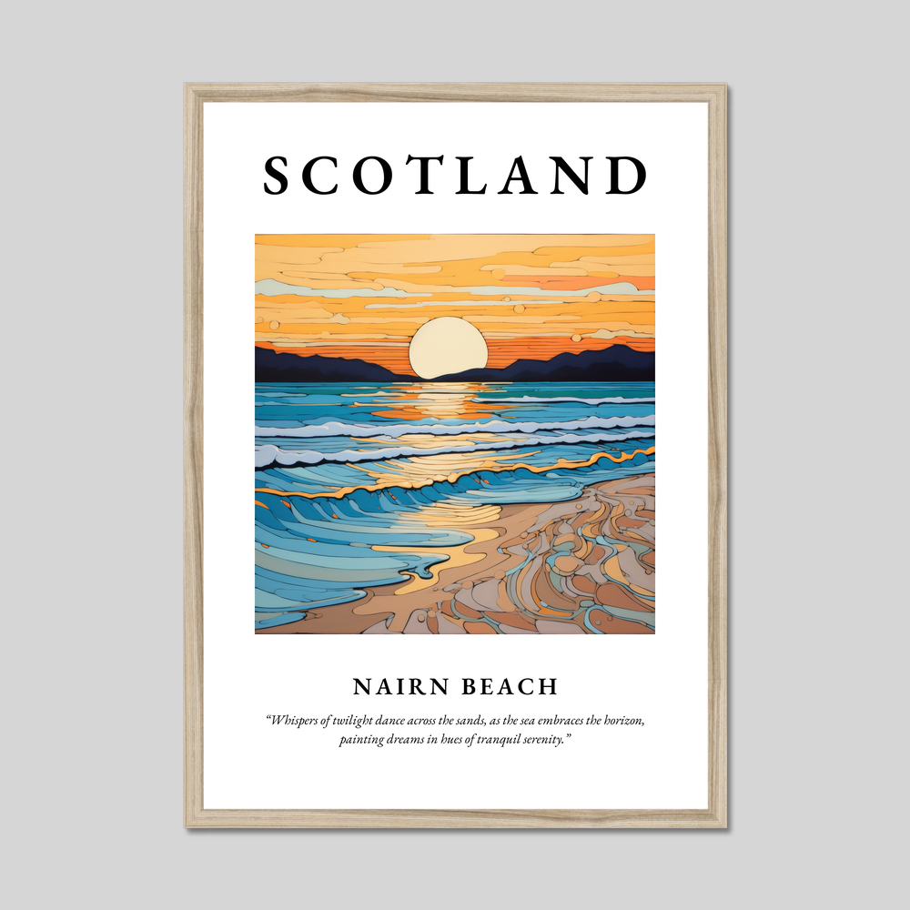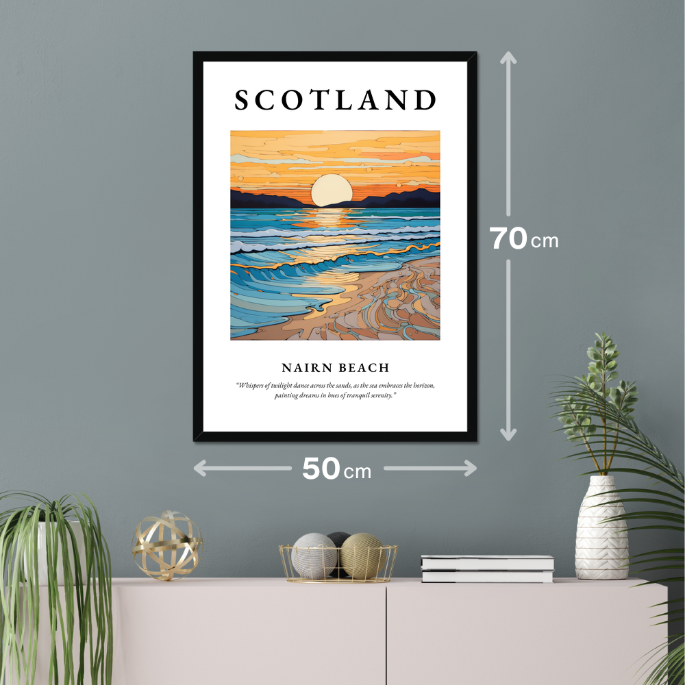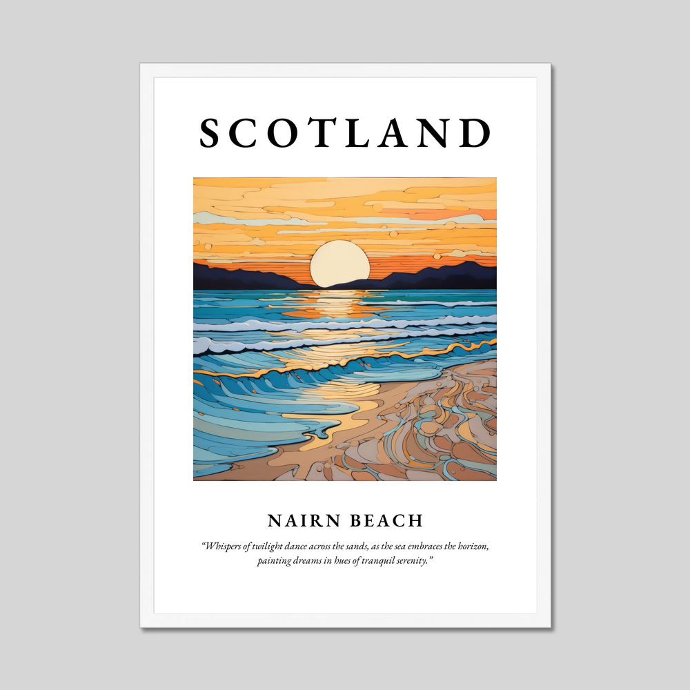 Celebrate the enchanting beauty of Scotland with this captivating framed poster print of Nairn Beach. Measuring an impressive 50cm x 70cm, this striking piece features the word “SCOTLAND” in bold lettering crowning a mesmerising painting of the beach. Beneath the artwork, a poetic quote captures the magic of the scene: “Whispers of twilight dance across the sands, as the sea embraces the horizon, painting dreams in hues of tranquil serenity.”