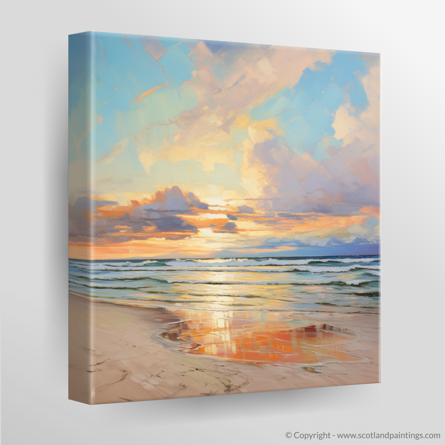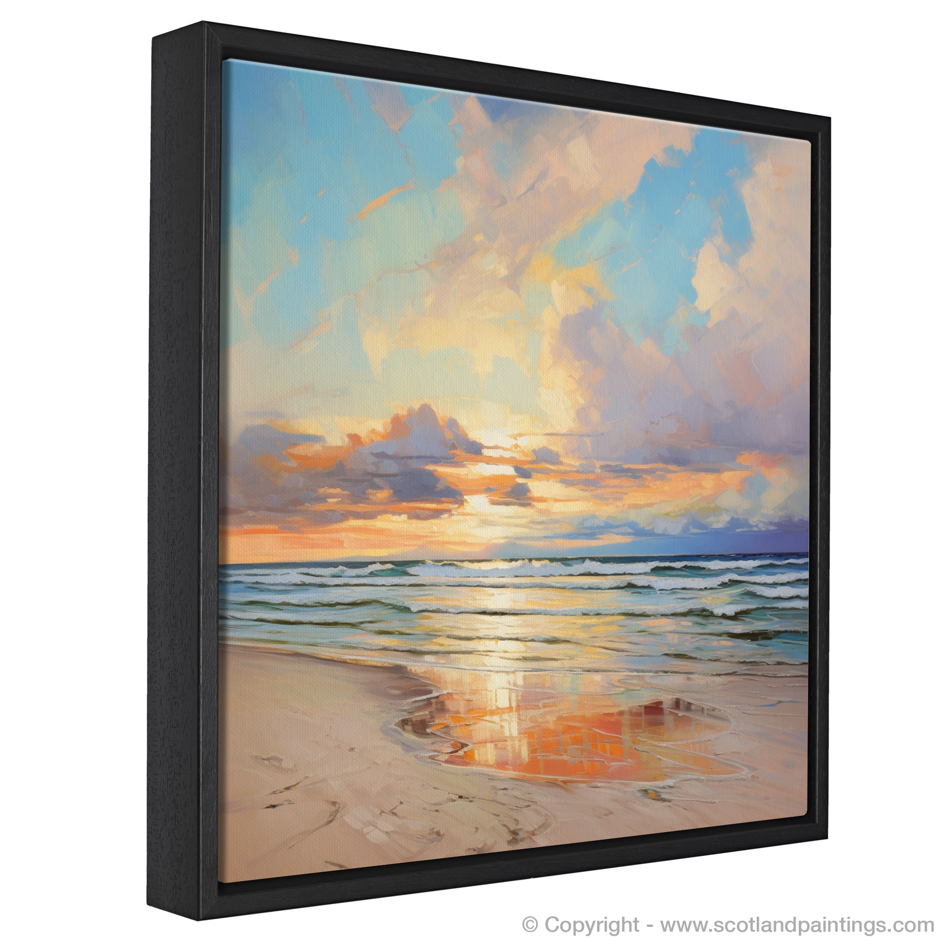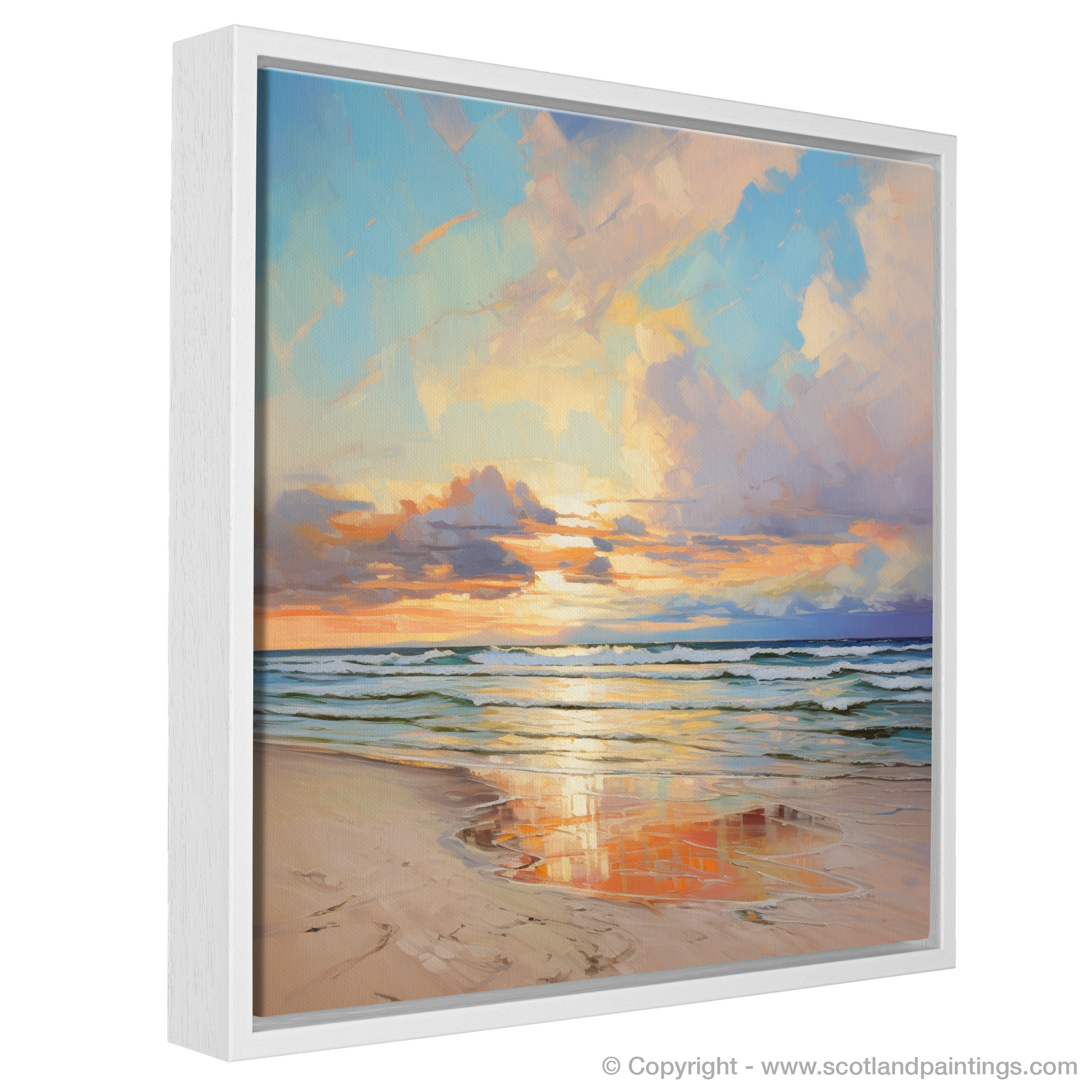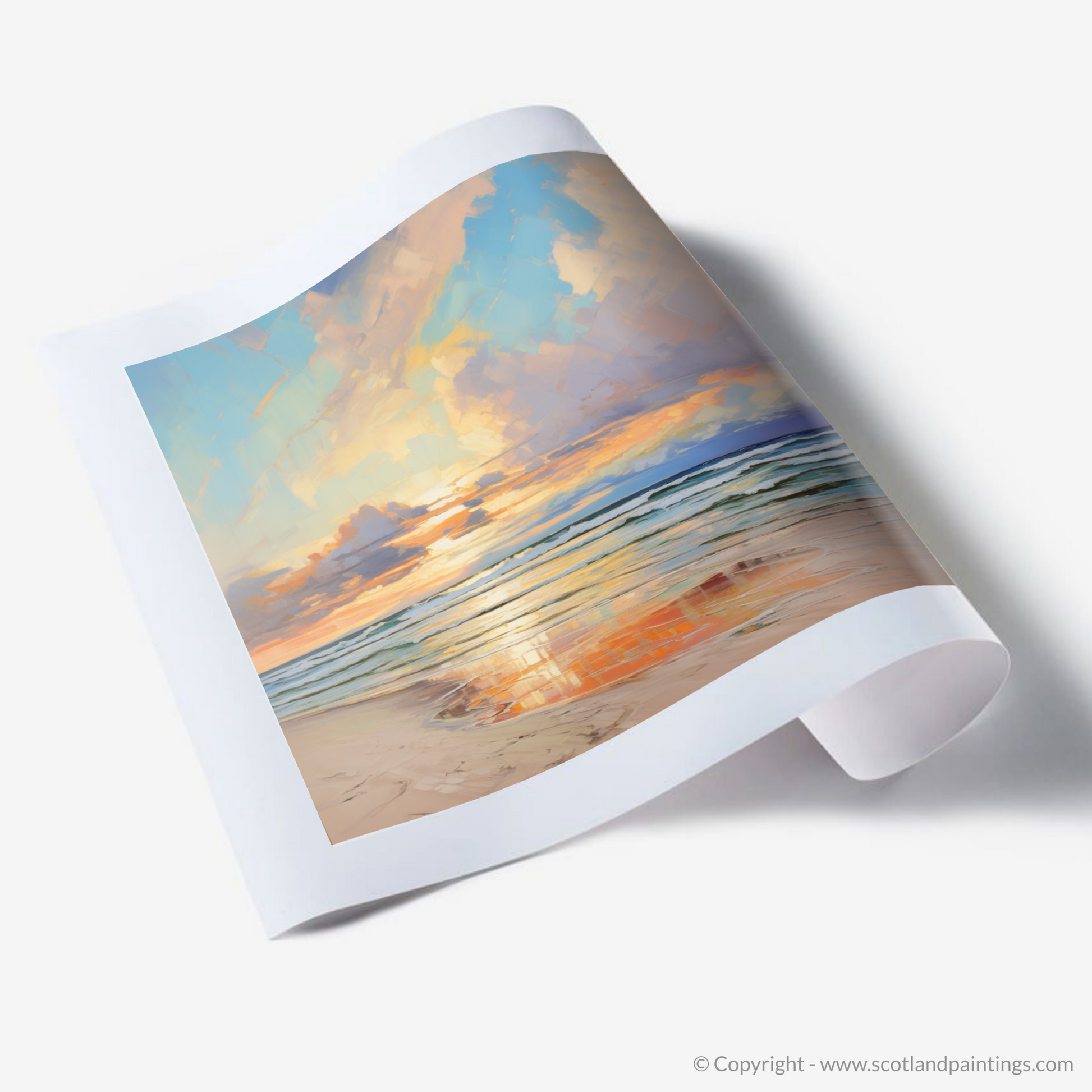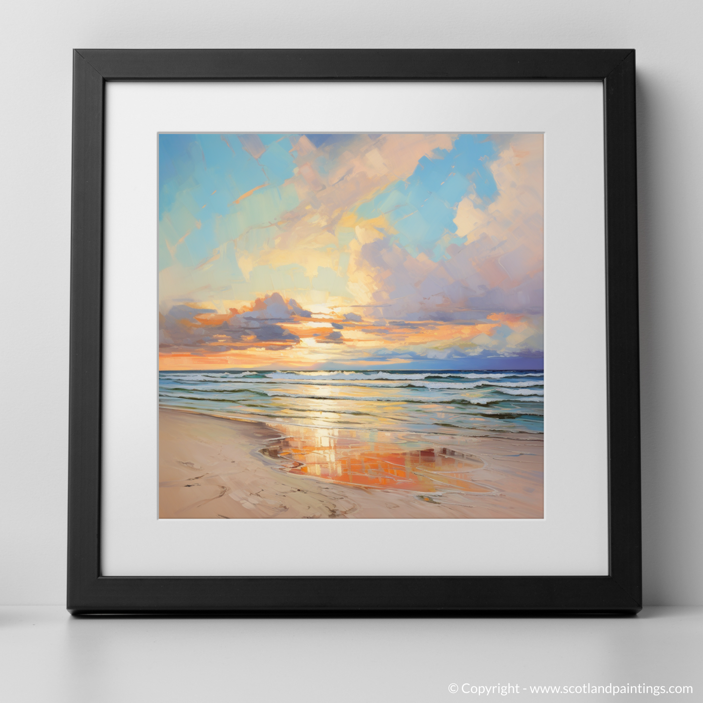 Capture the tranquil essence of Nairn Beach at the close of day with our evocative piece from the 'Scottish Beaches' collection. As the setting sun casts a warm glow over the horizon, the sky transforms into a breathtaking canvas of vibrant hues, where strokes of apricot, gold and soft pink blend seamlessly with the tranquil blues and purples of the twilight sky. Gazing upon this tableau, one can almost feel the gentle evening breeze and the hushed lapping of waves along the shore.