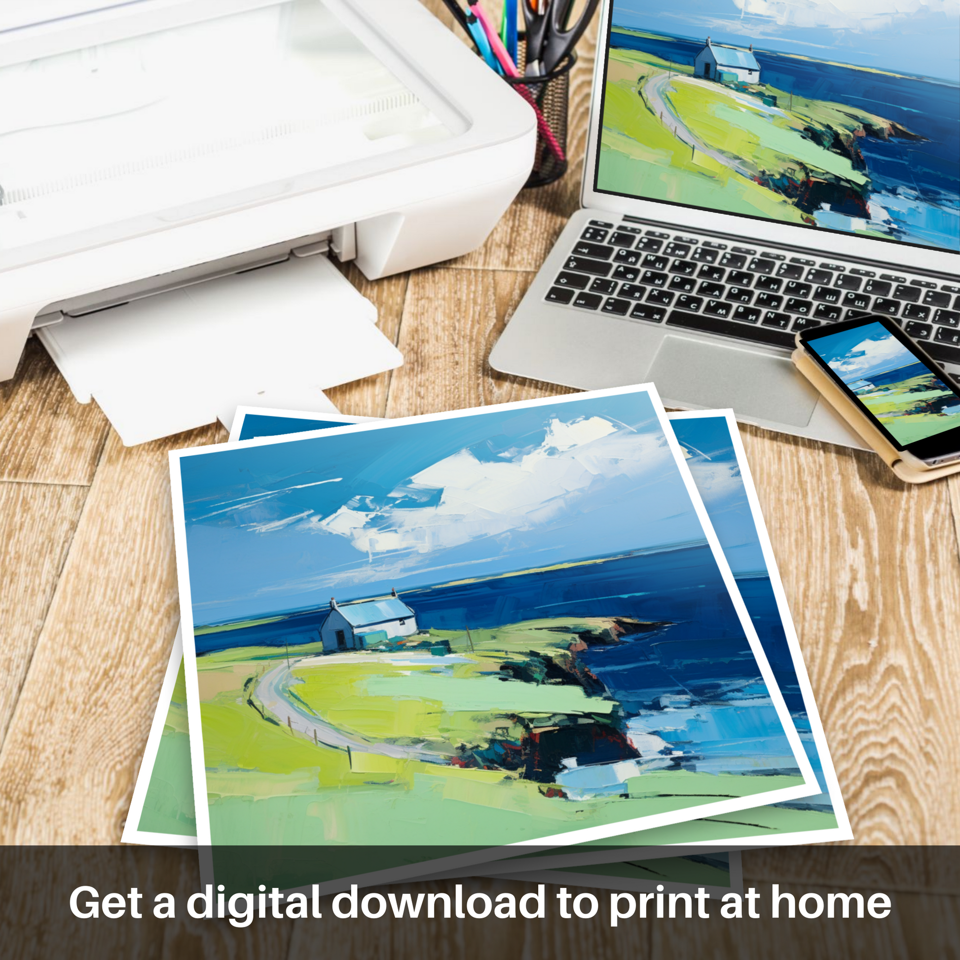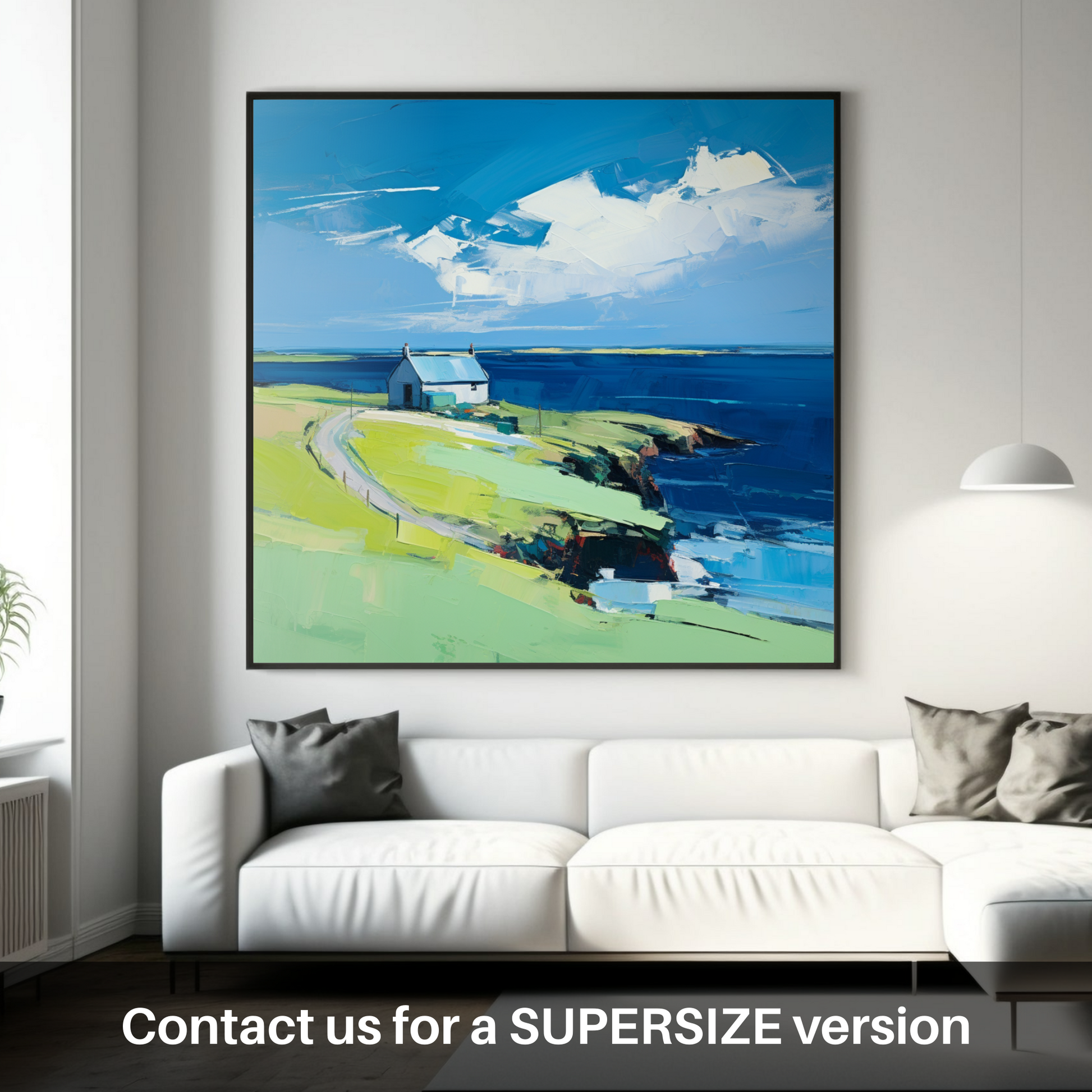 Immerse yourself in the vibrant essence of Shetland with this compelling contemporary piece, where each stroke captures the untamed beauty of Scotland's northern archipelago. Bold, impasto brushwork brings to life the sheer, craggy cliffs plunging into the deep blues of the surrounding sea, illustrating the raw, natural charm of the Shetland coastline.