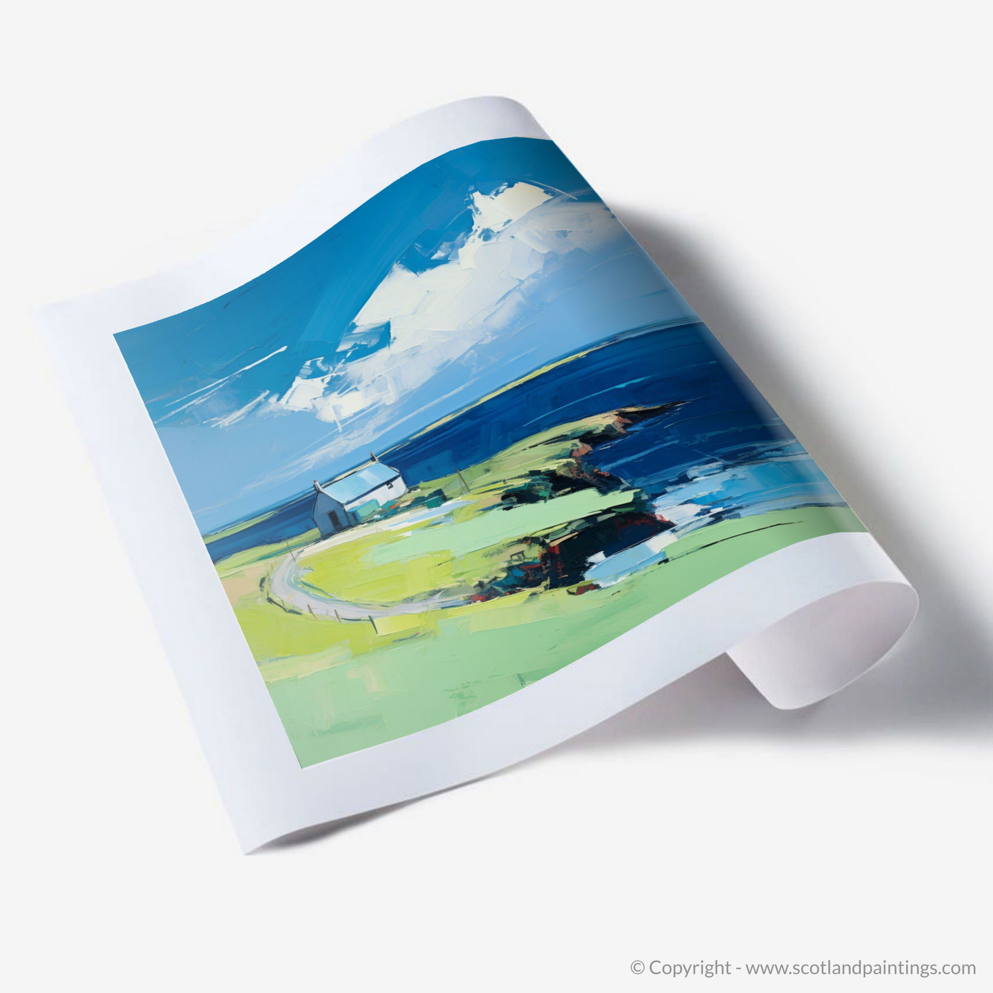 In this work, a solitary white-washed cottage nestles into the landscape, its crisp lines and minimalist form a stark, serene contrast against the fierce dynamism of the Shetland elements. The scene is bathed in an almost tangible light, with expansive skies hosting energetic sweeps of white and pale blue, evoking the feeling of a fresh and brisk Shetland breeze.