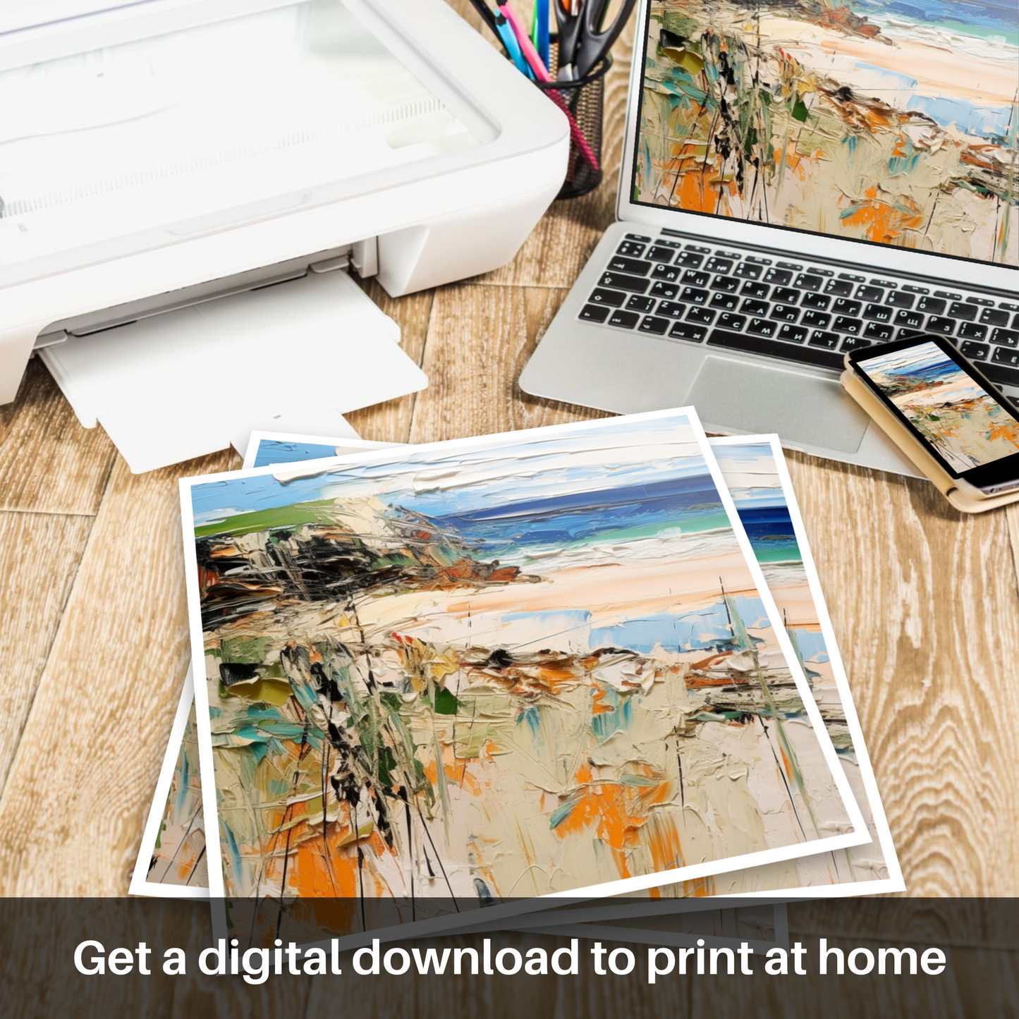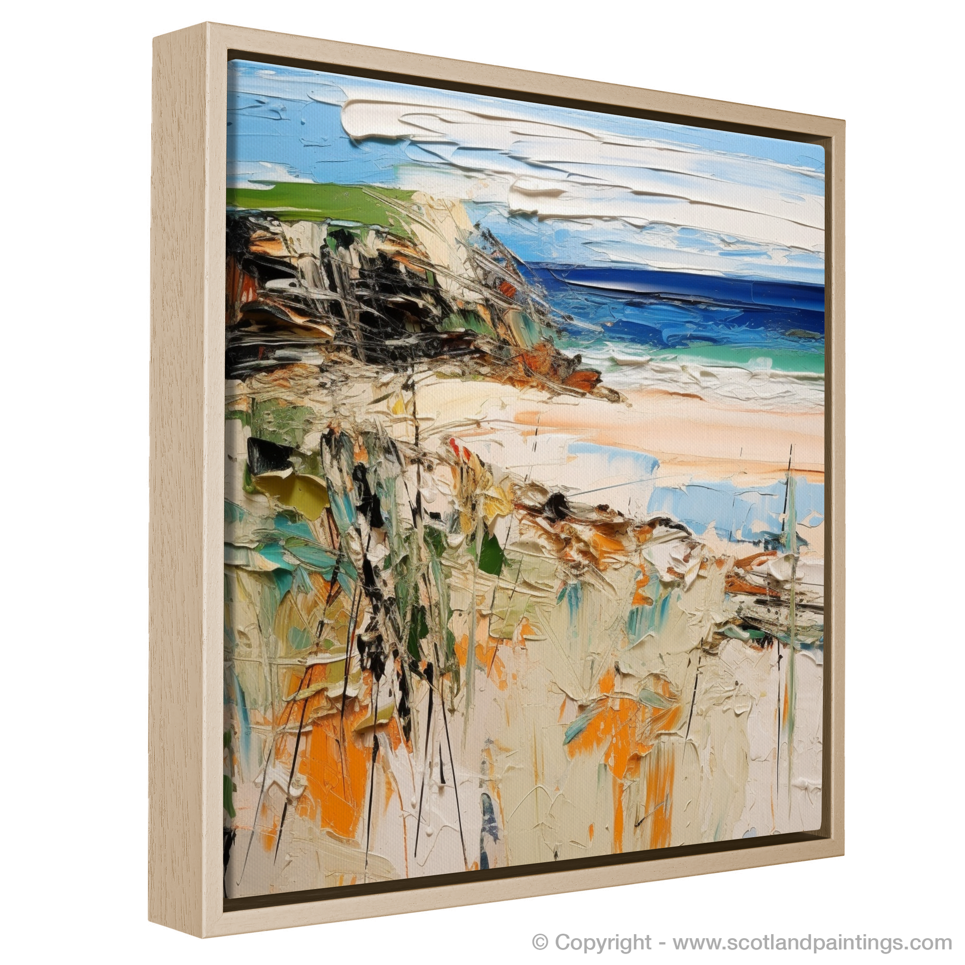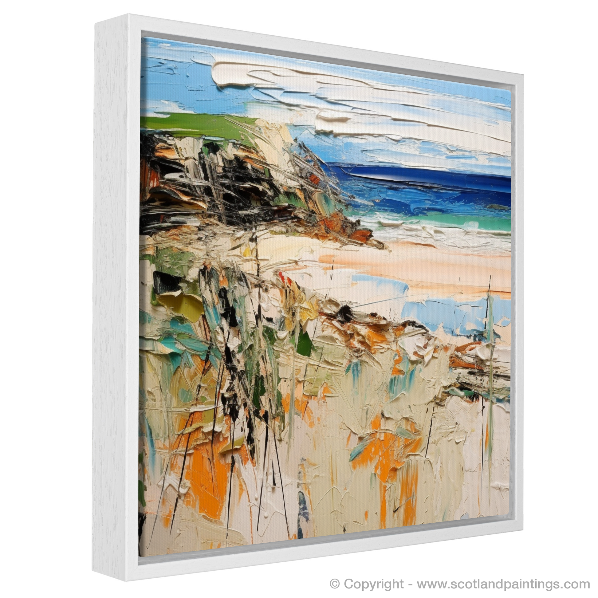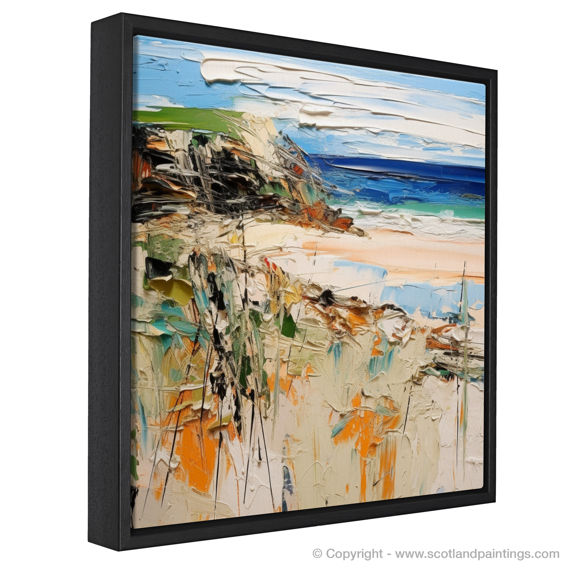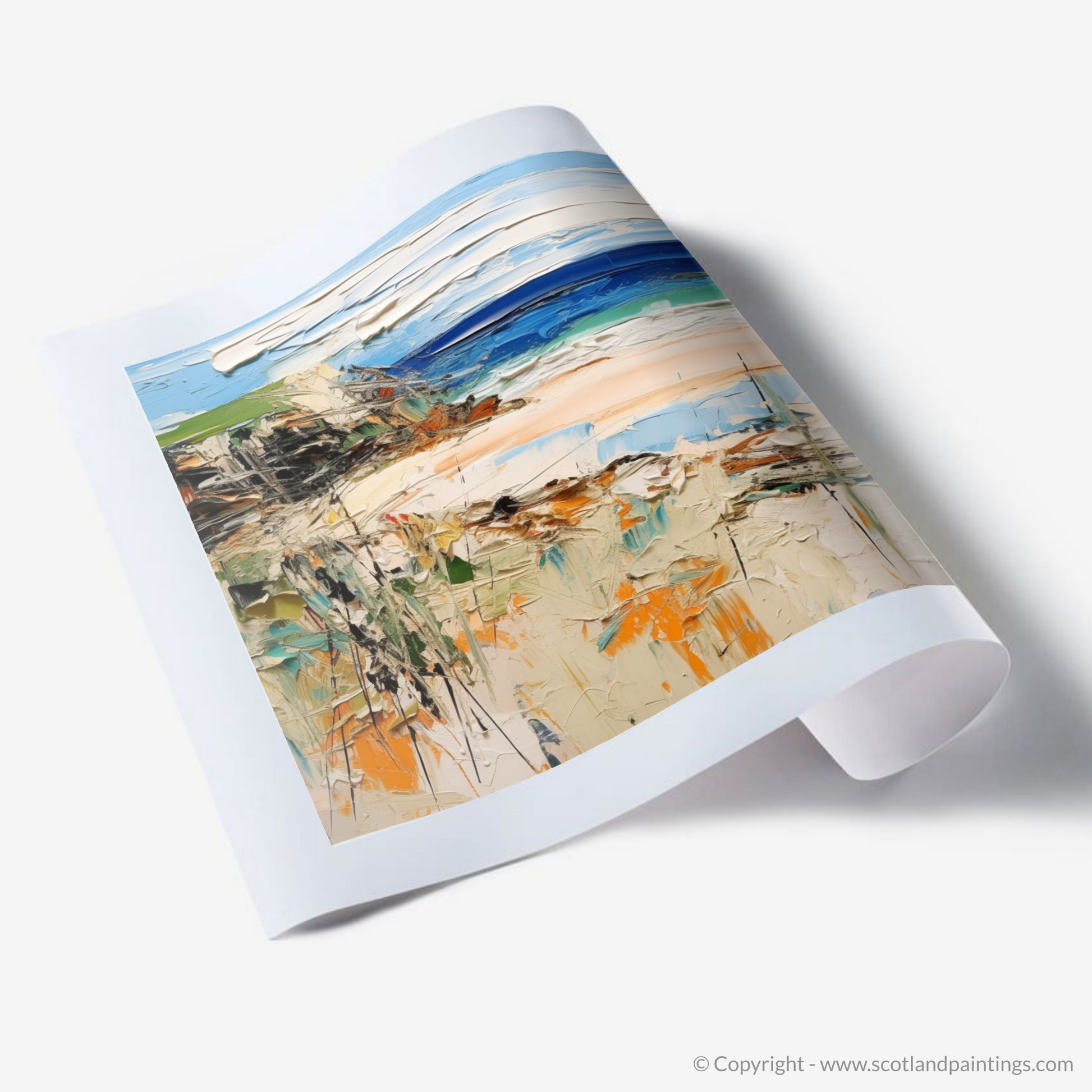 Embrace the elements of Scotland's rugged coast with this evocative print, capturing the untamed spirit of Sandwood Bay in Sutherland. With energetic strokes and a vibrant palette, this piece transports you to a serene cove where the whispers of the sea breeze dance over the canvas.