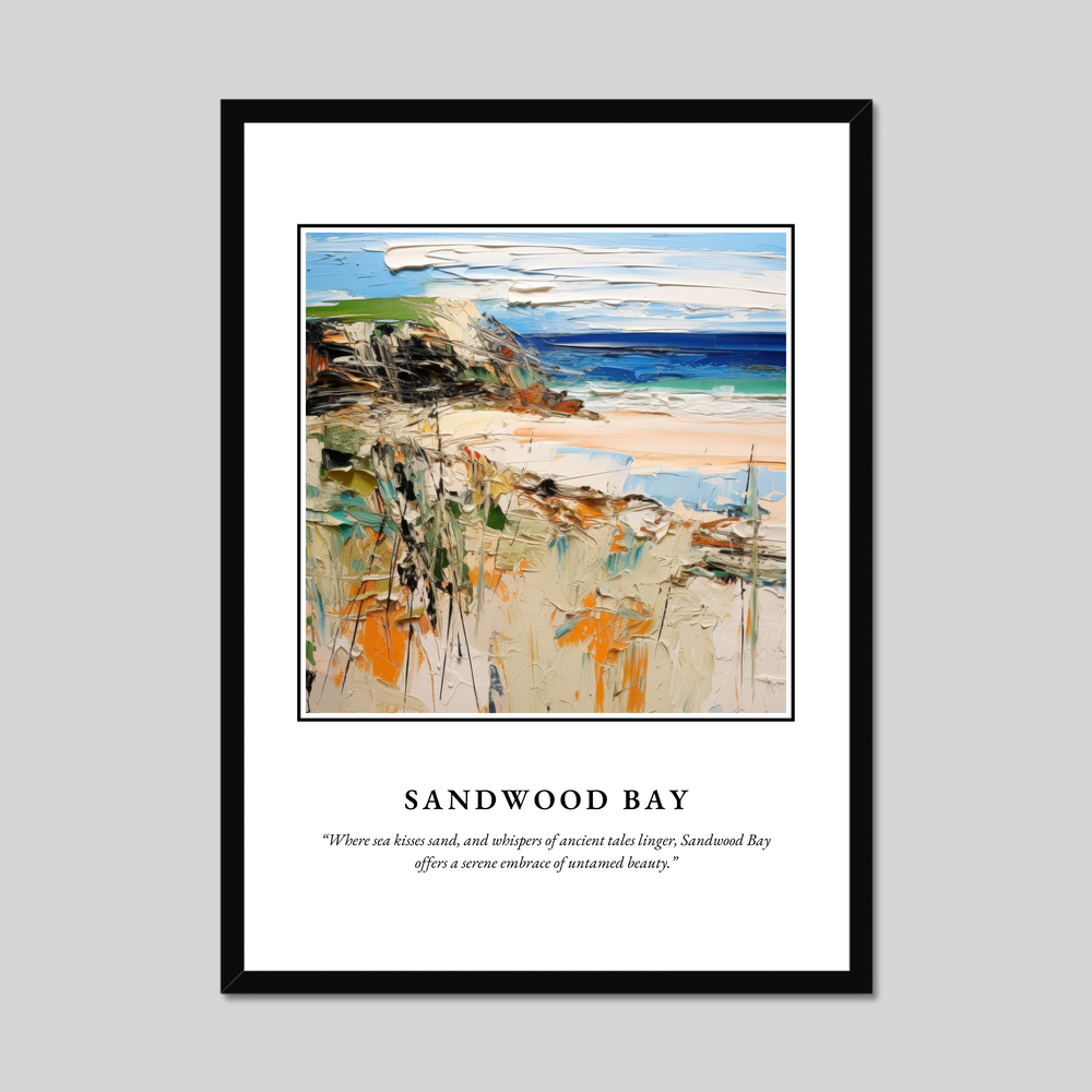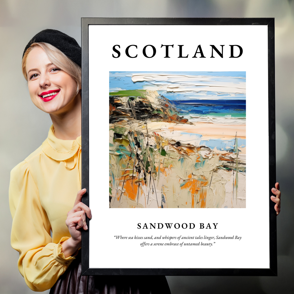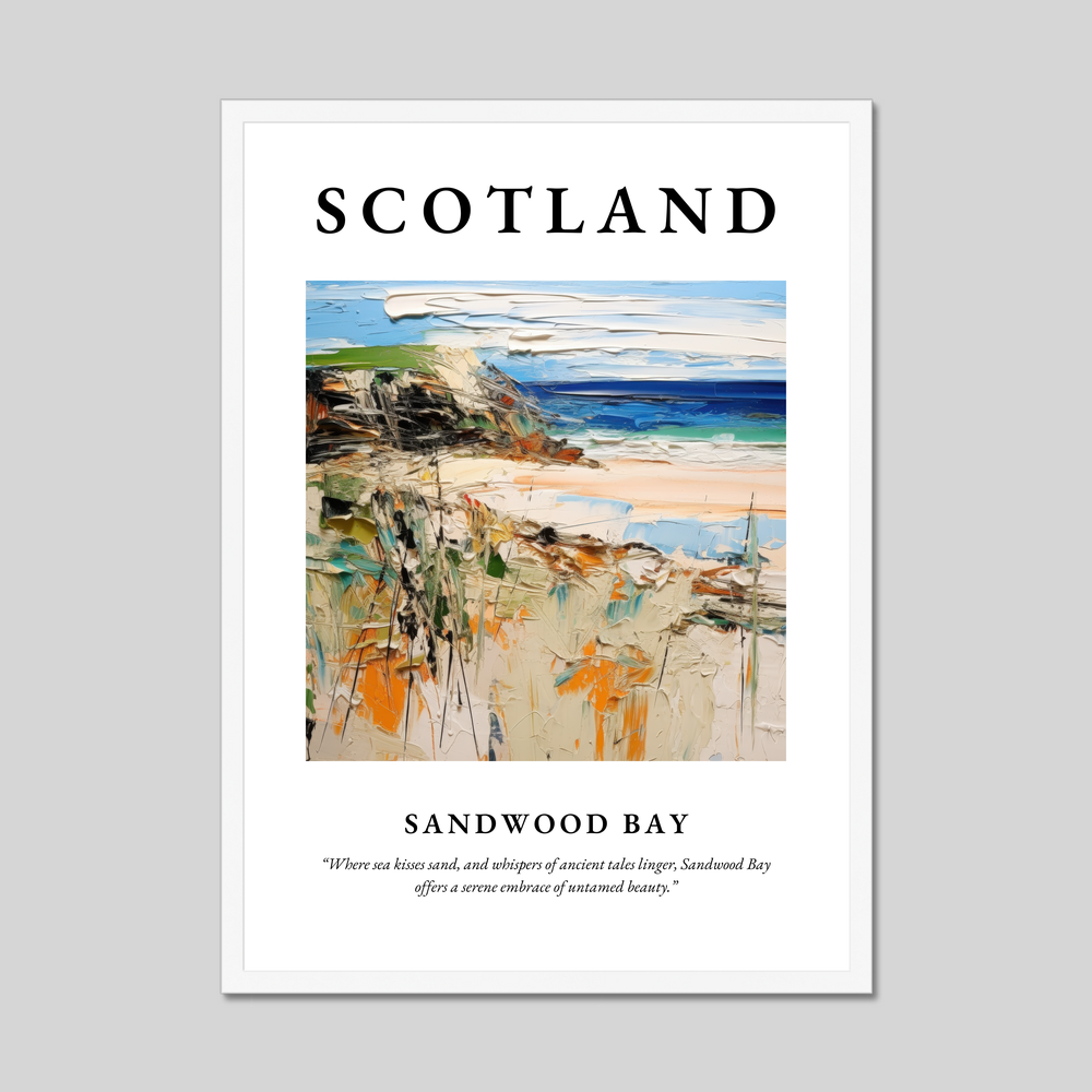 The poster proudly features the bold lettering of “SCOTLAND” at the top, leading to a mesmerising Abstract Impressionism painting of Sandwood Bay. This style, with its expressive brushstrokes and vibrant colours, evokes the raw and untamed beauty of the bay. The swirling hues capture the meeting of land and sea, where blues and greens blend effortlessly with warm earth tones. Beneath the painting, the quote, “Where sea kisses sand, and whispers of ancient tales linger, Sandwood Bay offers a serene embrace of untamed beauty,” invites you to imagine the tranquil allure of this remarkable location.