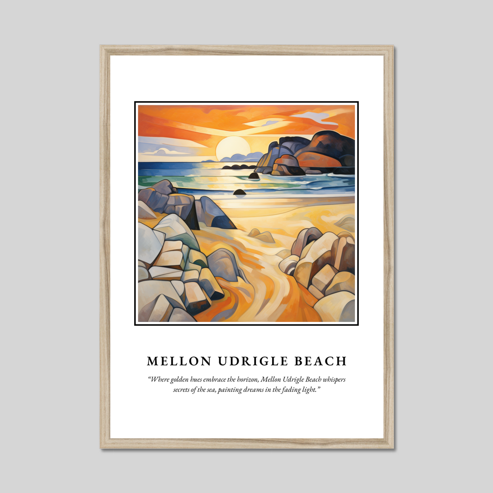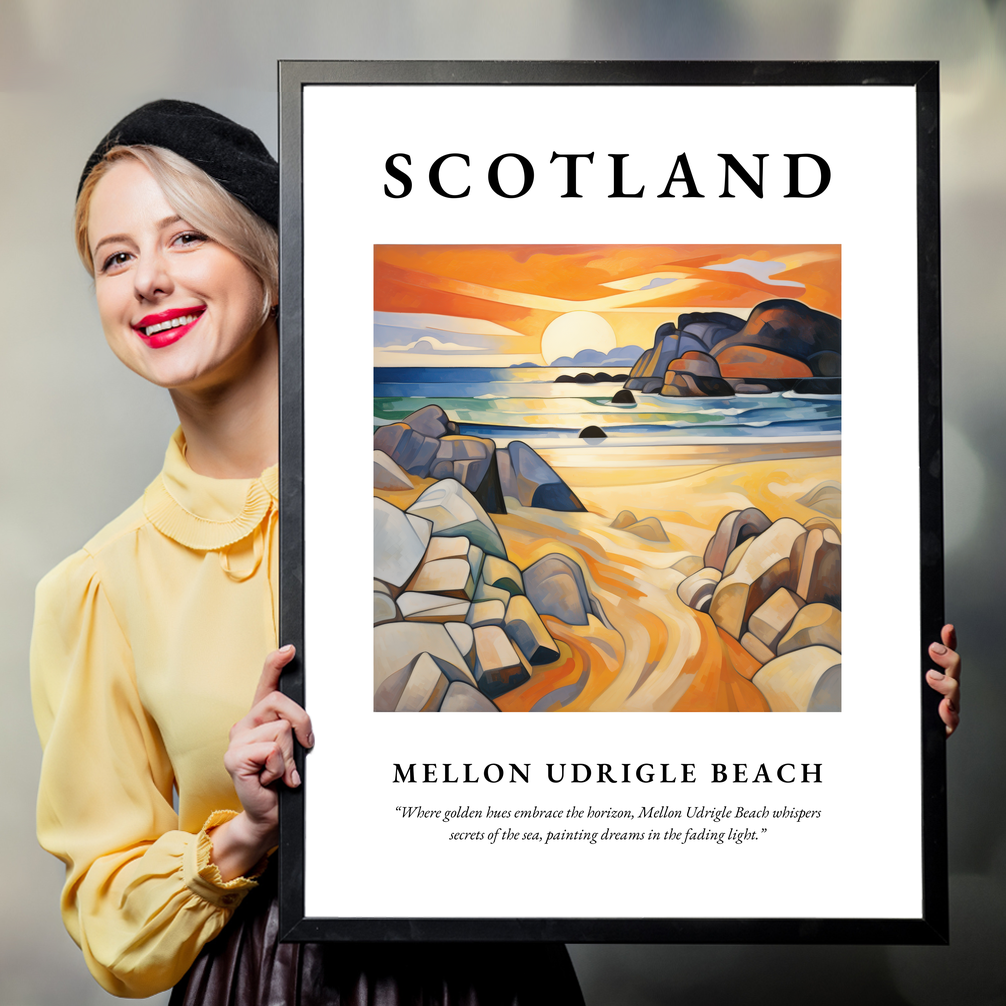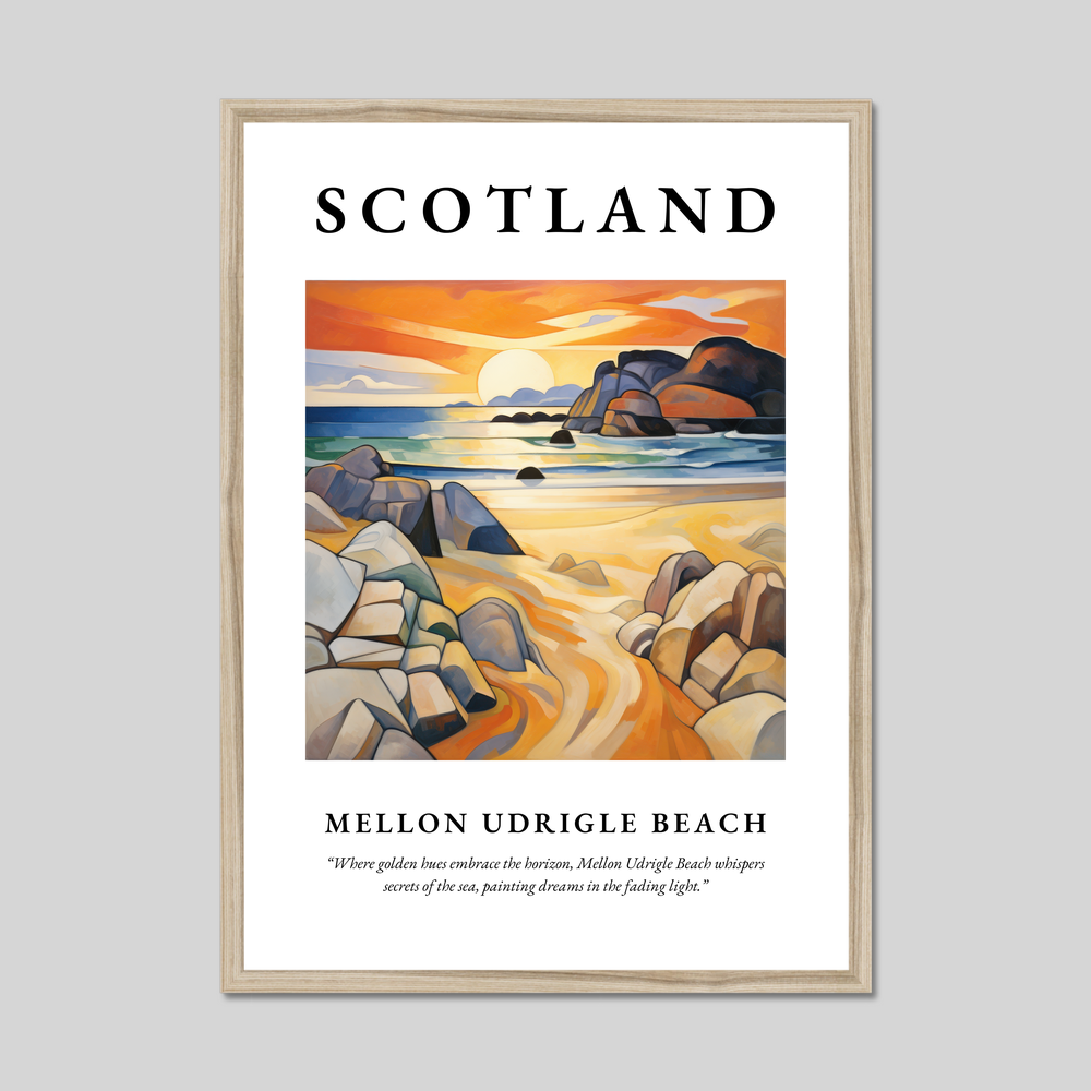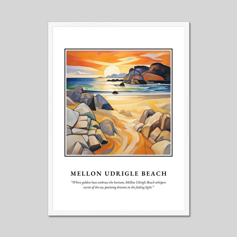 Beneath the artwork lies the poetic musing: “Where golden hues embrace the horizon, Mellon Udrigle Beach whispers secrets of the sea, painting dreams in the fading light.” These words encapsulate the serene beauty and timeless allure of Mellon Udrigle, one of Scotland’s hidden treasures.