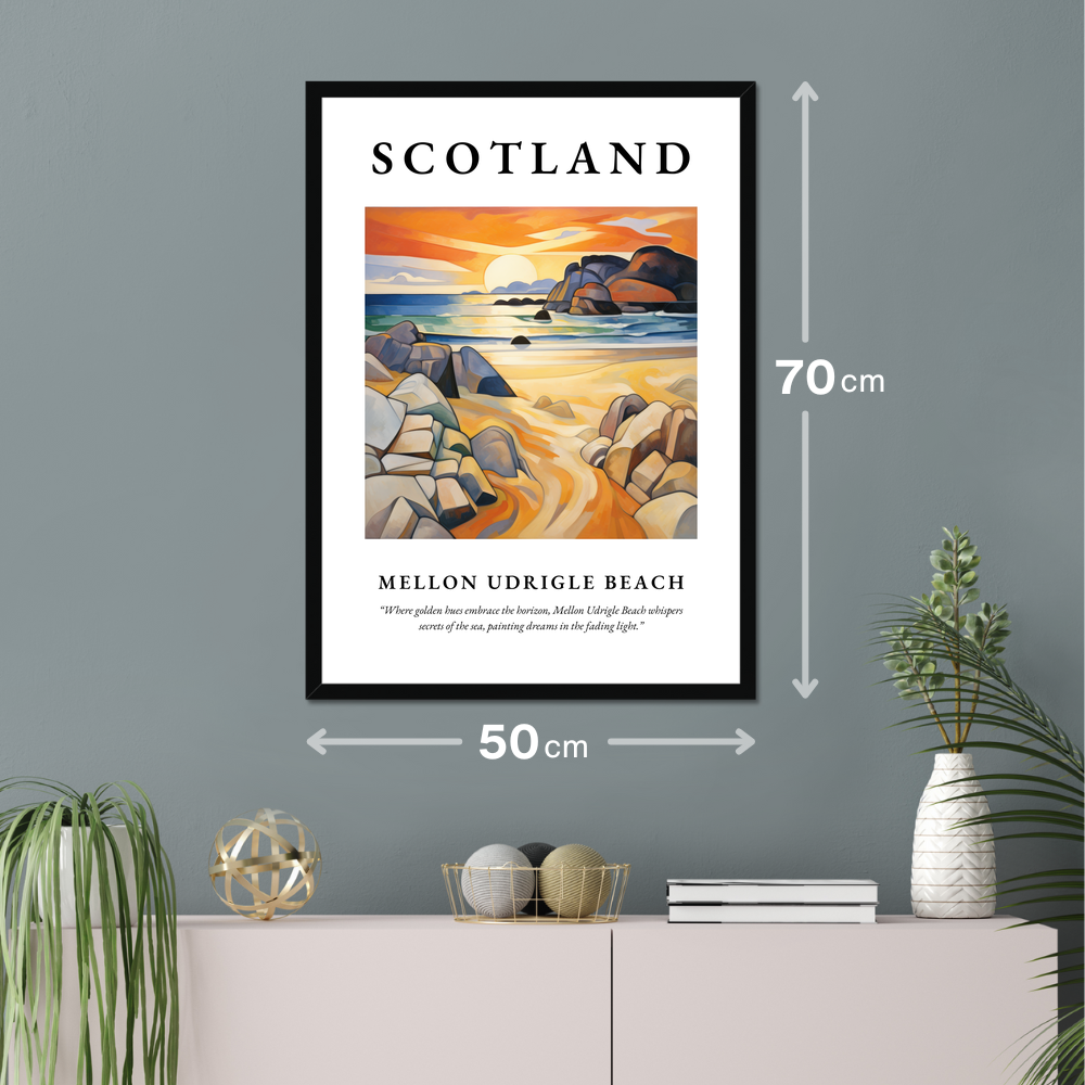 Embrace the beauty of Scotland with a unique addition to your décor that will captivate any art lover or traveller. This 50cm x 70cm framed poster print captures the enchanting Mellon Udrigle Beach in the innovative style of Cubism, turning familiar landscapes into stunning geometric forms. Dominated by the word “SCOTLAND” in bold at the top, it’s a declaration of love for this breathtaking region. The painting below unveils a tapestry of shapes and colours, transforming the natural beauty of the beach into an abstract masterpiece. The composition harmonises the rugged charm of the coast with the golden warmth of sunset hues, inviting viewers to bask in its dreamlike atmosphere.