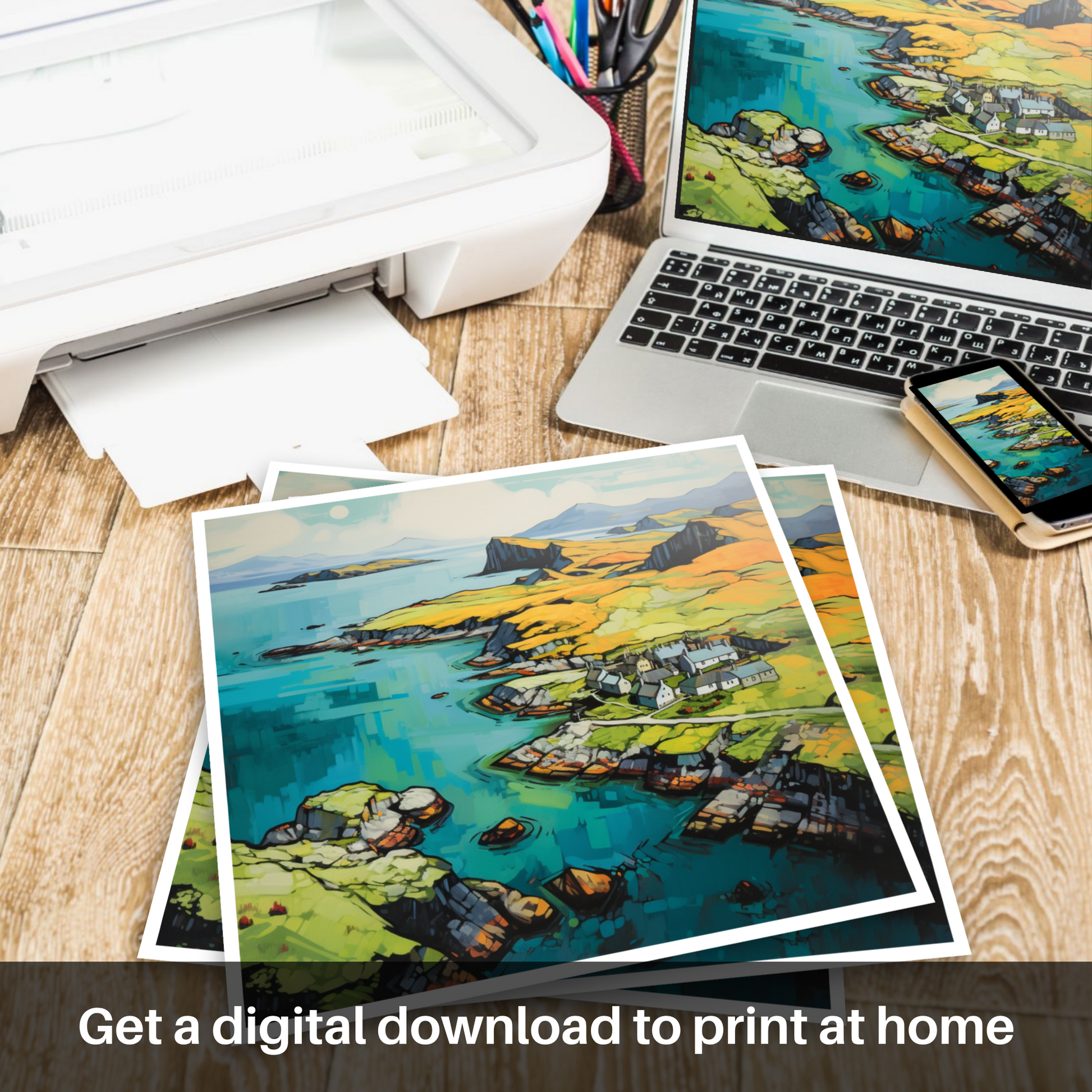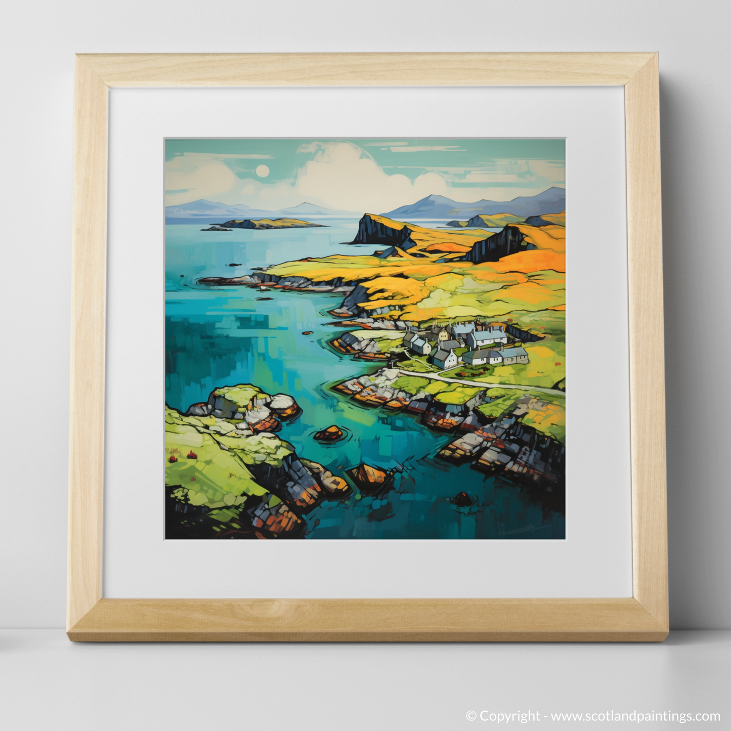 Immerse yourself in the tranquil beauty of Scotland's coastal gem with our evocative print, capturing the essence of the Isle of Skye's lesser-known isles. The piece is brimming with the charm of Naive Art, drawing in viewers with its bold, whimsical strokes and a vibrant palette that ignites the imagination.
