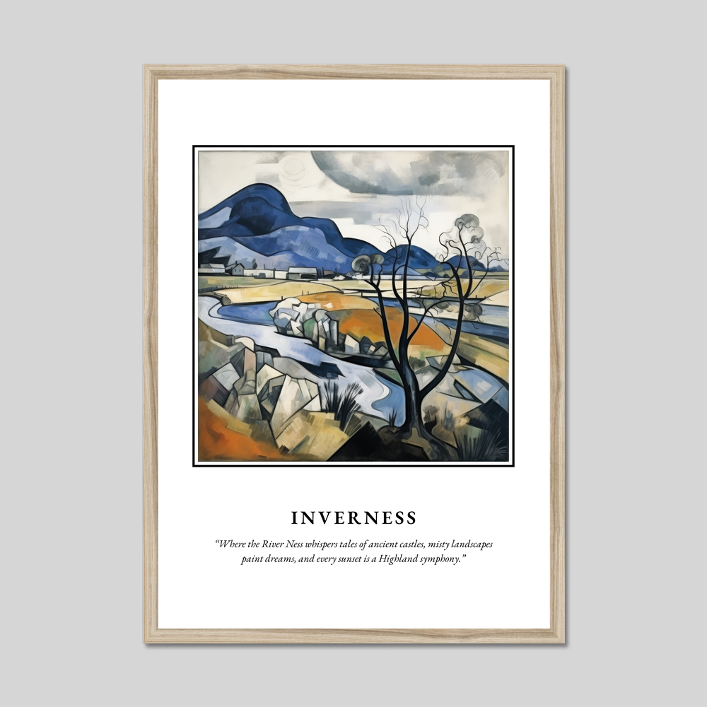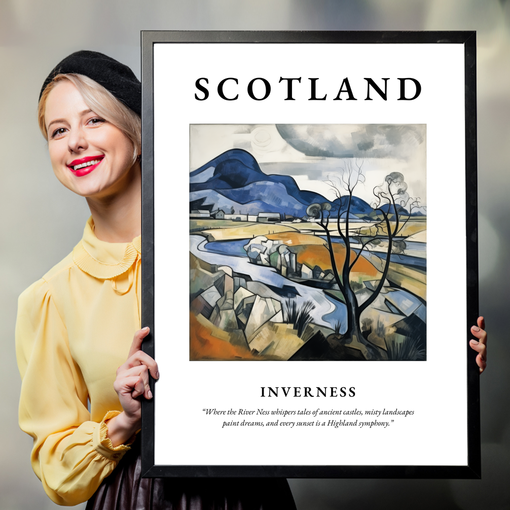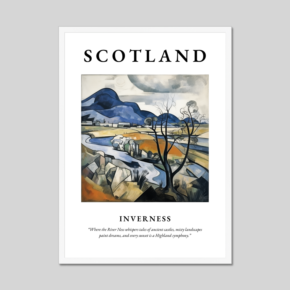 At the top, the word “SCOTLAND” stretches across the poster in big, bold lettering, setting the stage for a visual journey. The central painting, crafted in the Cubism style, reinvents the Highland landscape with a striking blend of geometric shapes and vibrant hues. A tapestry of hills, rivers, and abstract architectural forms comes alive, portraying Inverness in a new, dream-like dimension. A quote beneath whispers tales of ancient castles and misty vistas: “Where the River Ness whispers tales of ancient castles, misty landscapes paint dreams, and every sunset is a Highland symphony,” encapsulating the magical allure of this northern gem.