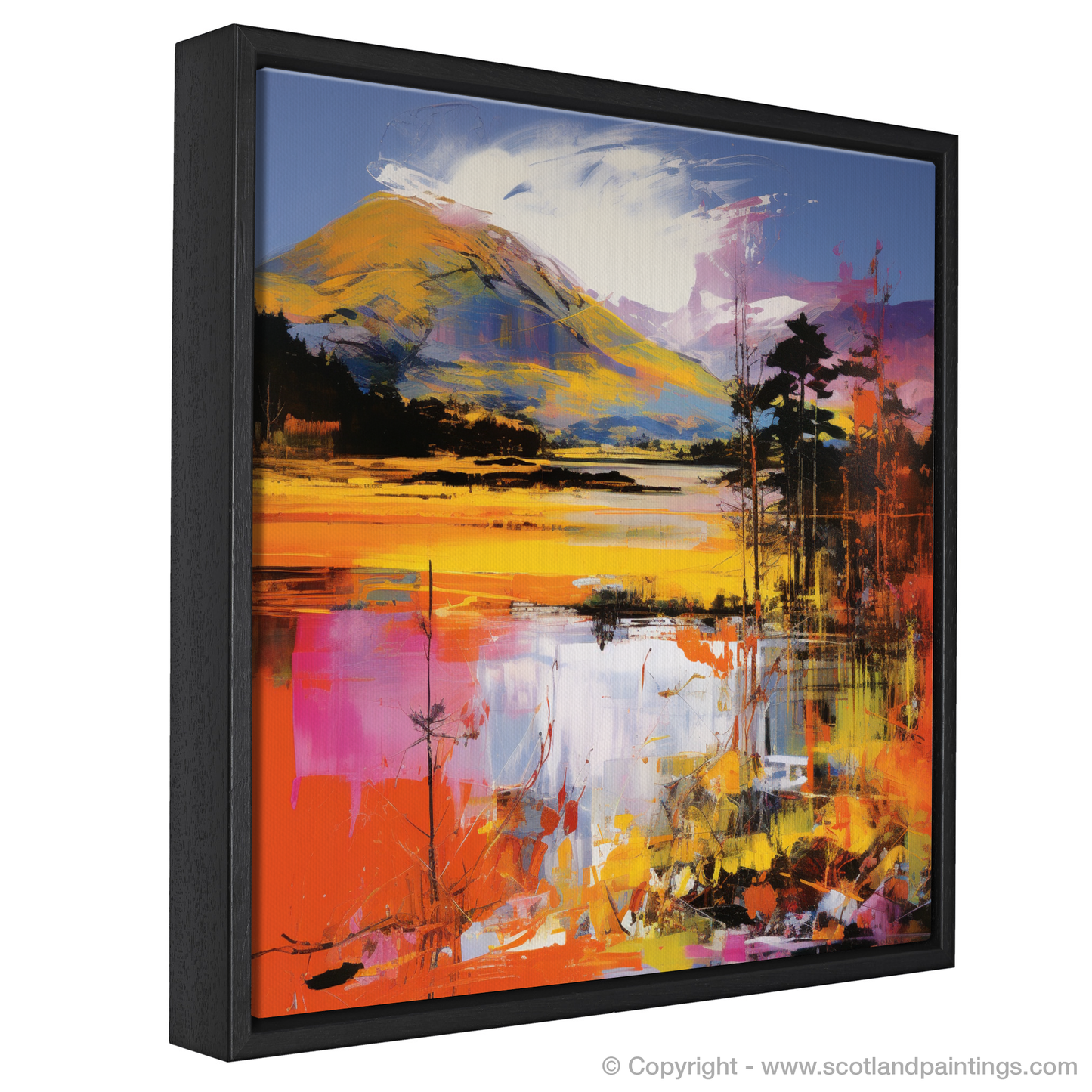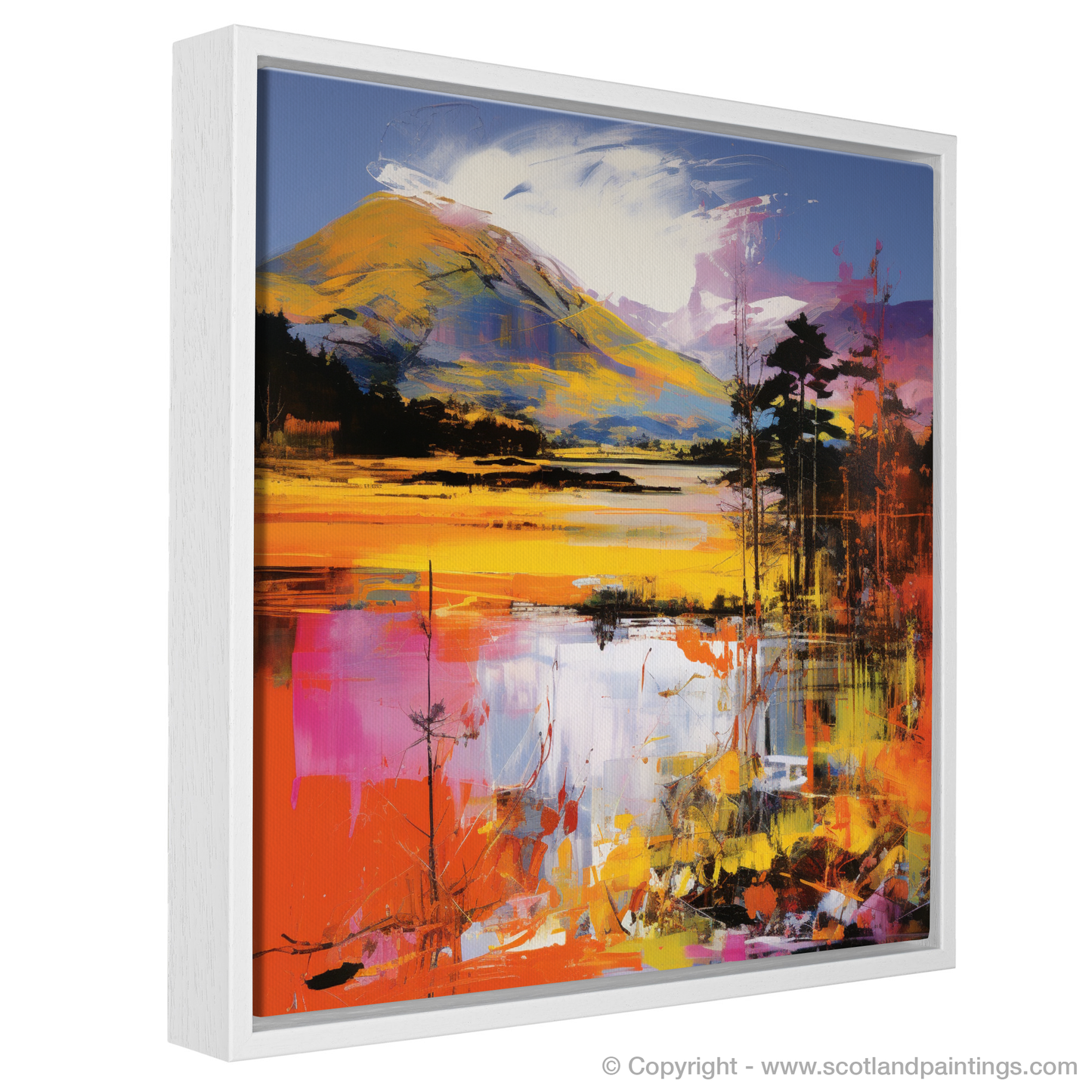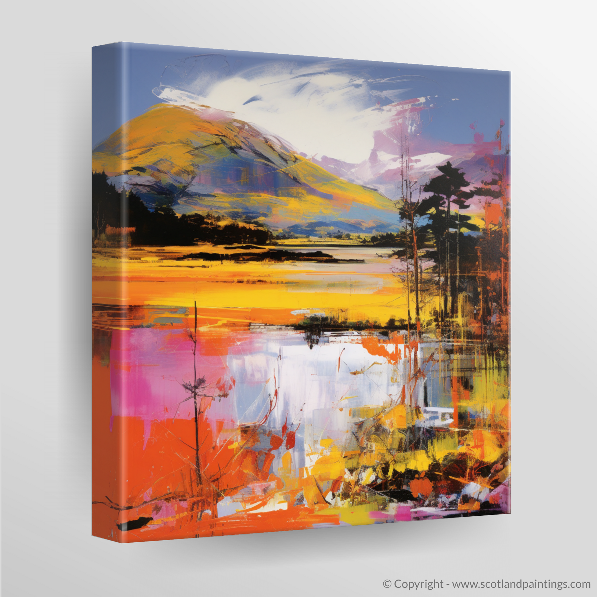 Immerse yourself in the vibrant colours and bold strokes of this evocative print, a striking homage to the dynamic beauty of Loch Lochy in the Scottish Highlands. Splashes of electric orange, fiery red, and radiant yellow animate the scene, injecting it with a life that pulses through the canvas. The sharp contrasts and exaggerated hues hallmark the energetic pop art style, while the spirited abstraction invites viewers to interpret the landscape through a lens of emotion and modernity.