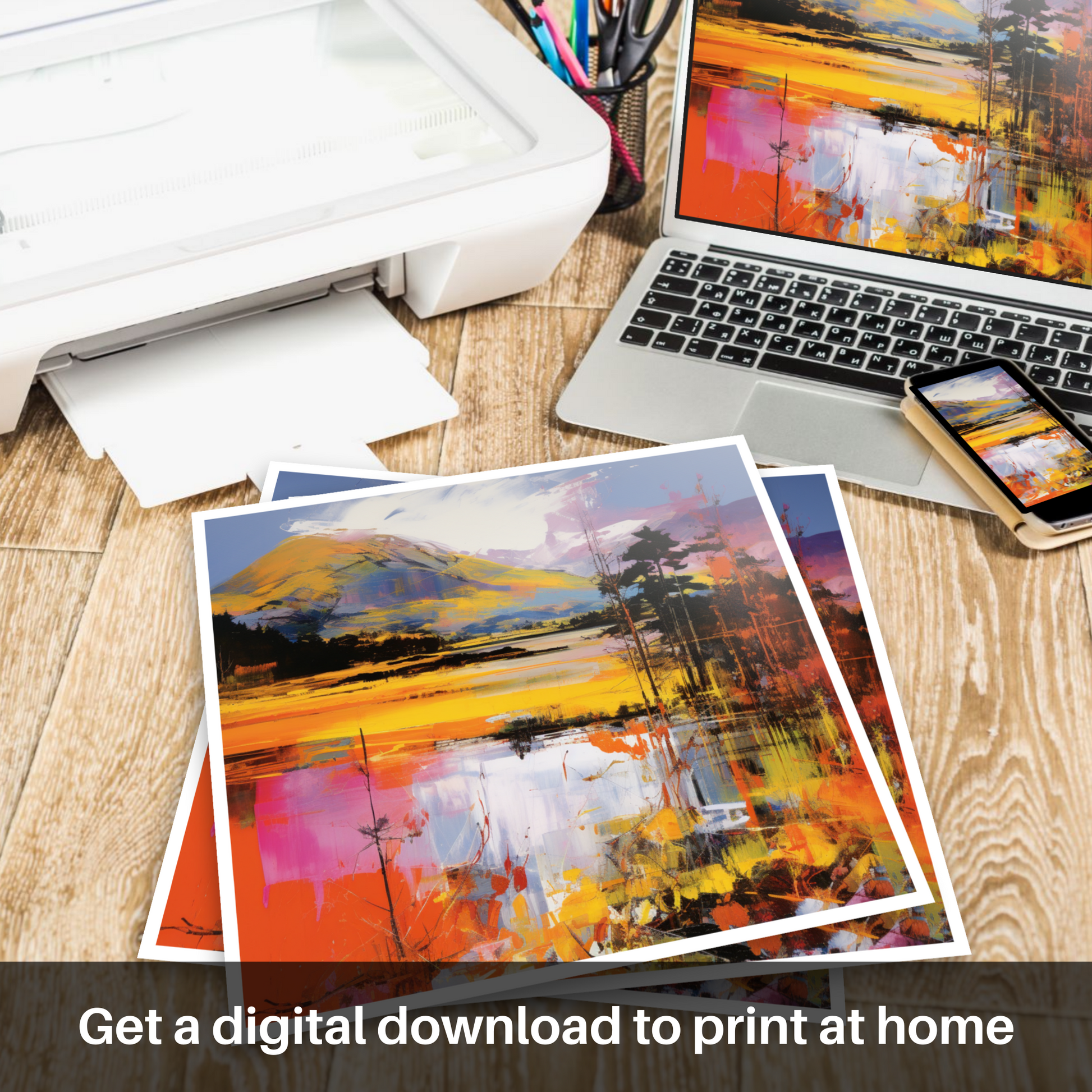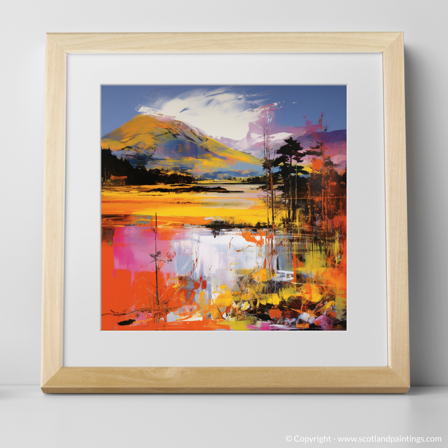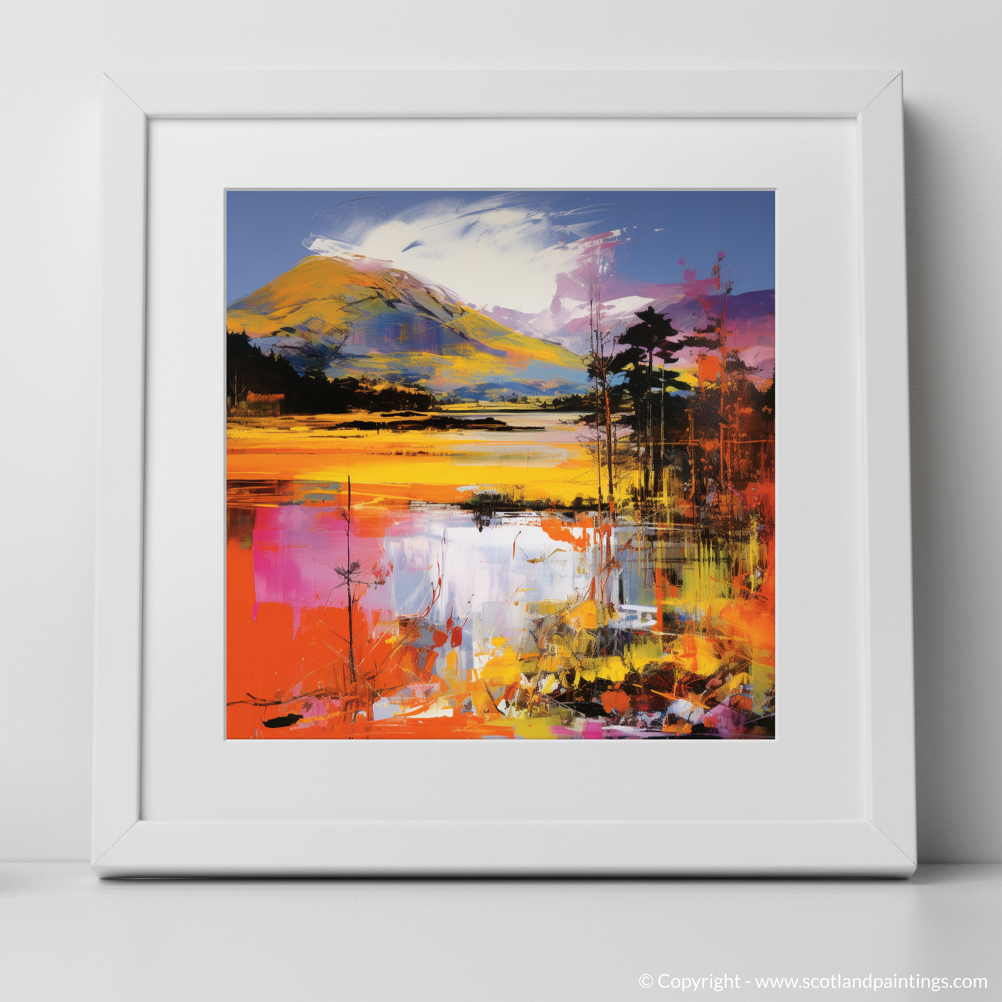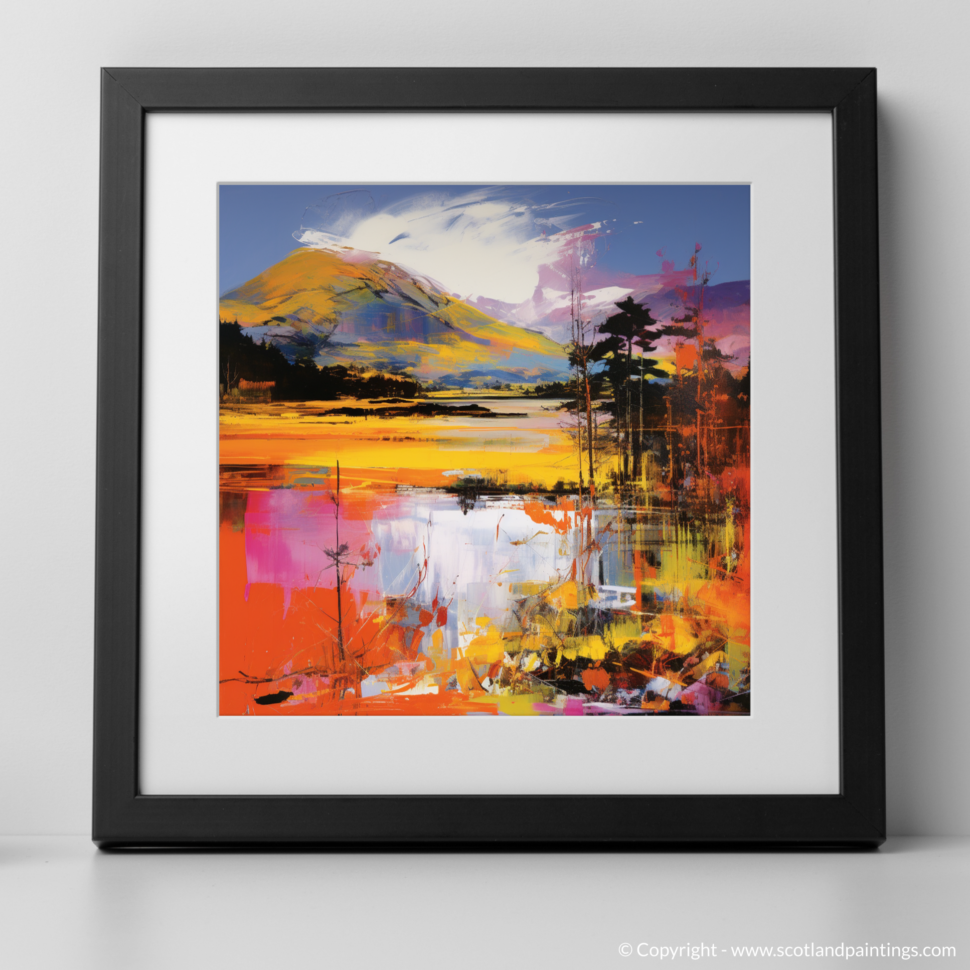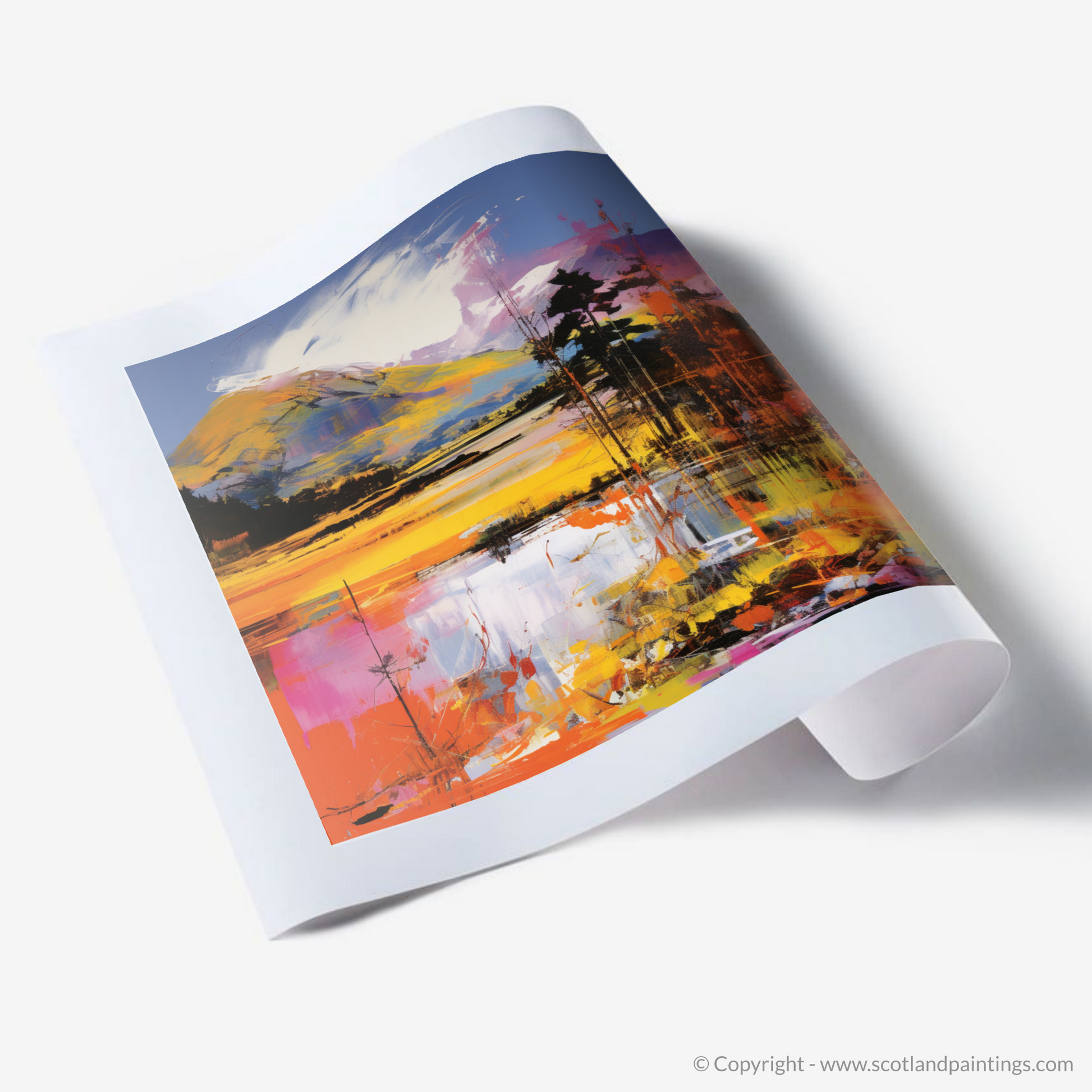 Reflections dance on the surface of the water, mirroring the exuberant sky with splinters of colour that suggest both tranquillity and movement. The illusion of rippling water is achieved through the intentional disarray of brushstrokes, a testament to the transformative power of art to depict the ephemeral beauty of nature. This piece stands as a testament to art's ability to reimagine and reinterpret our world, offering a refreshing take on the illustrious Scottish landscape that will captivate and inspire in equal measure.