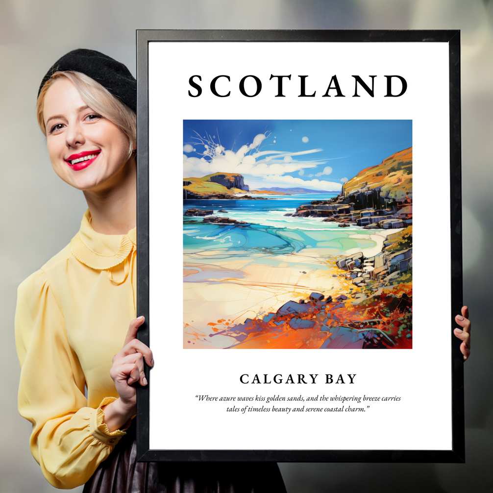 At the top of this large-scale poster, bold lettering spells out "SCOTLAND," immediately drawing you into the scenic allure of the country. Below, a mesmerising painting captures the essence of Calgary Bay, where expressive brush strokes and vivid colours breathe life into the azure waves and golden sands. The composition is a dance of electric blues and warm oranges, masterfully conveying both the ruggedness and serenity of this coastal haven. Beneath the painting, the serene quote reads, “Where azure waves kiss golden sands, and the whispering breeze carries tales of timeless beauty and serene coastal charm.”
