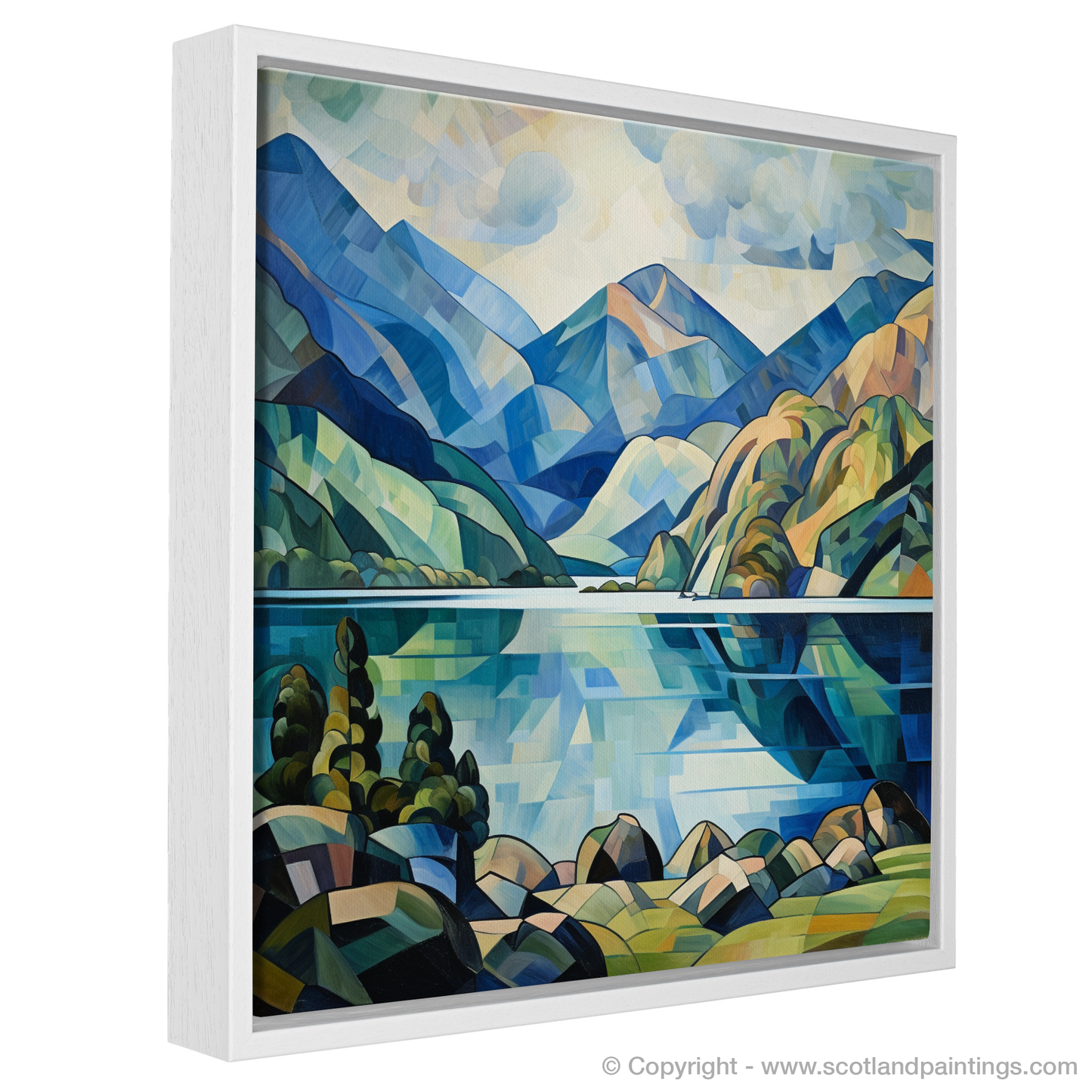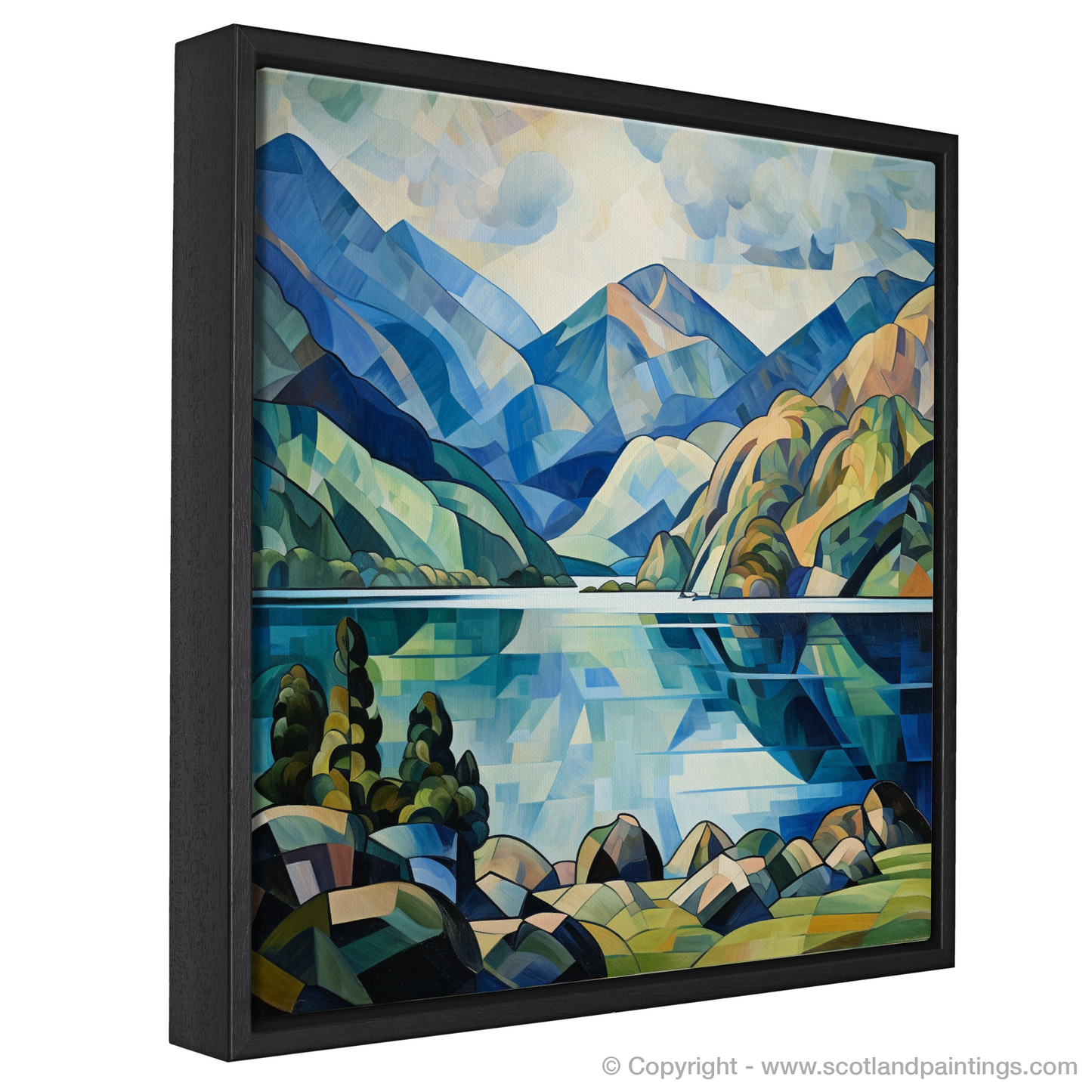 The work unfolds in a symphony of angular lines and contrasting shapes that deconstruct the serene beauty of the loch into a series of intersecting planes. Bold blues and verdant greens dominate the composition, evoking the vibrant palette of nature, while the refracted light on the water's surface dances with crystalline precision.