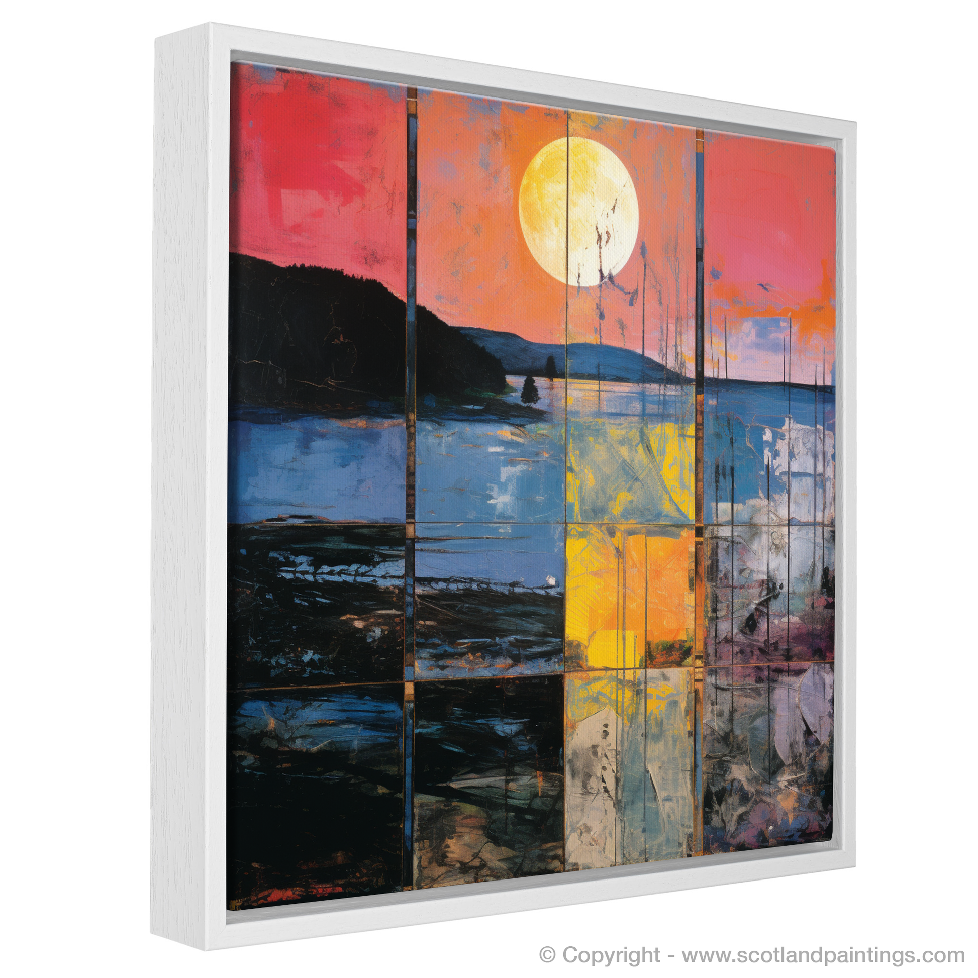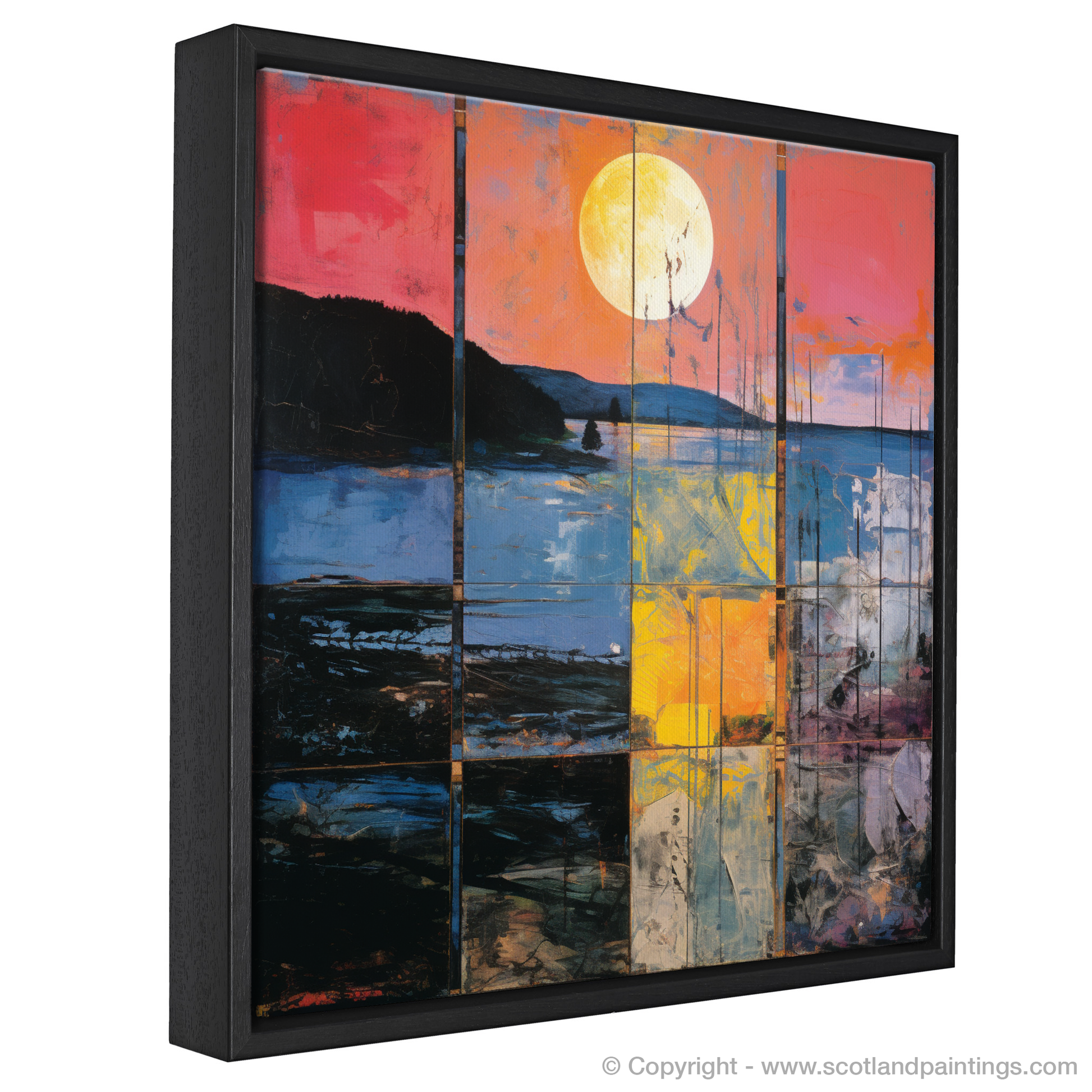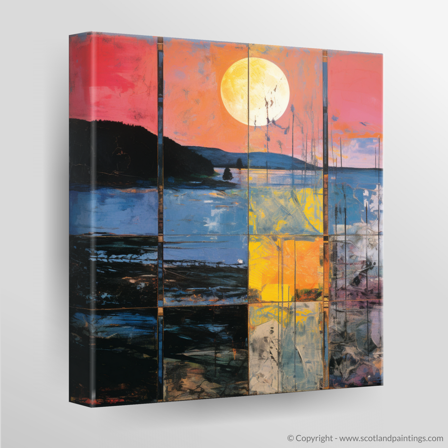 Darkened silhouettes of the surrounding landscape trace the bay's natural contours, suggestive of rugged highlands and the serene expanse of water that mirrors the sky's capricious palette. Textured strokes and abstract motifs suggestively recreate the water's reflective dance with the retreating light, granting the piece a palpable vitality.