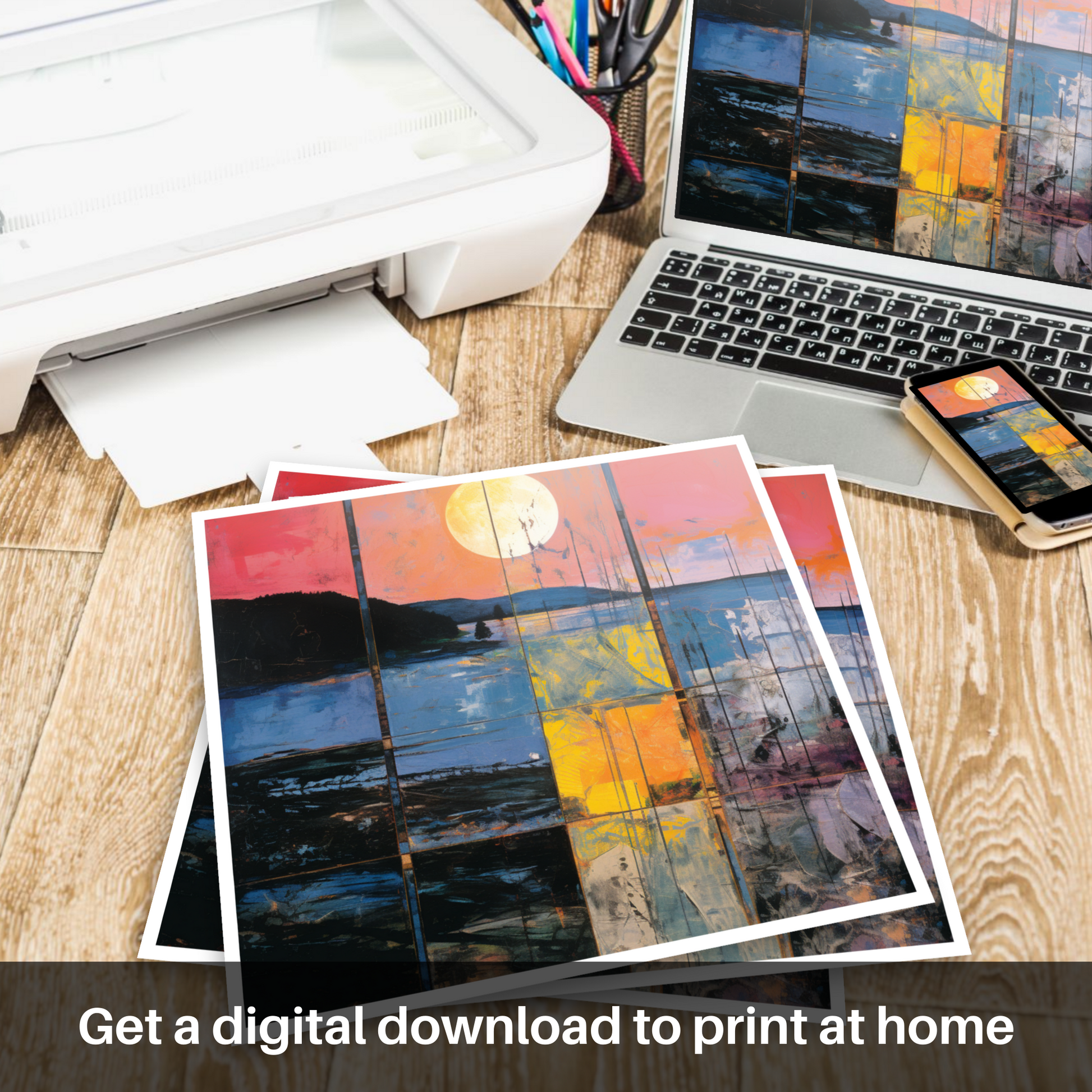 With its bold approach to color and form, this print is a celebration of Scottish beauty, filtered through the dynamic energy of Pop Art. It becomes a statement piece ideal for lovers of modern art and the enchanting landscapes of Scotland, evoking the magnetic charm of Lochinver Bay at the most magical time of day.