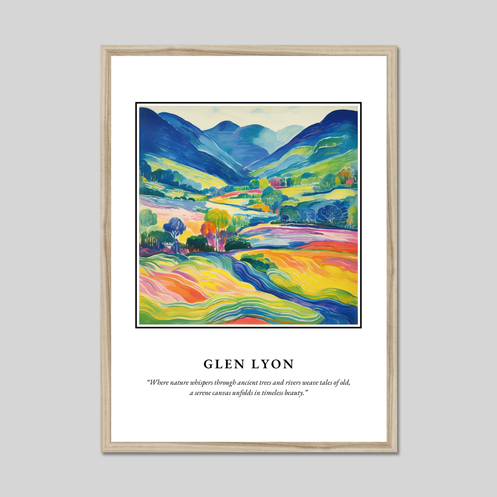 The poster elegantly presents the word "SCOTLAND" in bold lettering above a stunning Color Field painting of Glen Lyon. The painting bursts with vivid colours, capturing the glen's sweeping skies, rolling hills, and whispers of nature that speak through every brushstroke. Below the painting lies a poetic quote: “Where nature whispers through ancient trees and rivers weave tales of old, a serene canvas unfolds in timeless beauty.” Available in black, white, or natural wood-effect frames, this artwork perfectly complements any decor style while reflecting the tranquil vibes of the Scottish highlands.