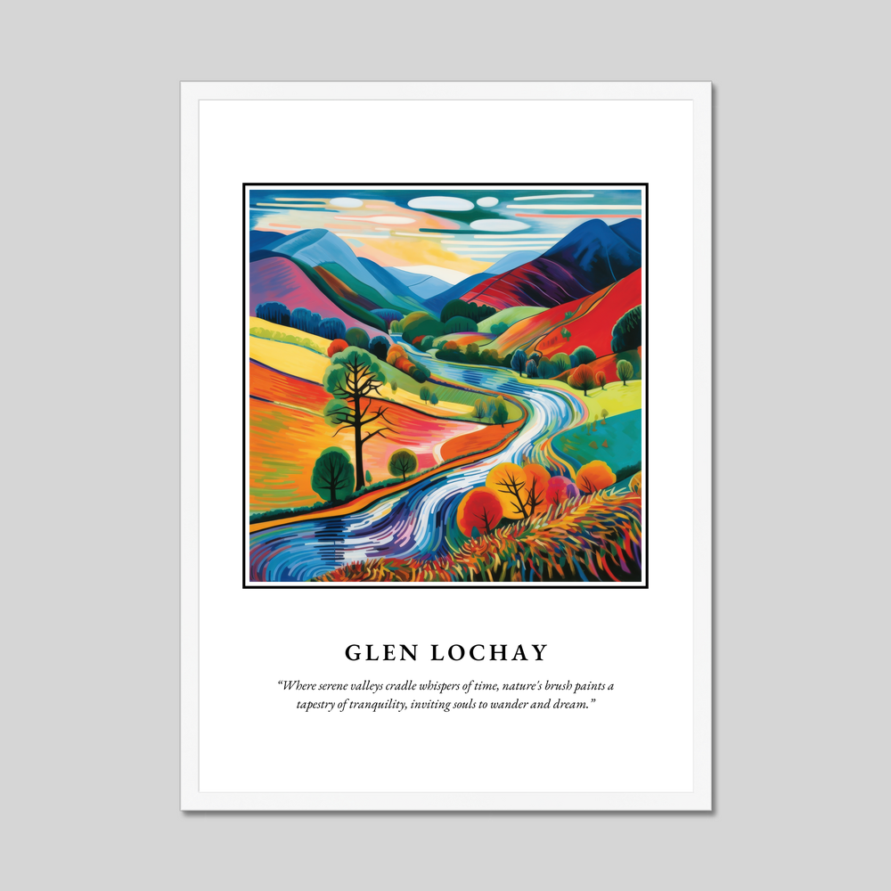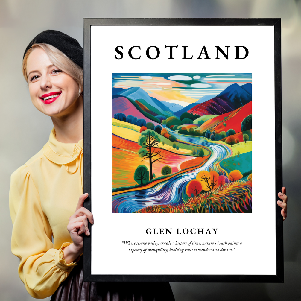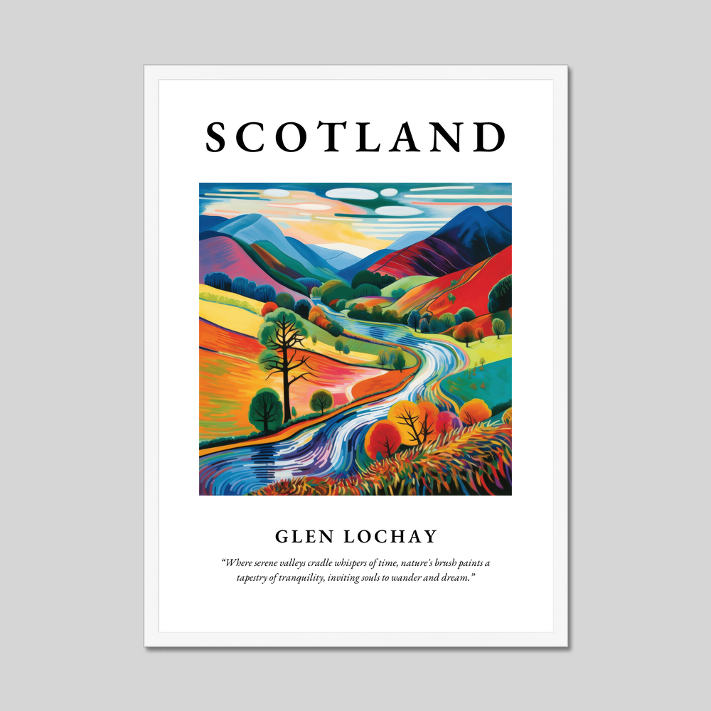 At the top of the print, the word "SCOTLAND" stands proudly in big, bold lettering, drawing immediate attention and evoking a sense of cultural pride. Below, the vibrant Pop Art depiction of Glen Lochay bursts with vivid colours and dynamic lines, capturing the essence of this serene valley. The painting portrays the lush valleys and winding streams in a palette that’s both eye-catching and thought-provoking, making it a perfect piece for art lovers who appreciate the Pop Art movement's flair and vibrancy. Underneath the stunning painting, a poetic quote reads, "Where serene valleys cradle whispers of time, nature's brush paints a tapestry of tranquillity, inviting souls to wander and dream," inviting you to explore and reflect on this breathtaking landscape.