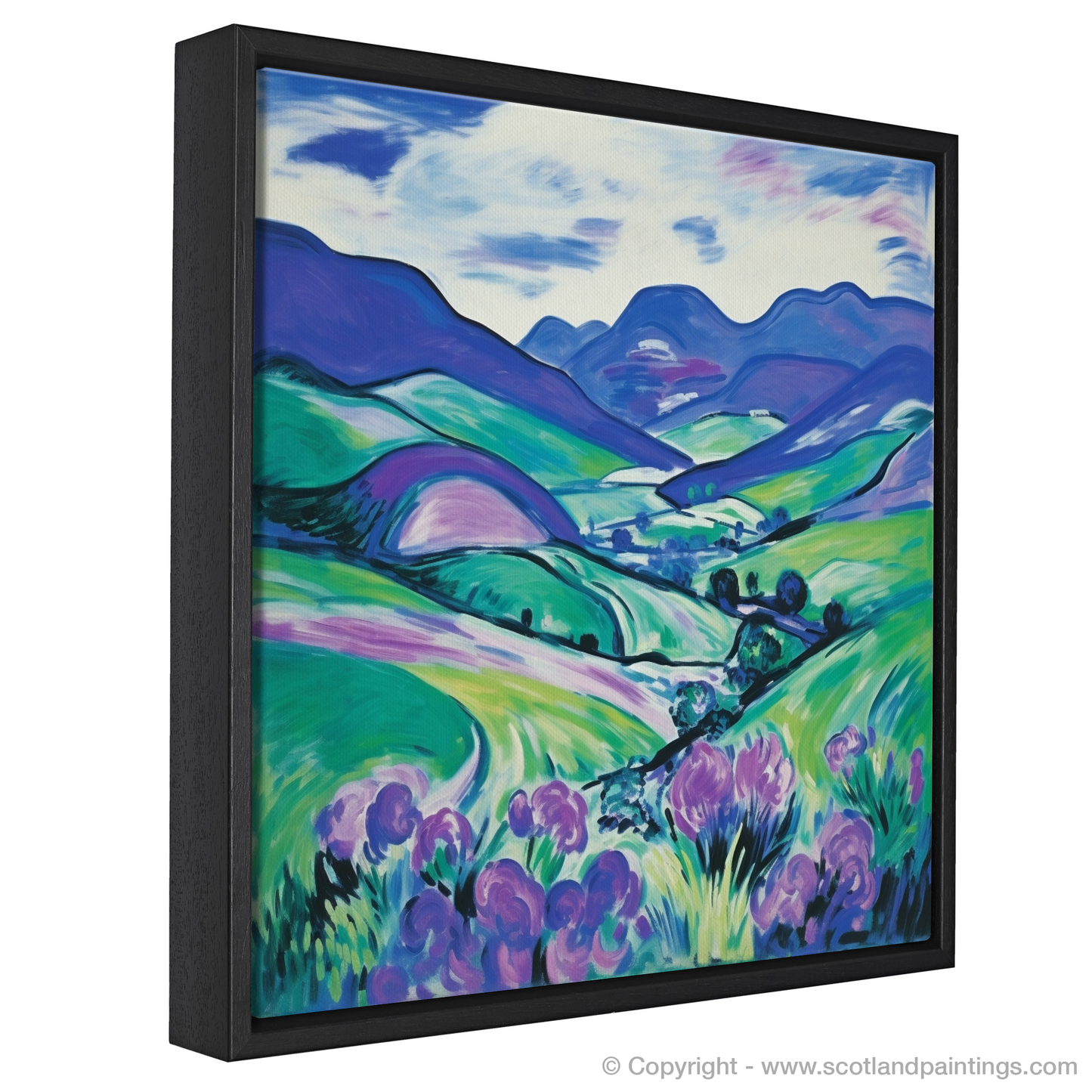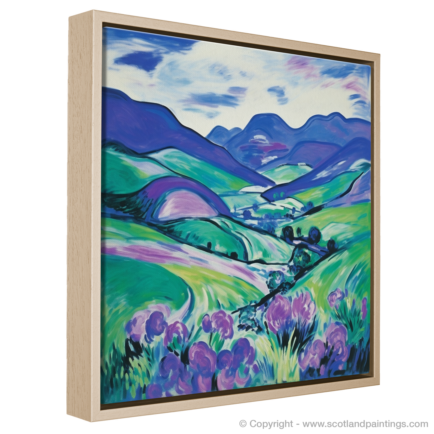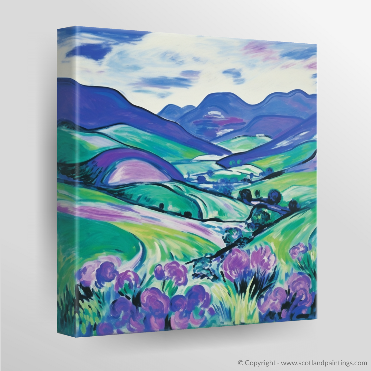 Bold, untamed strokes of rich purples and blues compose the enigmatic mountain ranges which undulate rhythmically across the canvas, evoking the enigmatic presence of Ben Macdui in the Cairngorms National Park. Lush green valleys dance with playful patches of violet, as the abstracted landscape conveys the wild and unspoiled beauty of the Highlands. In the foreground, whimsical florals in shades of vibrant lavender and gentle pinks add a touch of warmth and bring the Scottish moorlands to life.