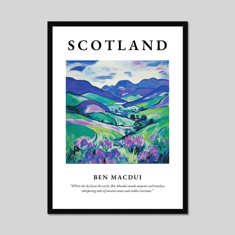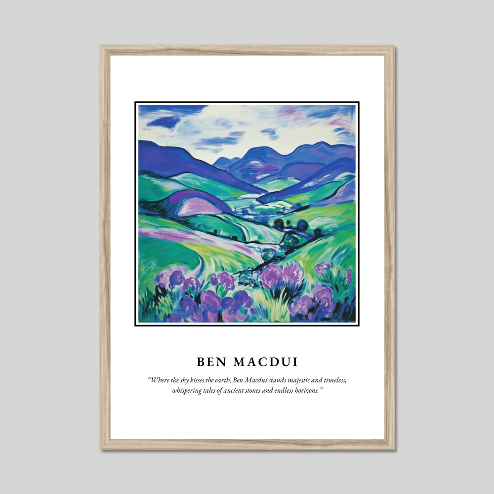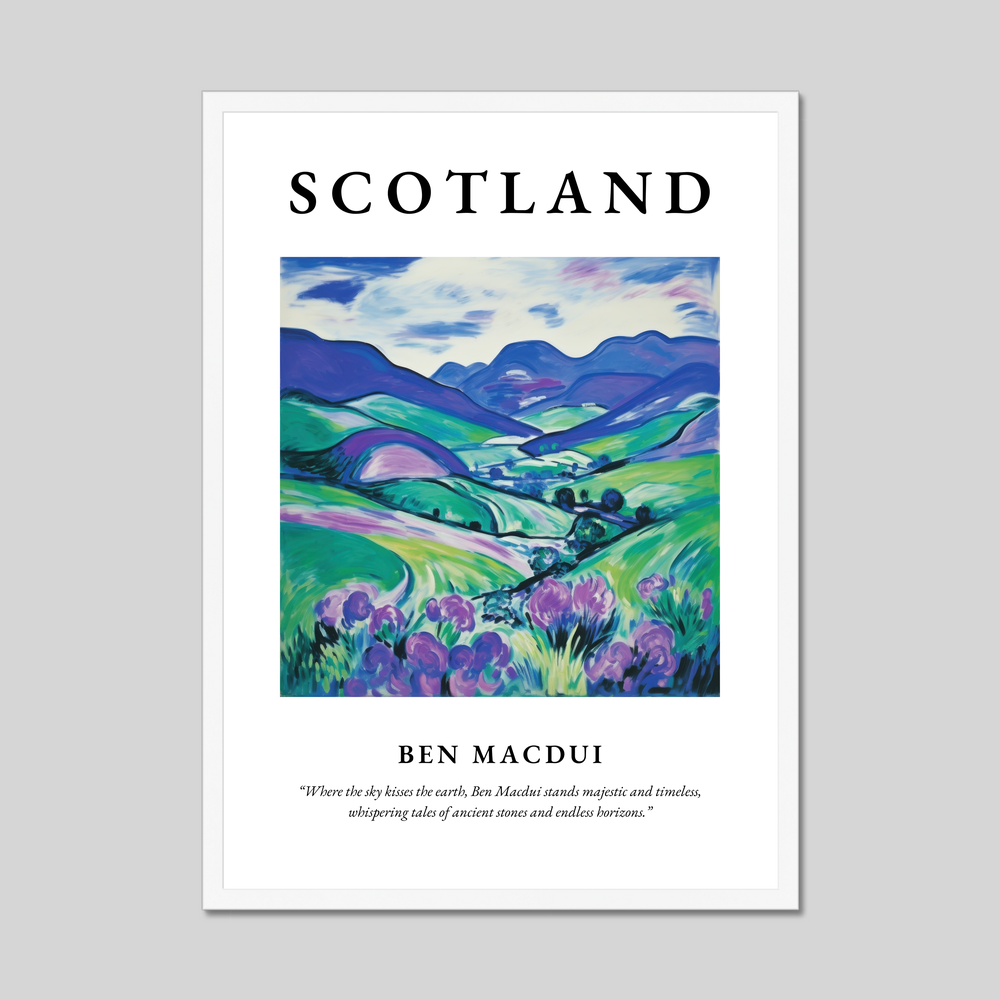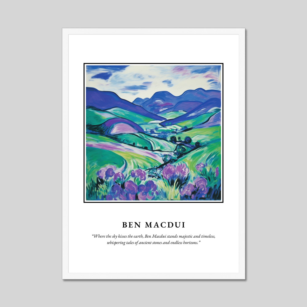 At the top, the powerful name “SCOTLAND” in big, bold lettering sets the scene for the journey your eyes are about to take. Below, a mesmerising representation of Ben Macdui in the Fauvism style brings the highlands to life with vivid, expressive colours. The landscape is awash with dynamic blues and greens, and a hint of purple in the foreground suggests the wild heather that carpets the terrain. Beneath this artistic marvel is a romantic quote: “Where the sky kisses the earth, Ben Macdui stands majestic and timeless, whispering tales of ancient stones and endless horizons.”