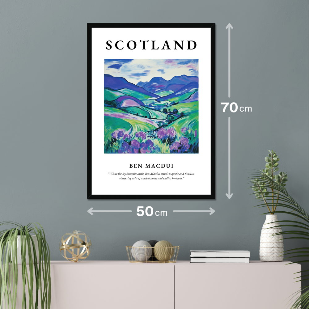 Transform your space with this striking framed poster print from our “Scottish Mountains” collection, a perfect homage to the breathtaking beauty of Ben Macdui. Measuring an impressive 50cm x 70cm, this large artwork captivates with its vibrant colours and bold design, effortlessly covering a wide wall area without breaking the bank.