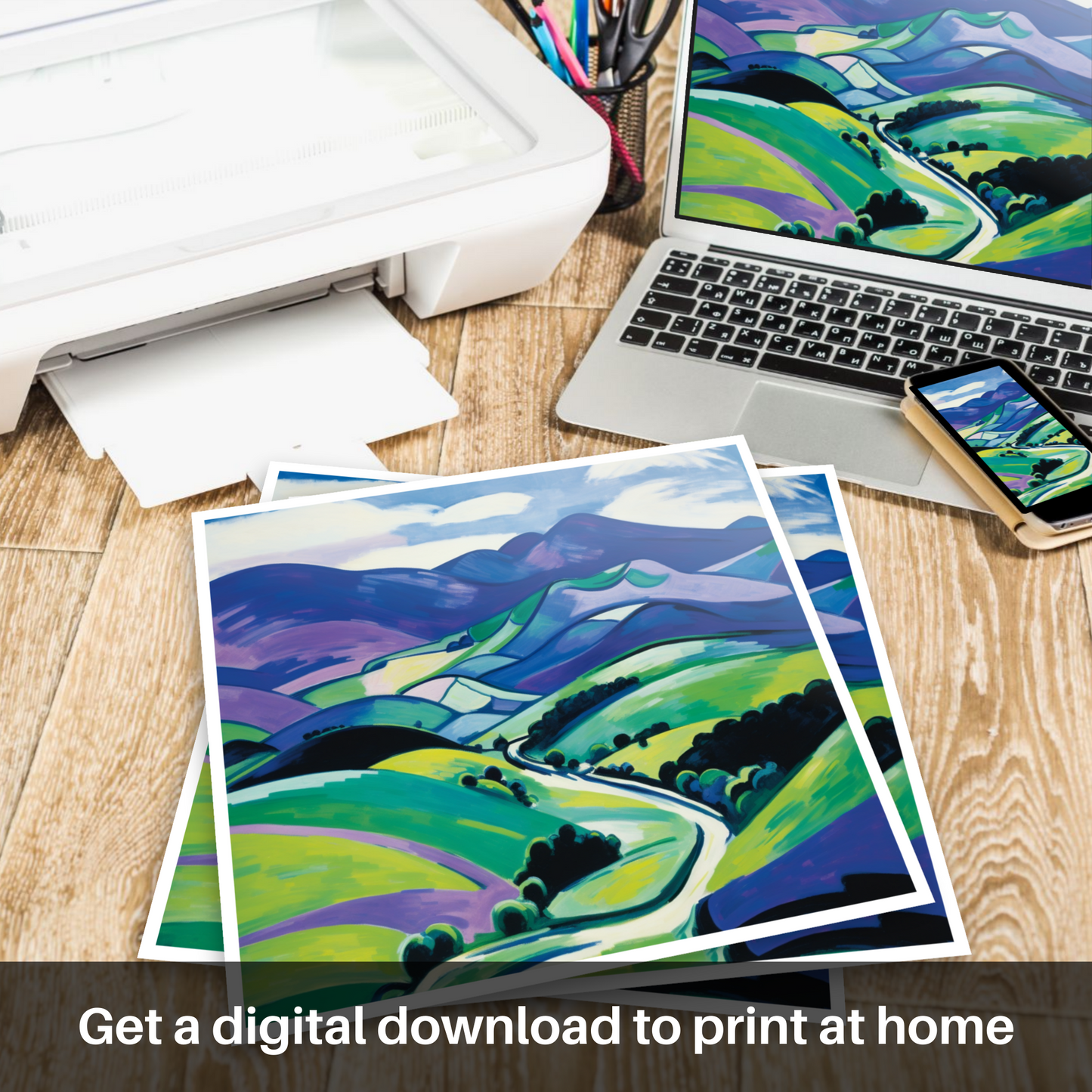 Embrace the undulating contours of the landscape, captured in an exuberant palette that brings to life the rugged terrain. Note how the rolling hills are drenched in bold purples and blues, an ode to the shadows that play across their surfaces at different times of the day. Visual contrasts are palpable, as cooler tones in the distance juxtapose with the warm, sun-kissed greens and yellows that paint the foreground in a luscious light.