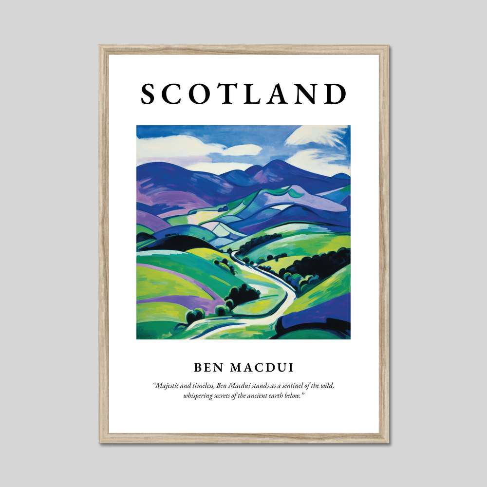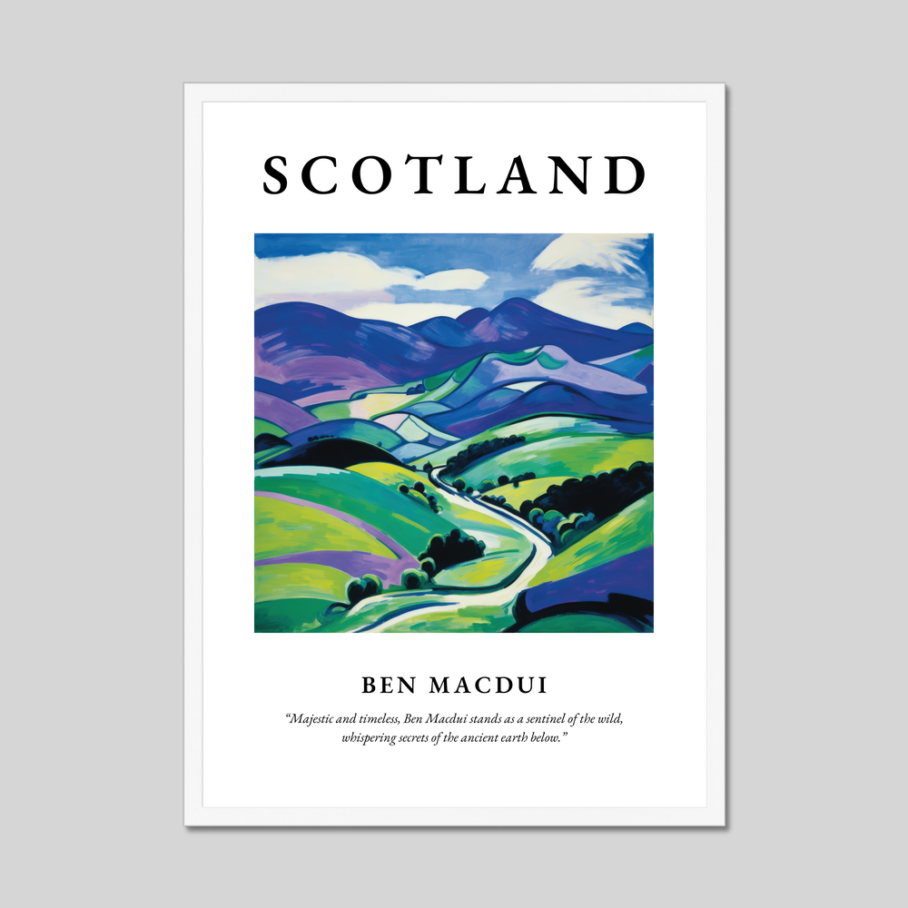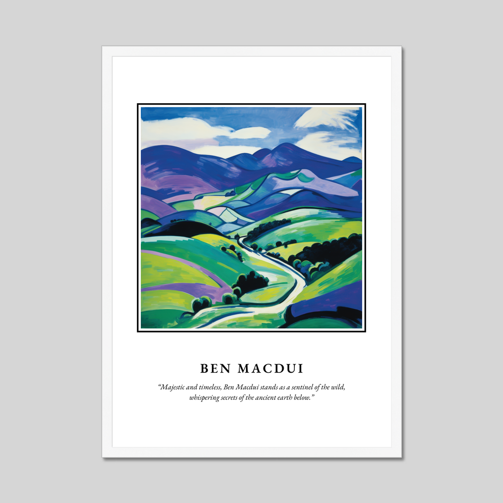 Beneath the captivating artwork, the quote "Majestic and timeless, Ben Macdui stands as a sentinel of the wild, whispering secrets of the ancient earth below," adds a poetic touch, celebrating the profound allure of this legendary mountain. The poster is an ideal gift for anyone with a passion for Scotland, a love of landscape art, or an appreciation for the striking Fauvism style.